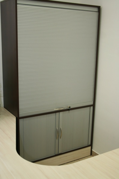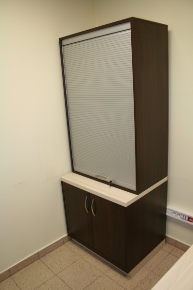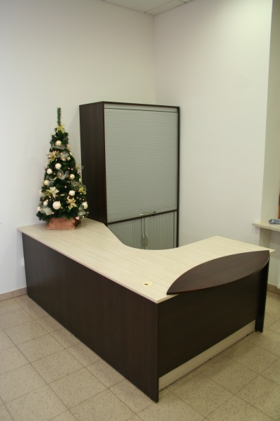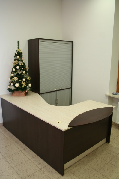 Wyposażenie w meble biurowe placówki banku. Stanowiska pracownicze jak i zarówno do obsługi klienta. Meble wykonane z płyty meblowej w kolorze Kasztan Wenge R4121 oraz Dąb Mleczny R4120. W szafach aktowych zastosowano żaluzje w kolorze aluminium firmy Rehau w układzie pionowym i poziomym.