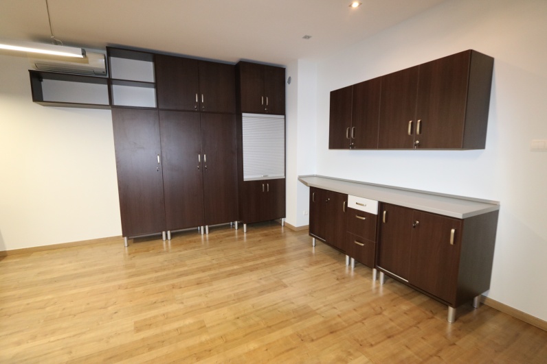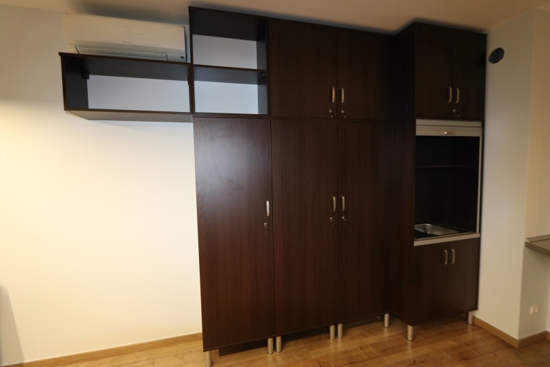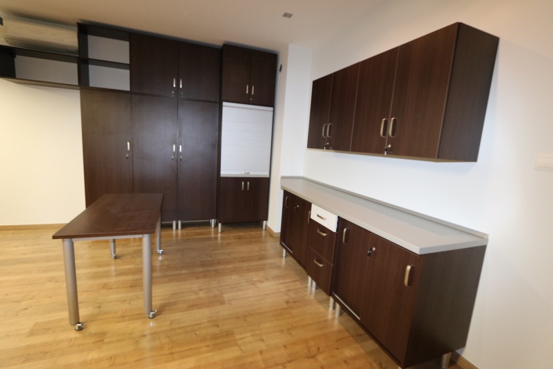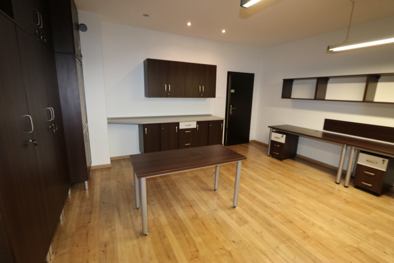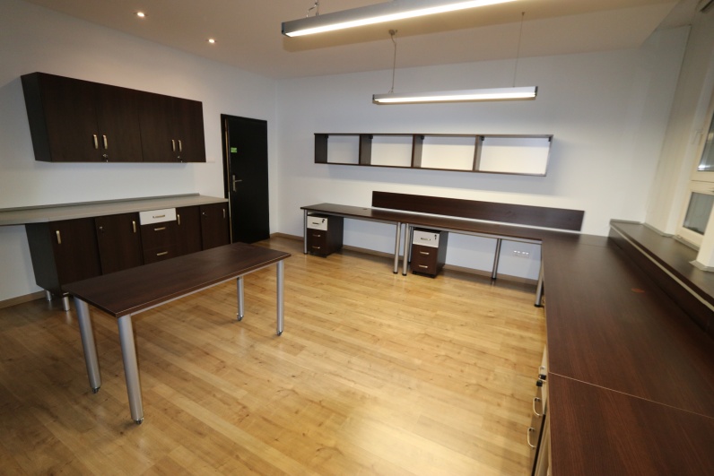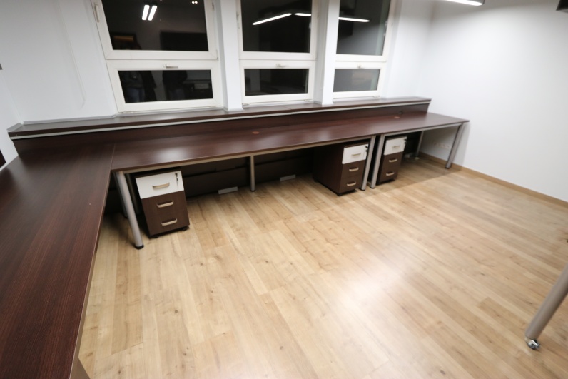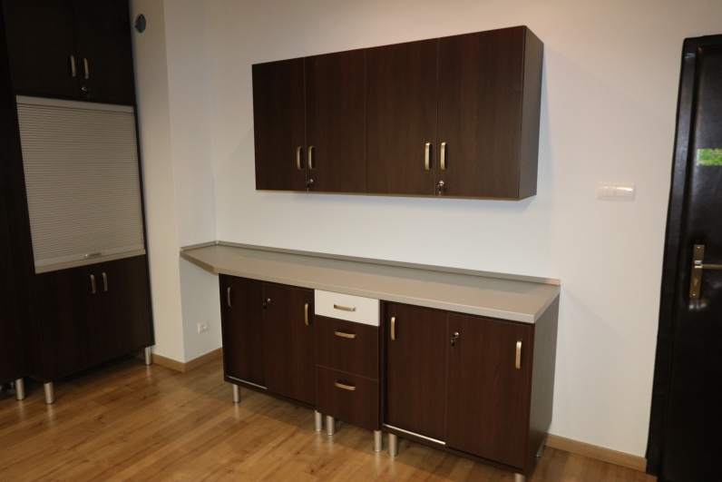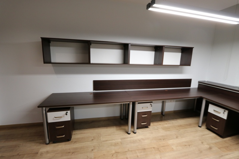 Meble biurowe, wykonane z płyty meblowej Kasztan Wenge w połaczeniu z Szarym. Zestaw zawiera biurka na stelażu metalowym wraz z kontenerkami, aneks kuchenny oraz szafy, w tym szafę gospodarczą z roletą. Dodatkowo stolik pomocniczy na kółkach.
