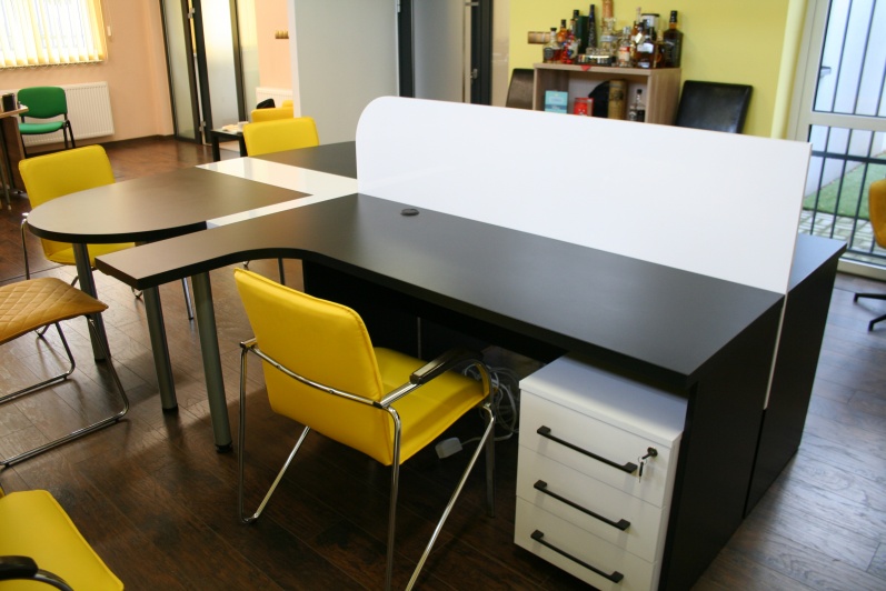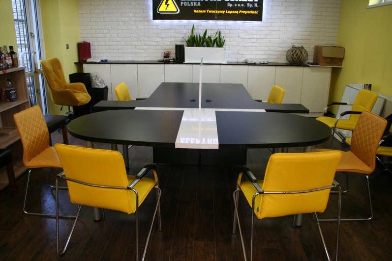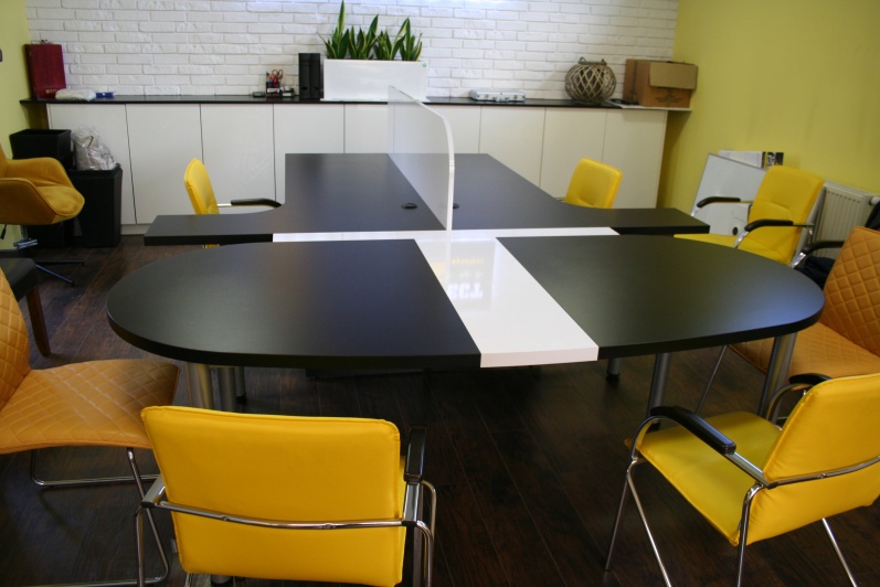Zestaw biurek w połączeniu z dostawką konferencyjną. Płyta meblowa czarna oraz biała w połysku.