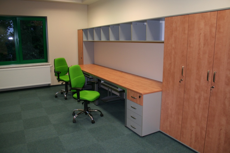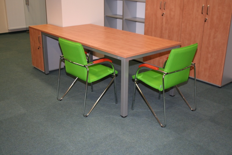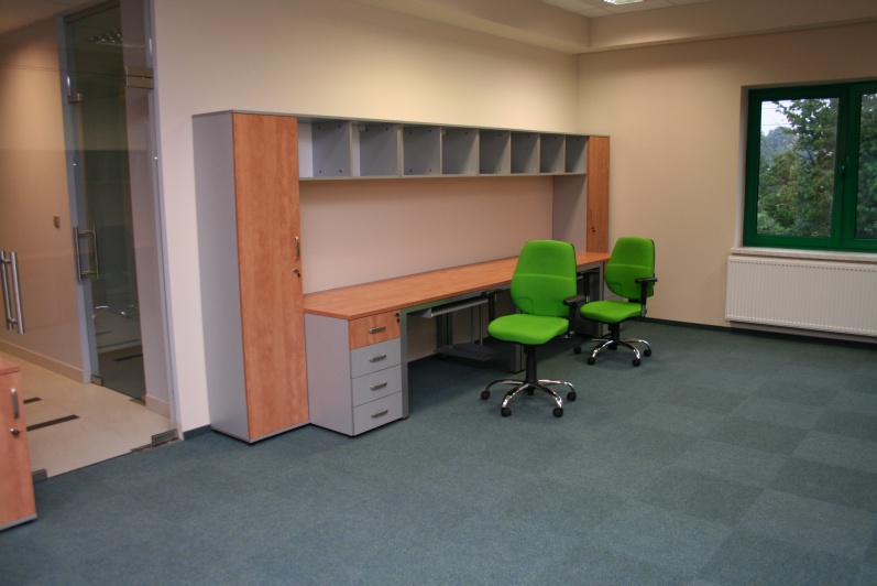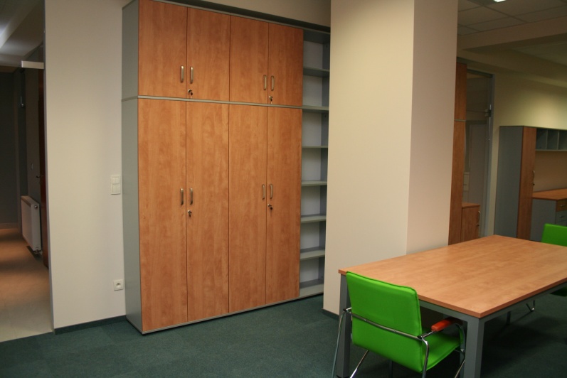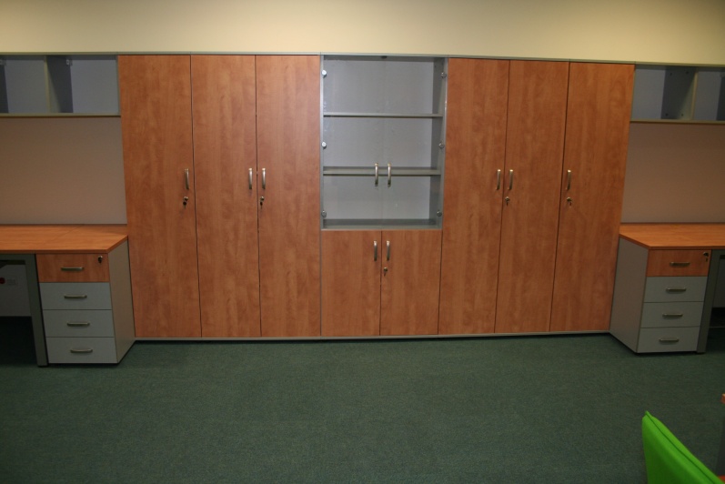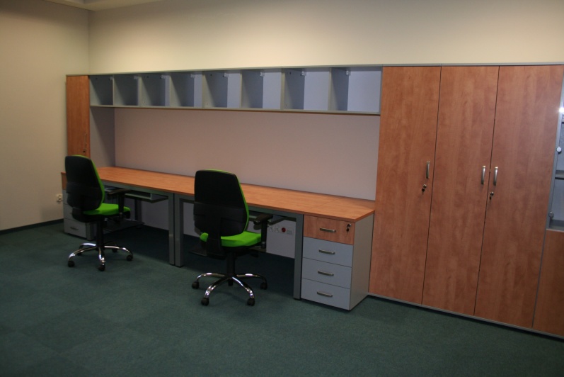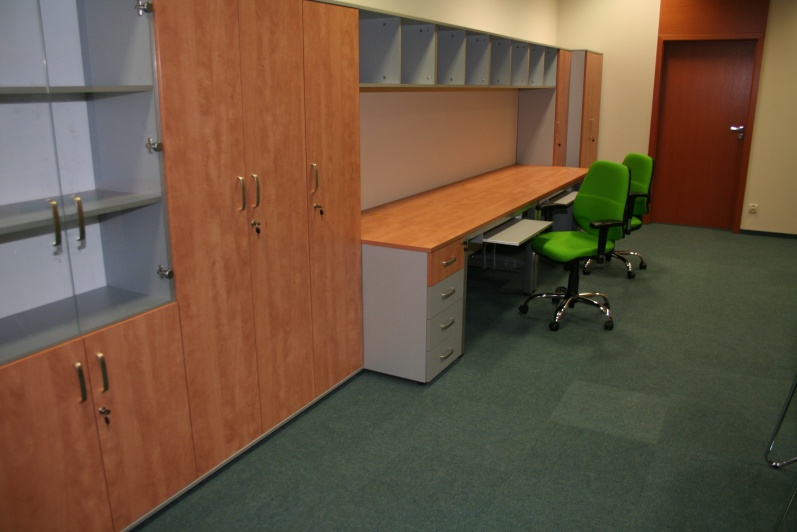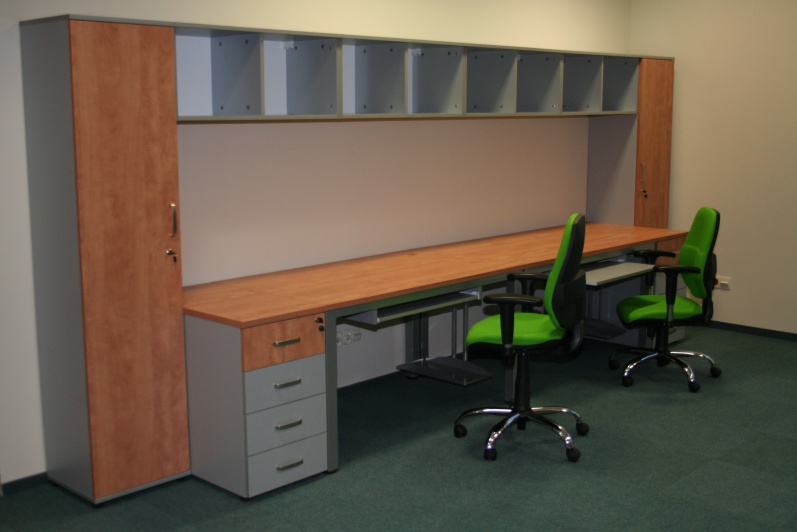 Zestaw mebli biurowych wykonanych w kolorze Grusza Dzika R 4965 w połączeniu z kolorem Szary U 2101. Meble zawierają stabilne biurka na stelażach metalowych, niewielki stół również na stelażu metalowym oraz szafy aktowe z frontami pełnymi oraz ze szkłem przeziernym.