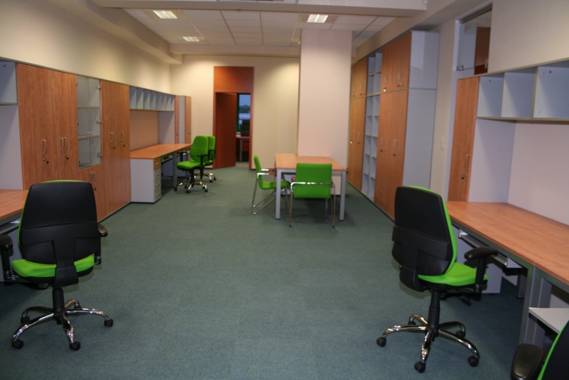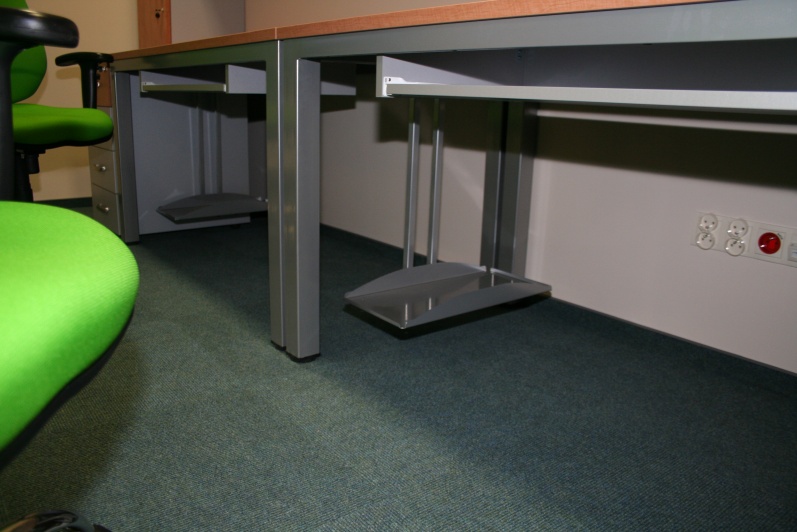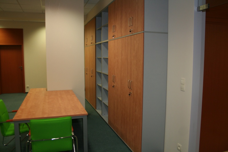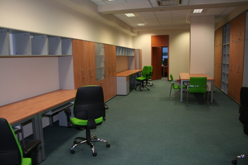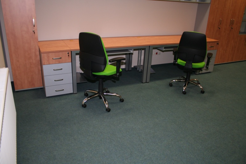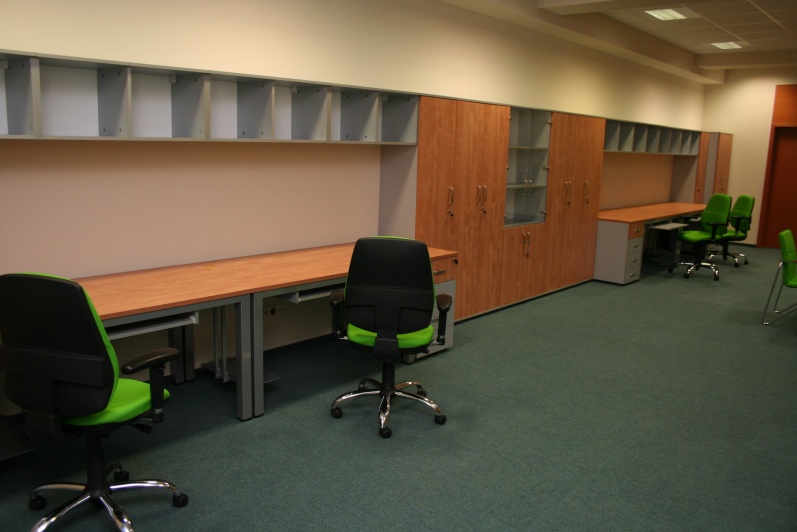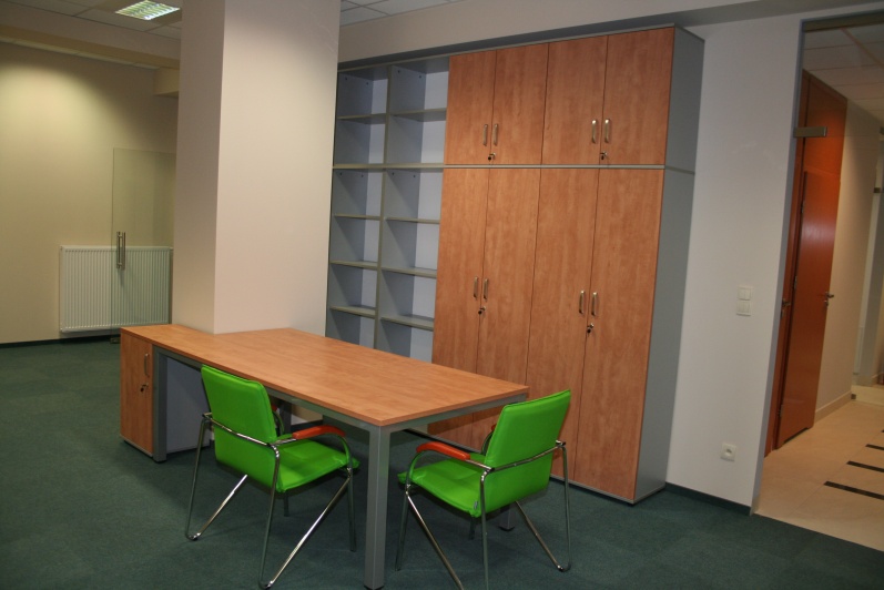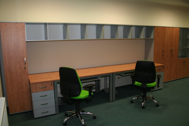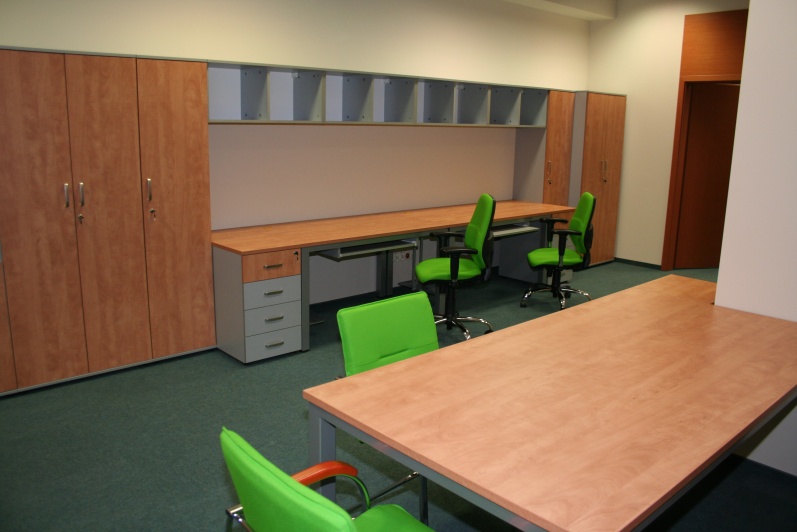 Zestaw mebli biurowych wykonanych w kolorze Grusza Dzika R 4965 w połączeniu z kolorem Szary U 2101. Meble zawierają stabilne biurka na stelażach metalowych, niewielki stół również na stelażu metalowym oraz szafy aktowe z frontami pełnymi oraz ze szkłem przeziernym.