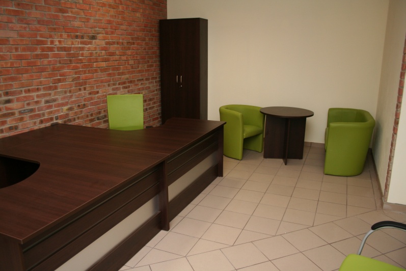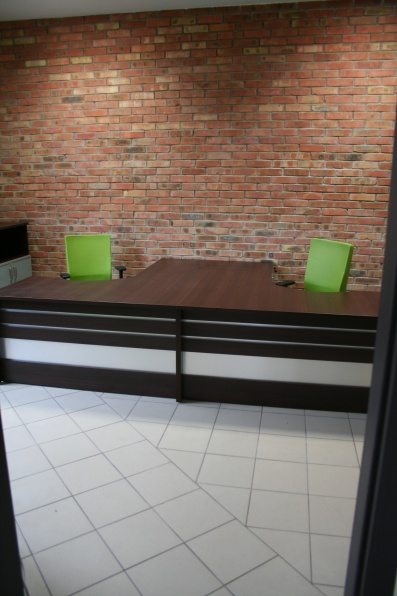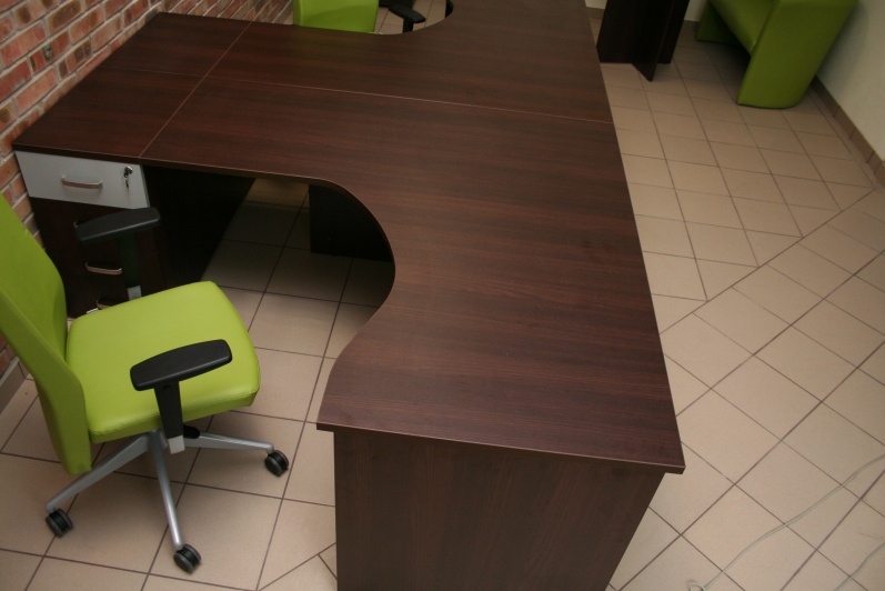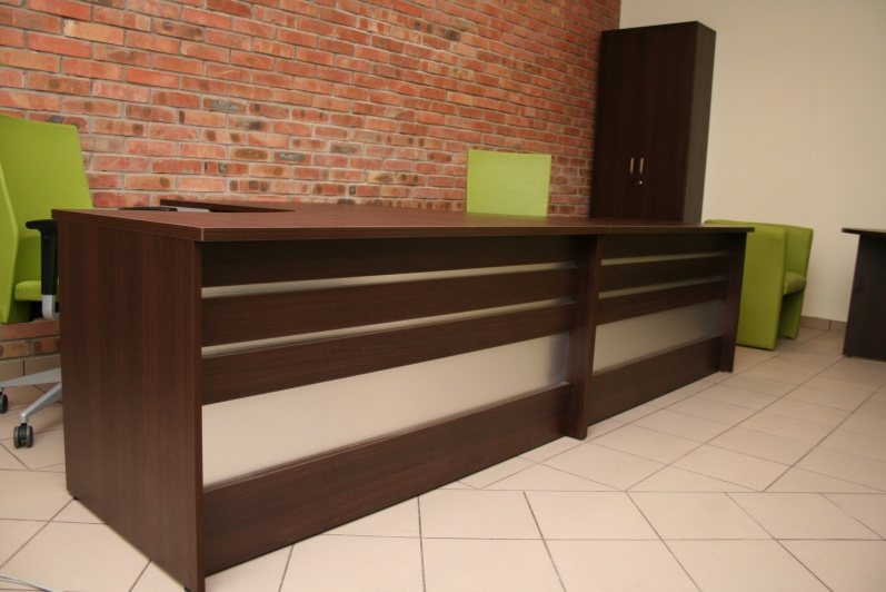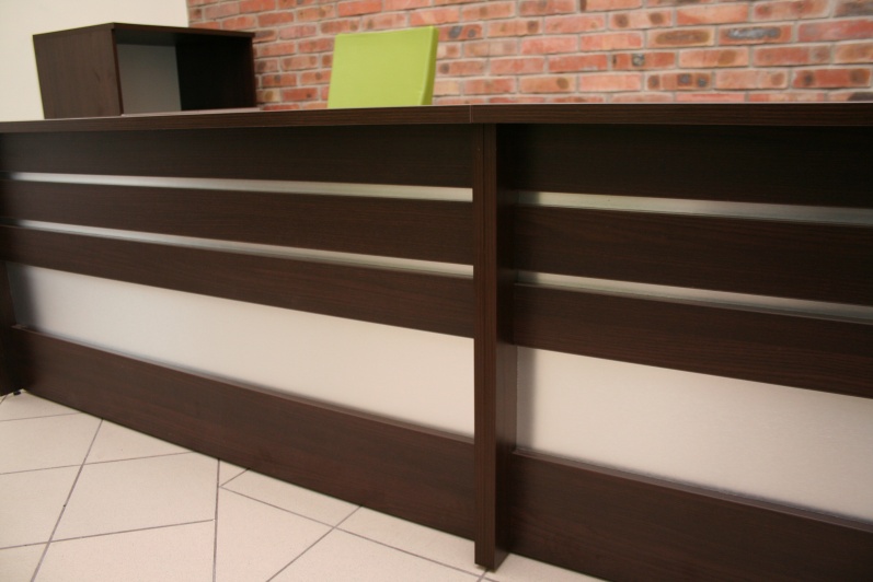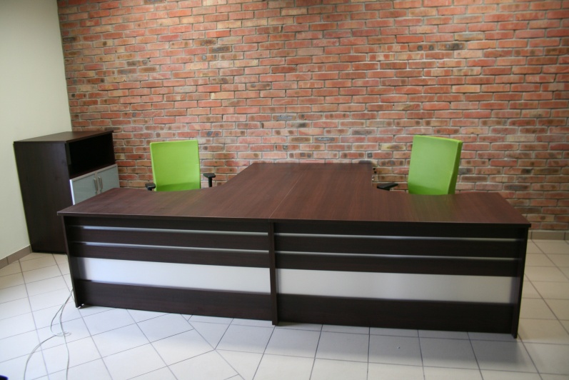 Zestaw dwóch biurek z boniowanym panelem przednim. Boniowanie o różnej wysokości wypełnione laminatem w kolorze stali szczotkowanej. Całość wykonana z Kasztanu Wenge.