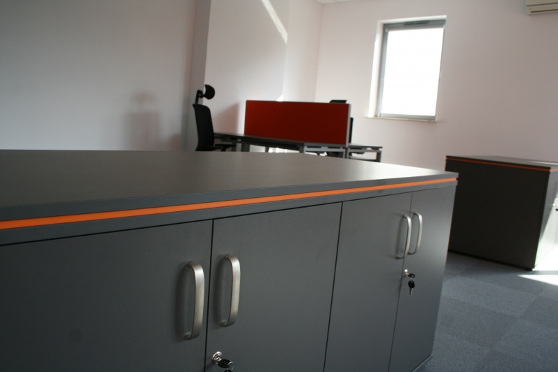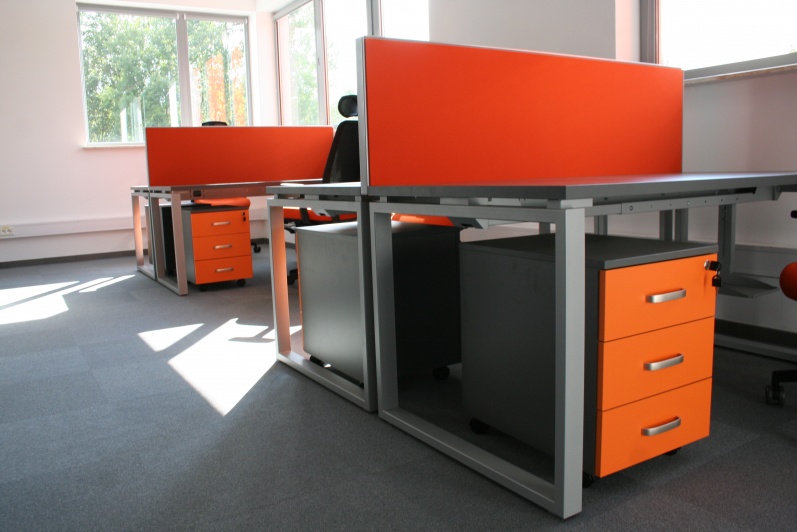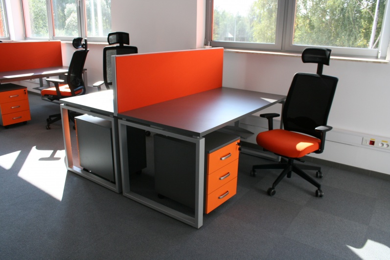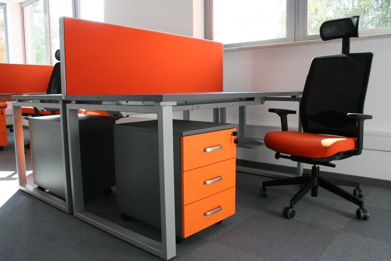 Meble biurowe do sali operacyjnej. Biurka na stelażach metalowych Mila Design, ścianki działowe tapicerowane. Fotele obrotowe Profim.