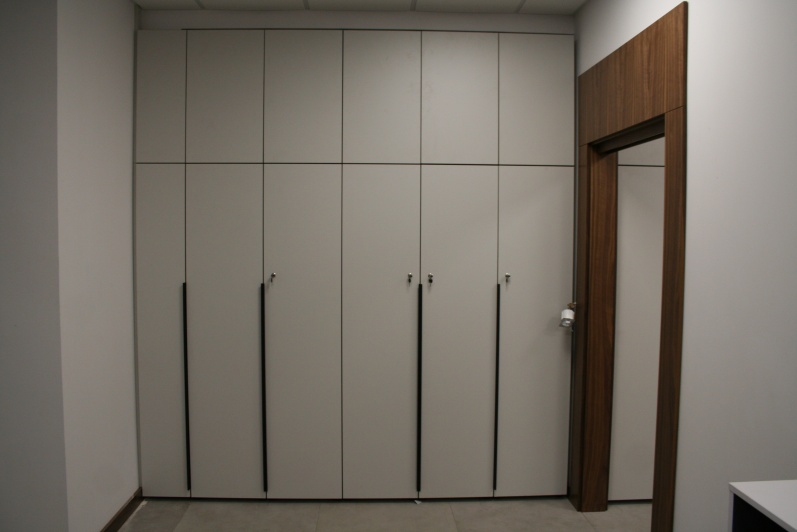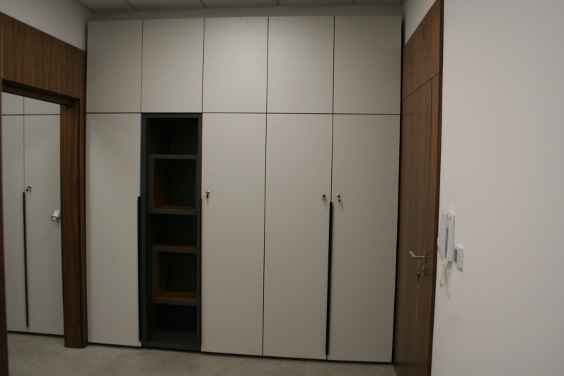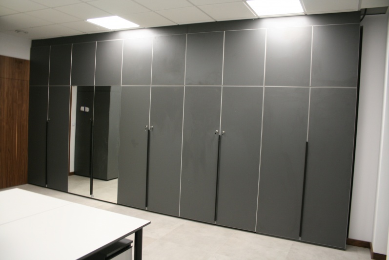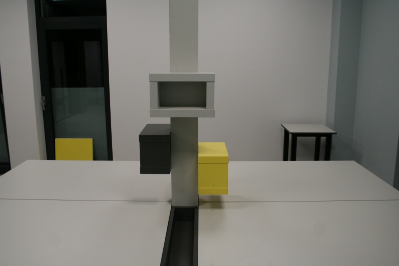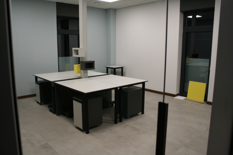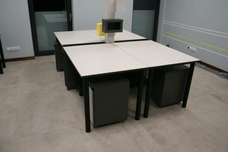 Zestaw mebli biurowych, biurka na stelażach metalowych w kolorze czarnym.