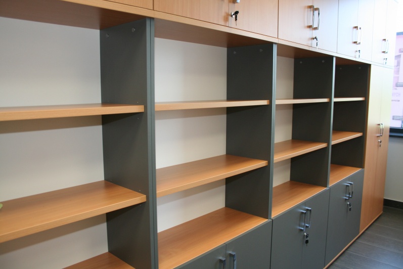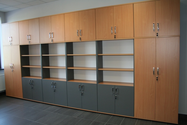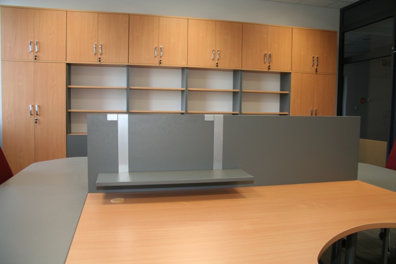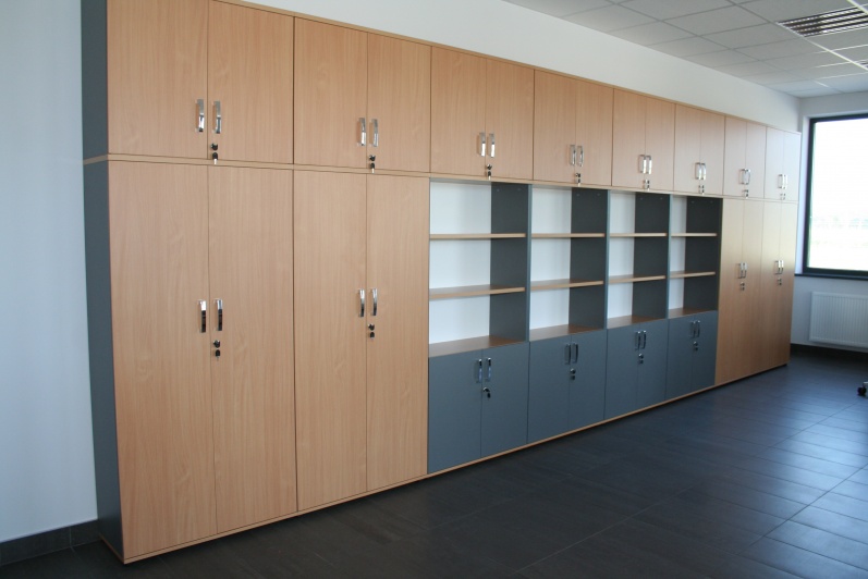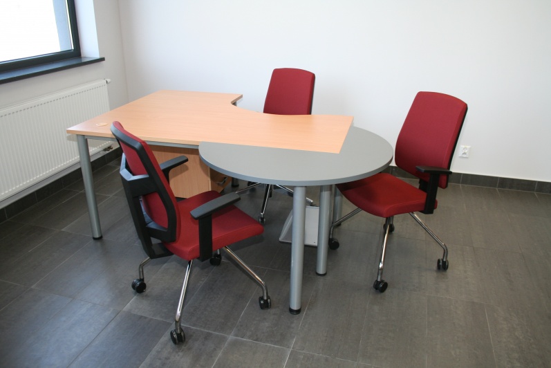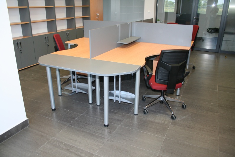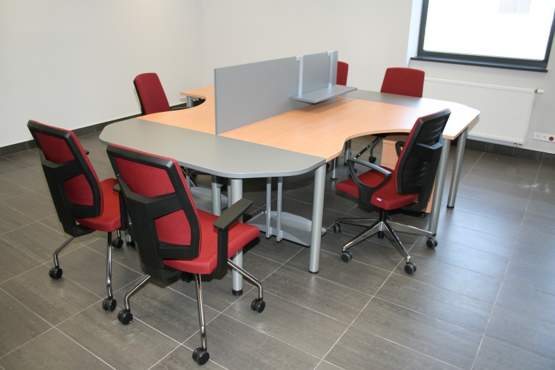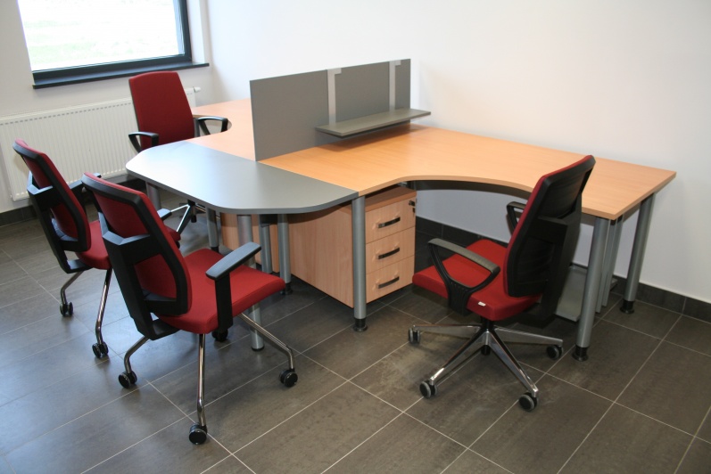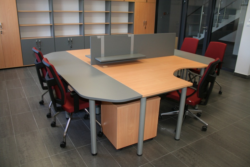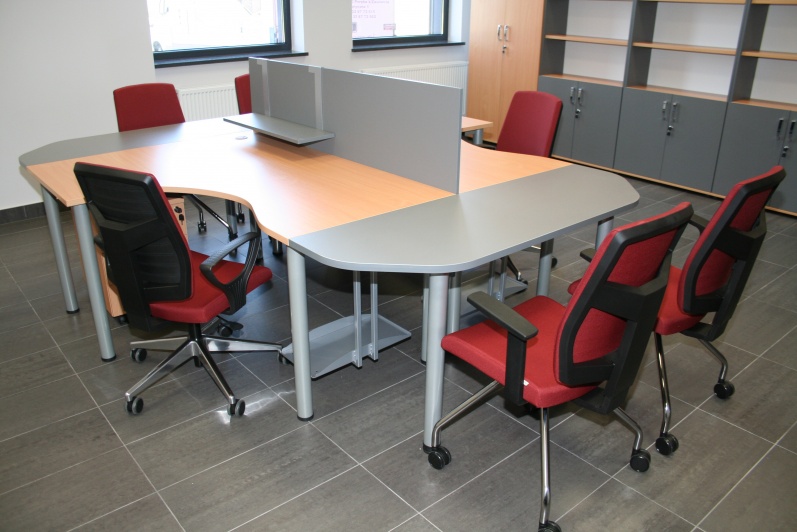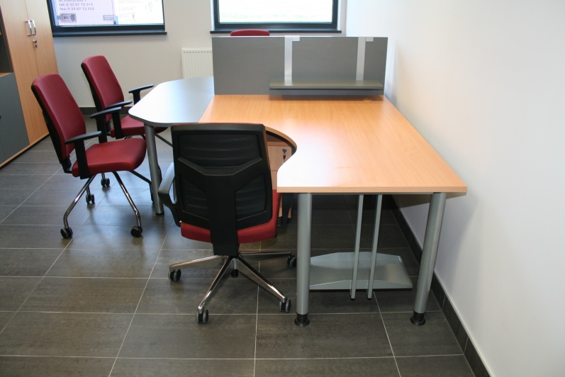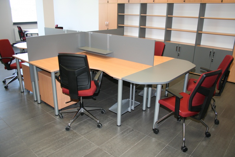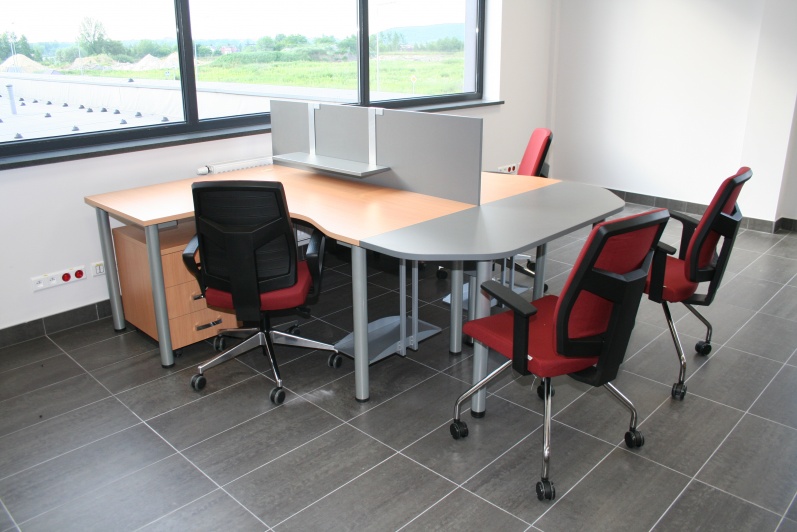 Meble biurowe wykonane w połączeniu dwóch dekorów - Buku Bawaria oraz Antracytu. Biurka na stelażach metalowych, ścianki działowe pomiędzy biurkami. Krzesła dla Klientów oraz fotele pracownicze model Raya firmy Profim.