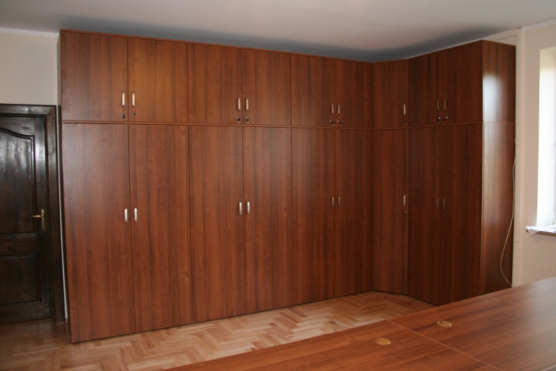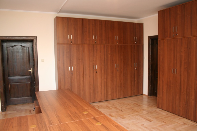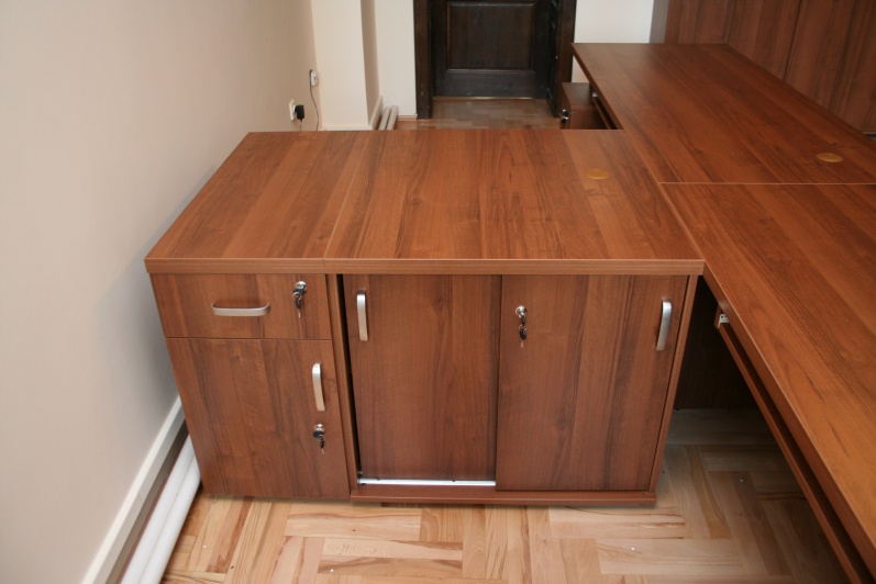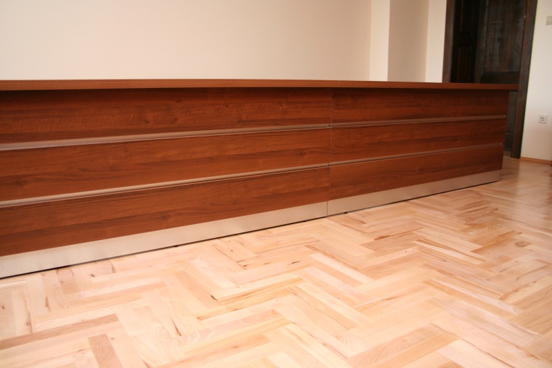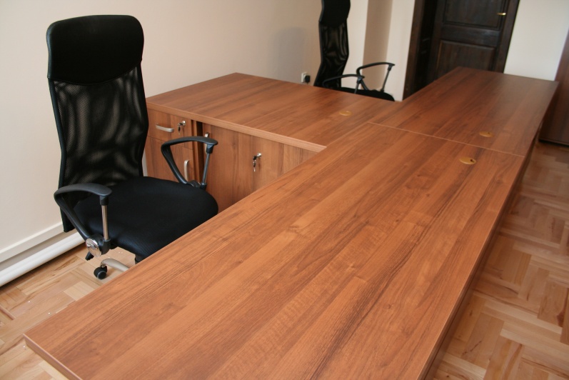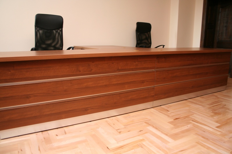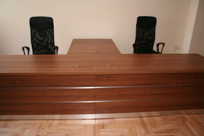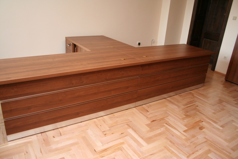 Meble wykonane w płycie meblowej w kolorze Orzech R 4853. Biurka z blendami do podłogi oraz zastosowanym boniowaniem. Przerwy w boniowaniu wyklejone laminatem HPL w kolorze stali szczotkowanej. W zestawie szafy aktowe oraz obudowy sejfów.