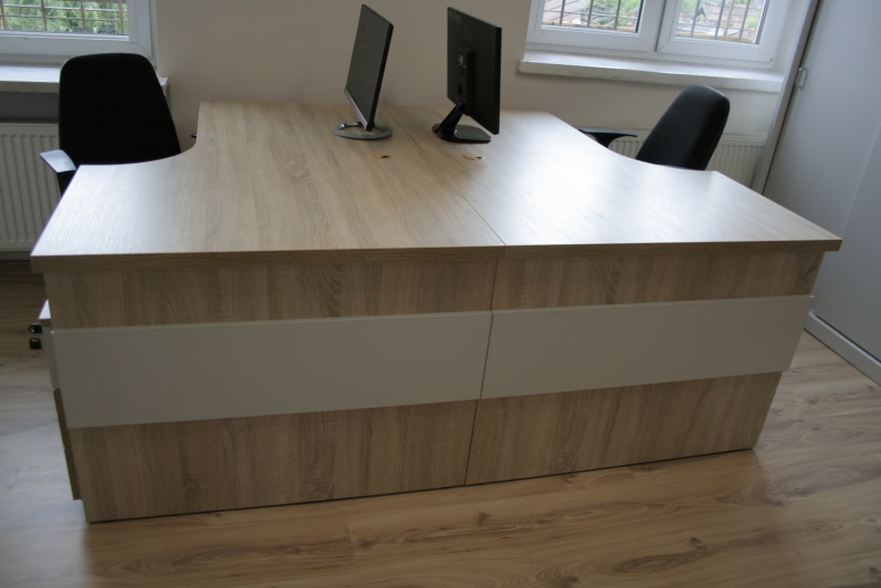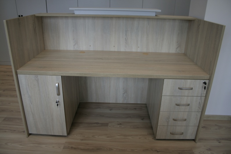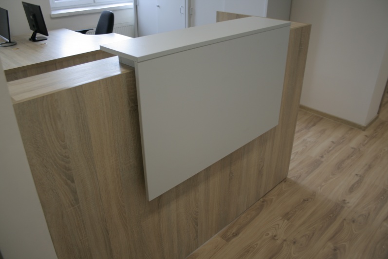 Meble biurowe wraz niewielką ladą recepcyjną w kolorach - Dąb Sonoma z elemenetami Szarego.