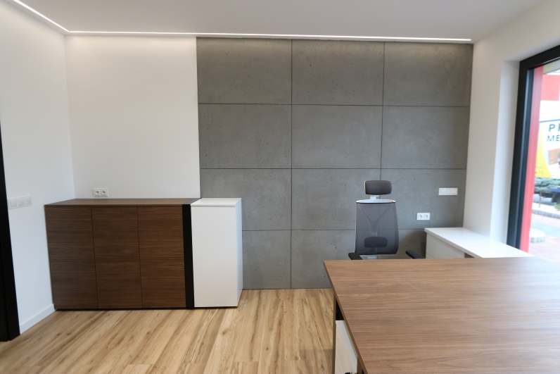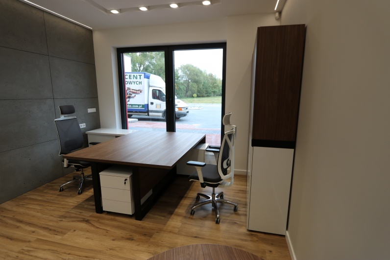 Meble gabinetowe wykonane z płyty meblowej drewnopodobnej w połączeniu z połyskiem. Wstawki z elementów metalowych. Nogi w biurkach i w stoiku metalowe malowane na czarno.