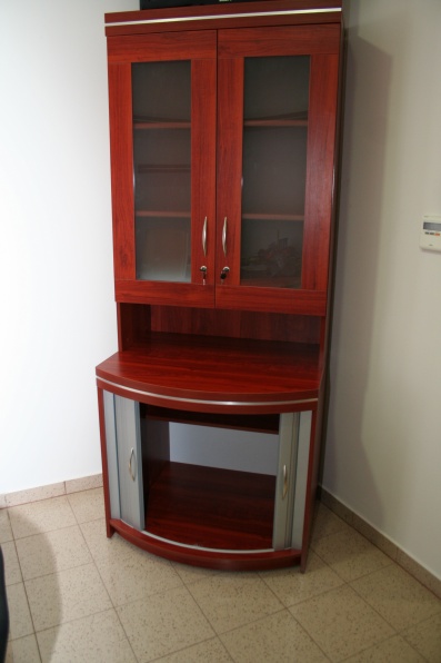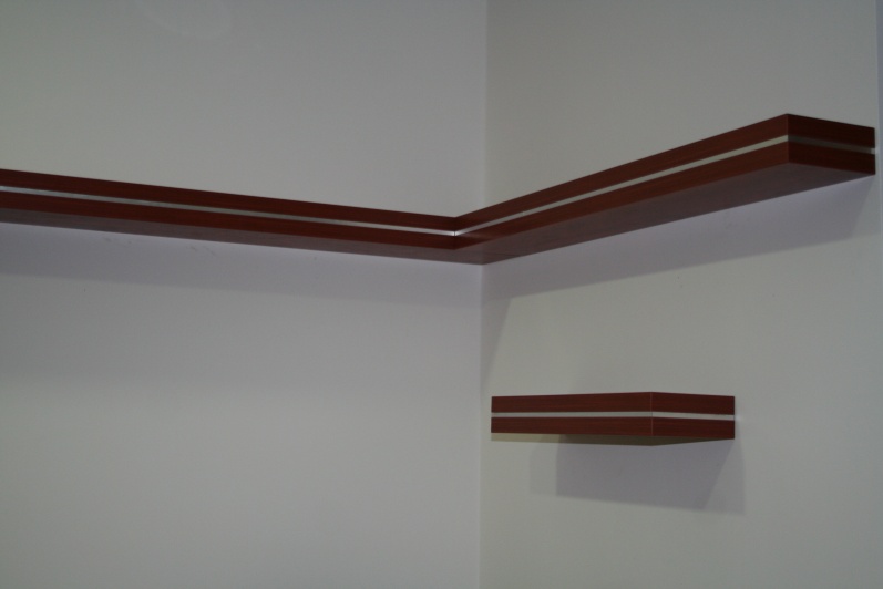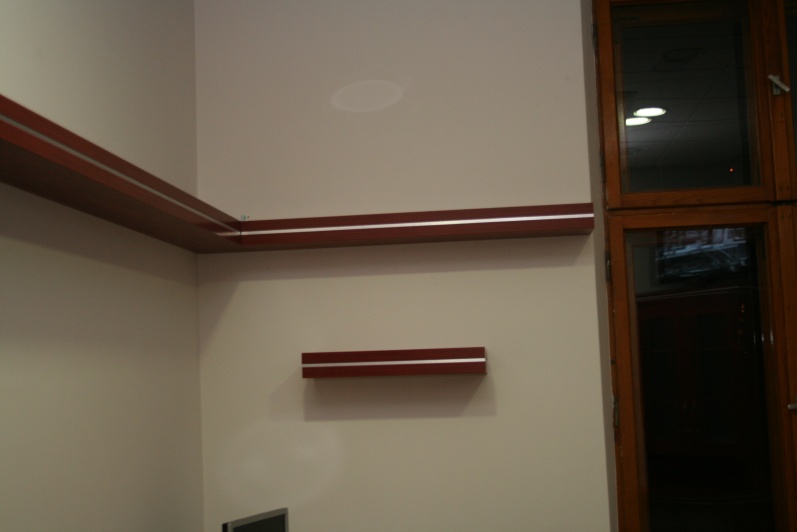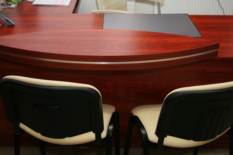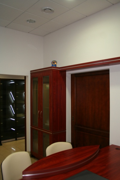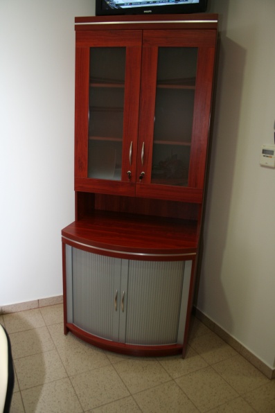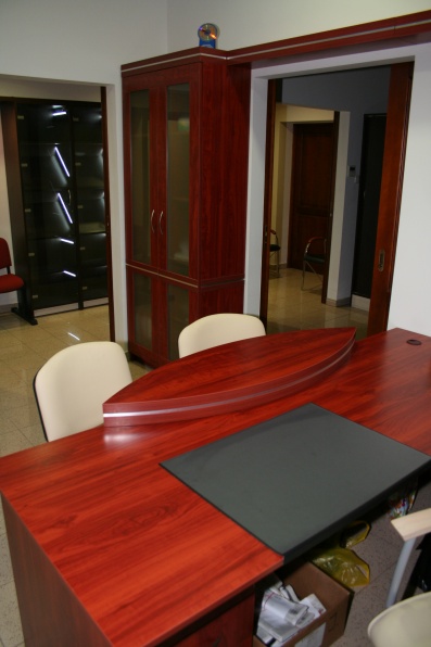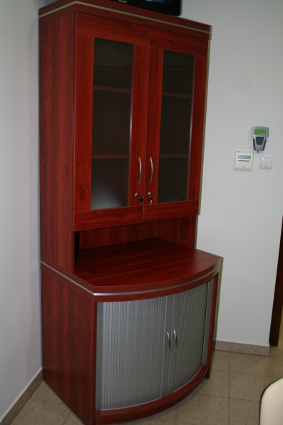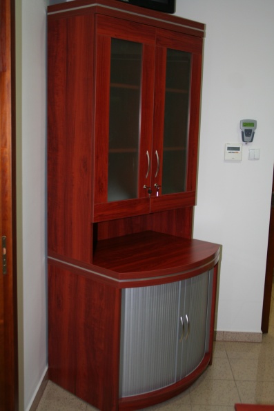 Zestaw mebli gabinetowych z wykorzystaniem blatów trójwarstwowych 'sandwich' z widocznym boniowaniem. Meble wykonane z płyty meblowej w kolorze Wisnia Pensylwania R5738. W zestawie wykorzystano zarówno witryny jak i żaluzje aluminiowe.