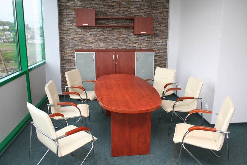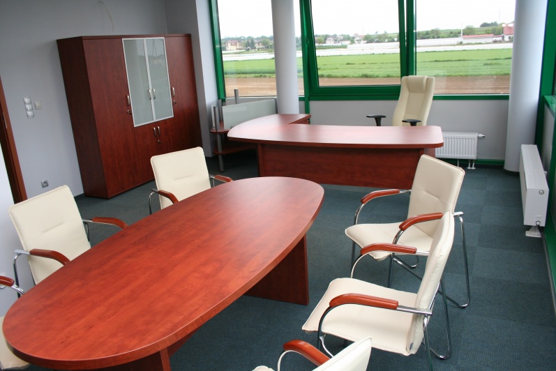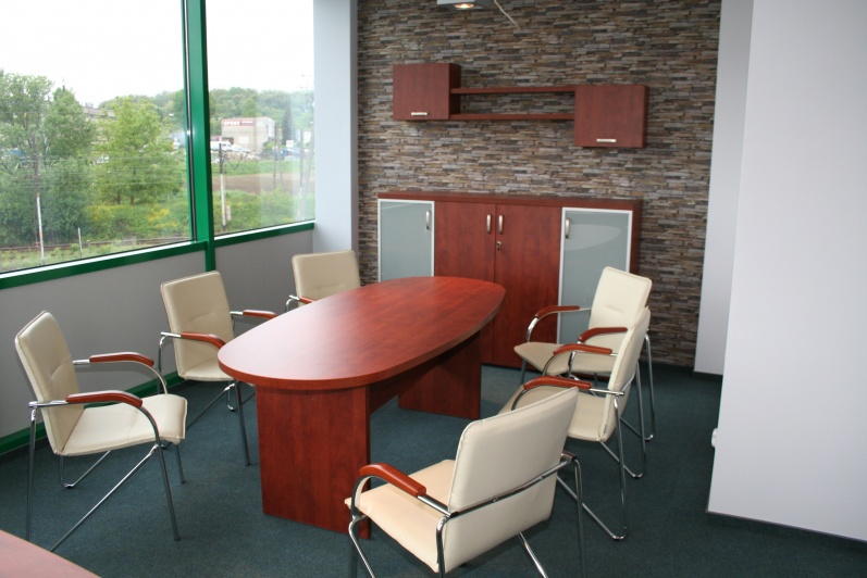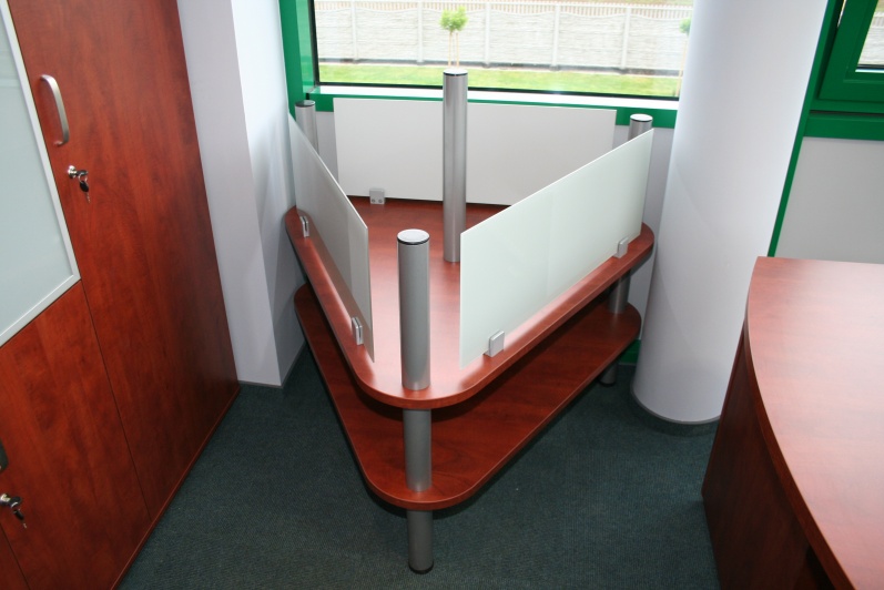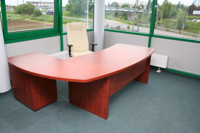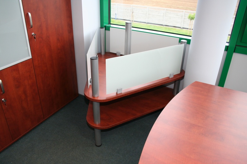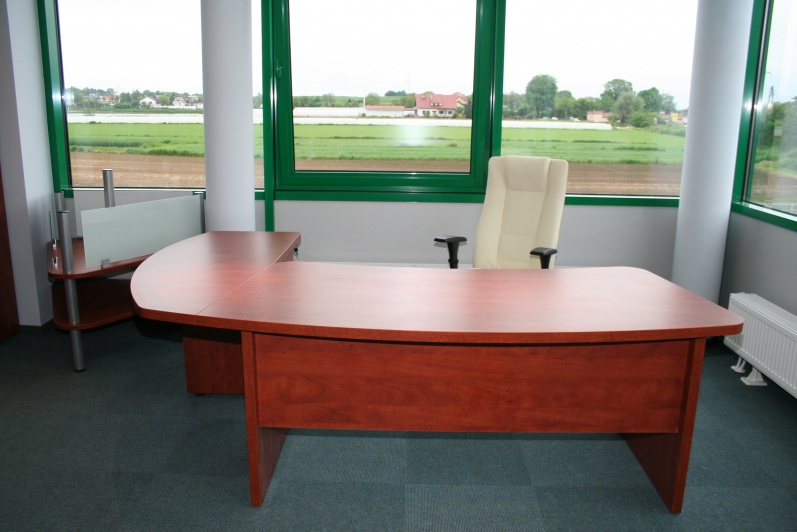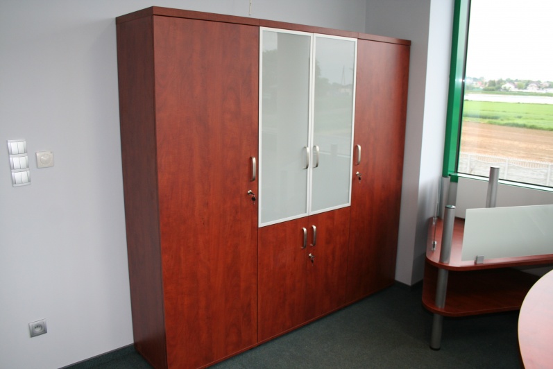 Meble gabinetowe wykonane w wybarwieniu Grusza Dzika R 4967. W skład zestawu mebli wchodzą duże biurko kształtowe z dostawką, szafki aktowe, kwietnik oraz niewielki stół konferencyjny na stelażu płytowym. We frontach meblowych zastosowano częściowo fronty z szyby mlecznej Lakomat w ramkach aluminiowych.