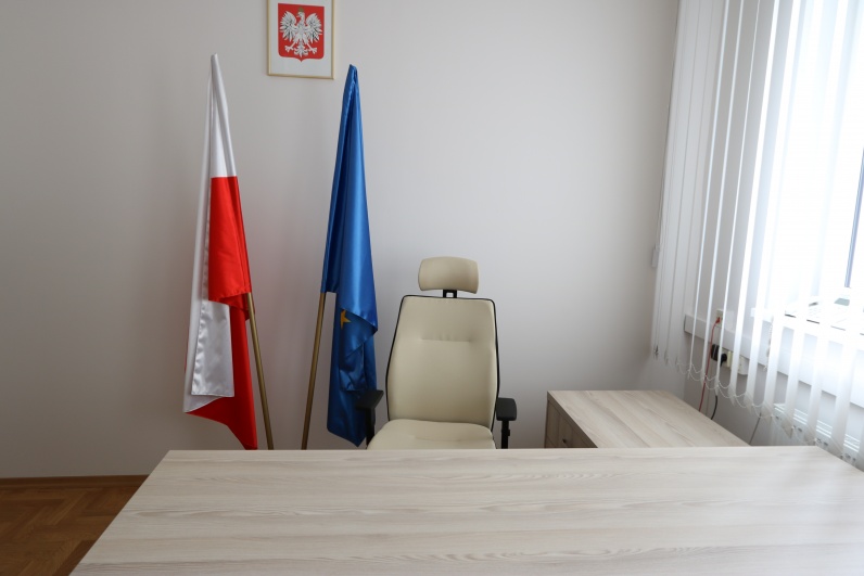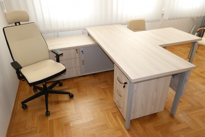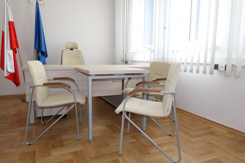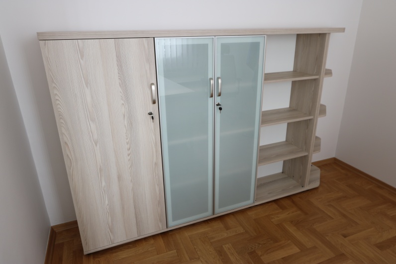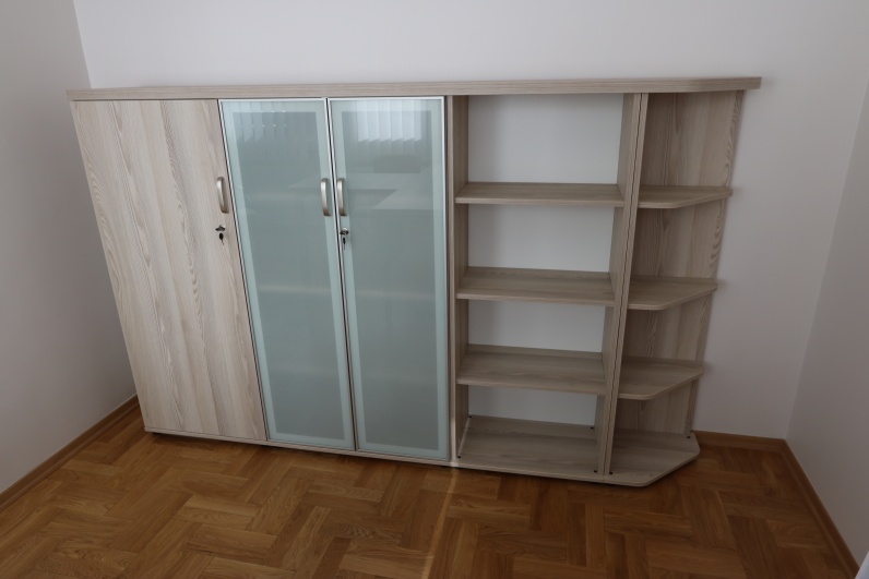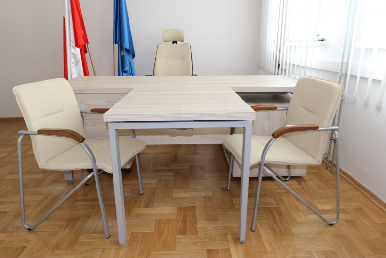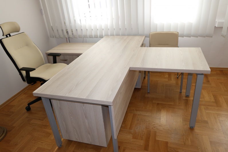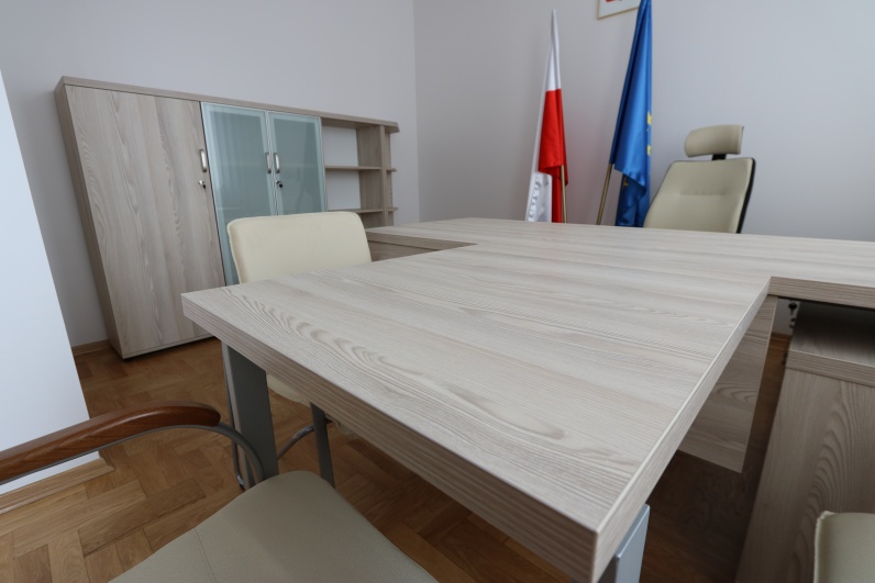 Gabinet Burmistrza, wykonany z płyty meblowej Egger - Jesion Navarra. Stelaż metalowy, szafki aktowe ze szkłem mlecznym w ramkach aluminiowych.
