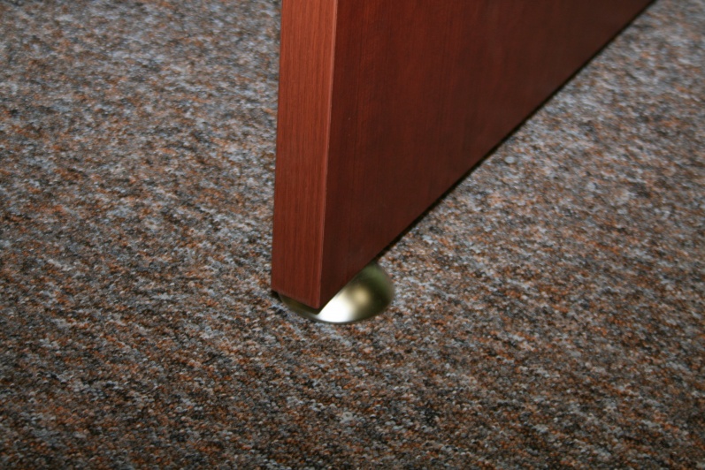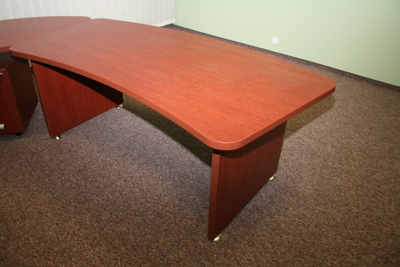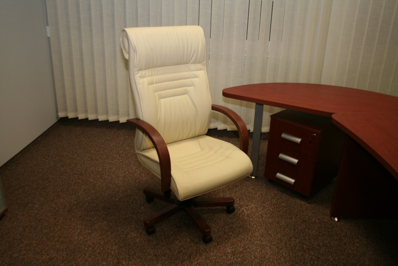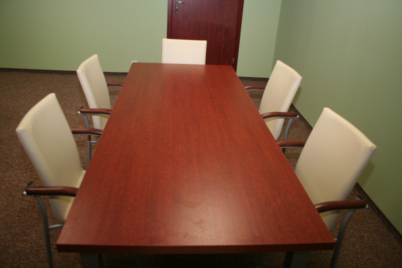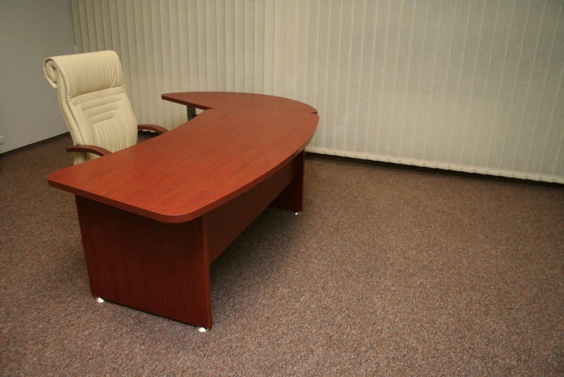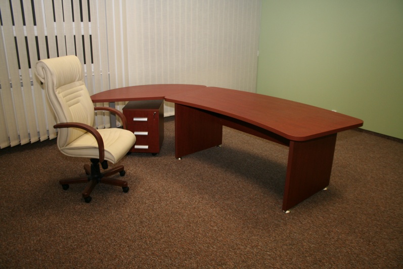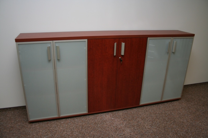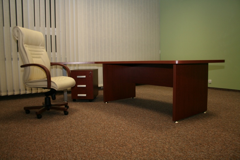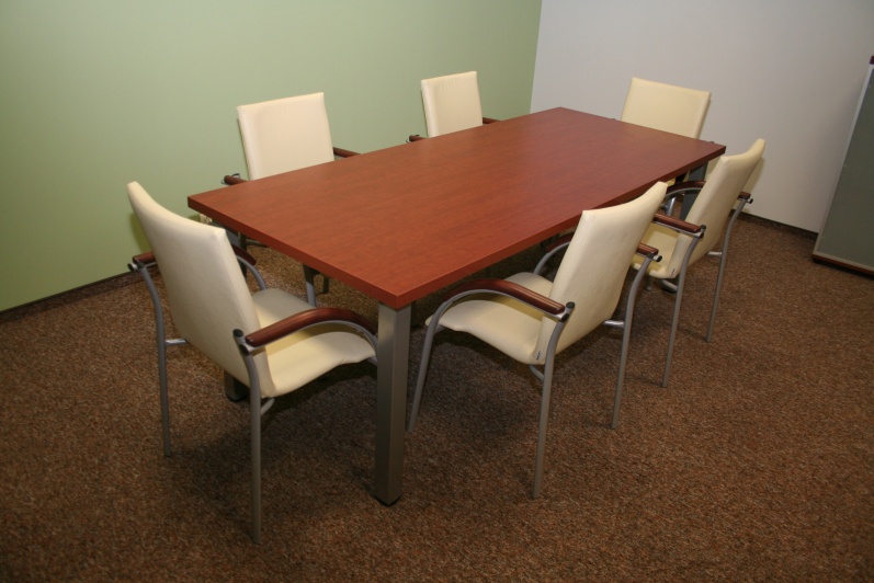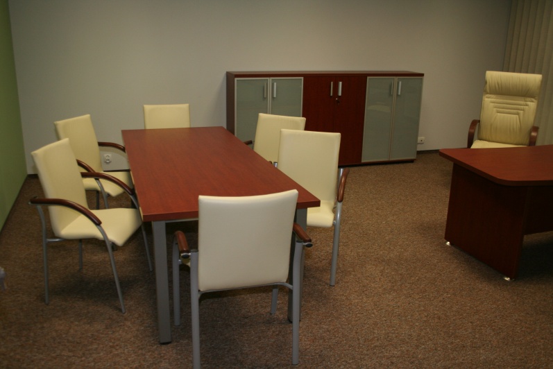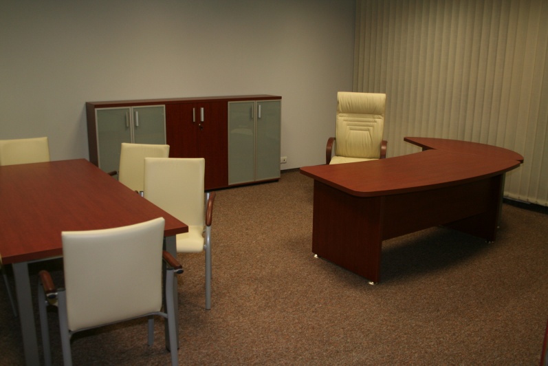 Zestaw mebli gabinetowych wraz z niewielkim stołem konferencyjnym na stelażu metalowym. Biurko z kolekcji Master z dostawką podpartą nogą metalową w kolorze Ral 9006. Do kompletu jest dodana komoda z frontami pełnymi oraz wypełnionymi szkłem mlecznym Decormat w ramkach aluminiowych. Do zestawu mebli zaproponowano krzesła konferencyjne oraz fotel obrotowy z oferty firmy Profim w skórze ekologicznej Softline. Kolorystyka mebli: Wiśnia Pensylwania R5738.