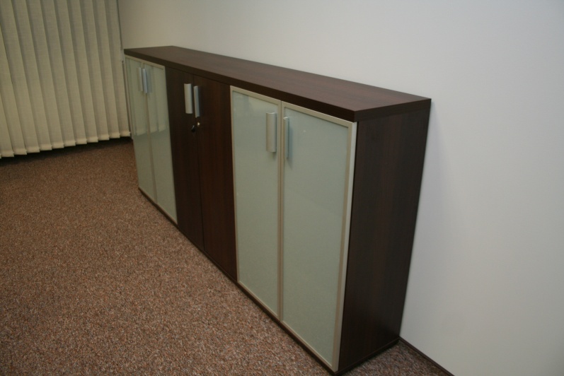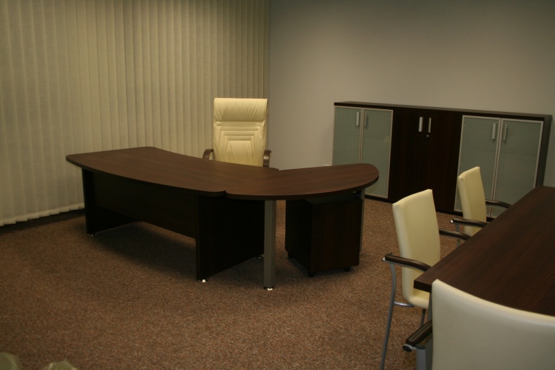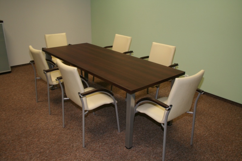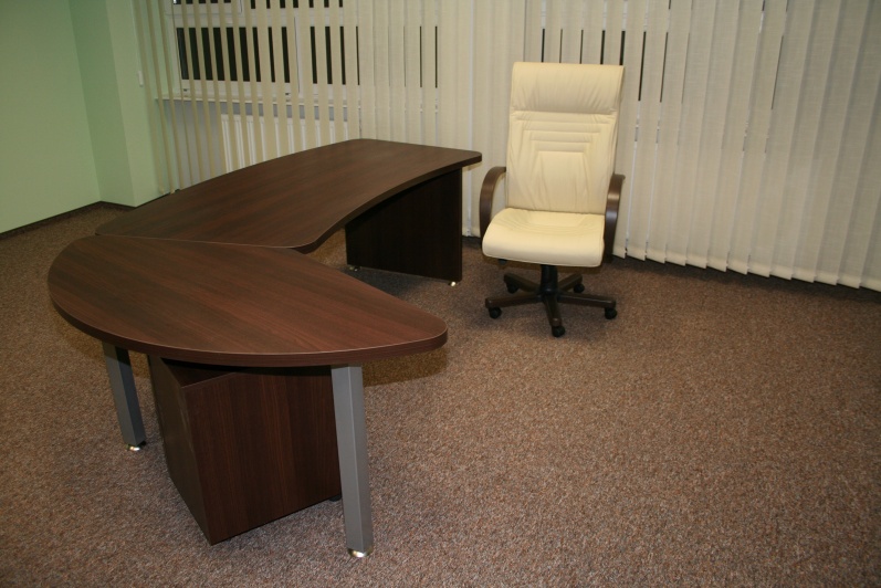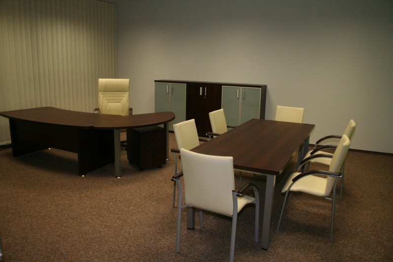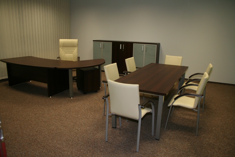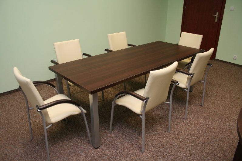 Zestaw mebli gabinetowych wraz z niewielkim stołem konferencyjnym na stelażu metalowym. Biurko z kolekcji Master z dostawką podpartą nogą metalową w kolorze Ral 9006. Do kompletu jest dodana komoda z frontami pełnymi oraz wypełnionymi szkłem mlecznym Decormat w ramkach aluminiowych. Do zestawu mebli zaproponowano krzesła konferencyjne oraz fotel obrotowy z oferty firmy Profim w skórze ekologicznej Softline. Kolorystyka mebli: Sherwood Mocca R 3141.