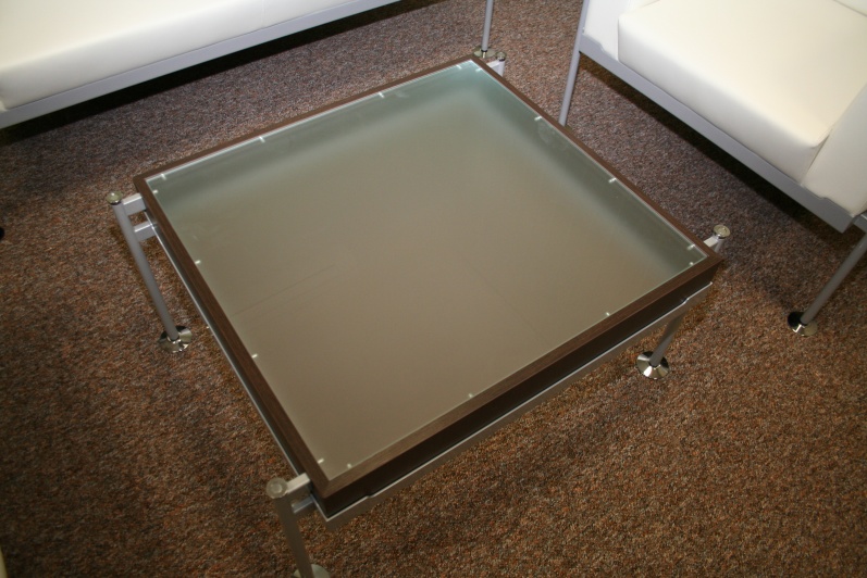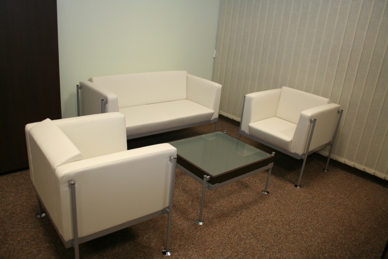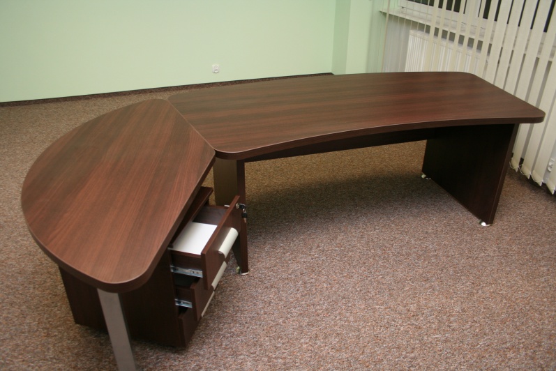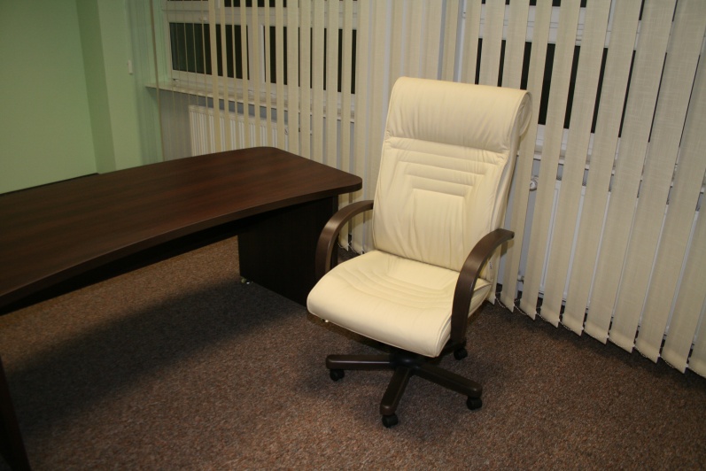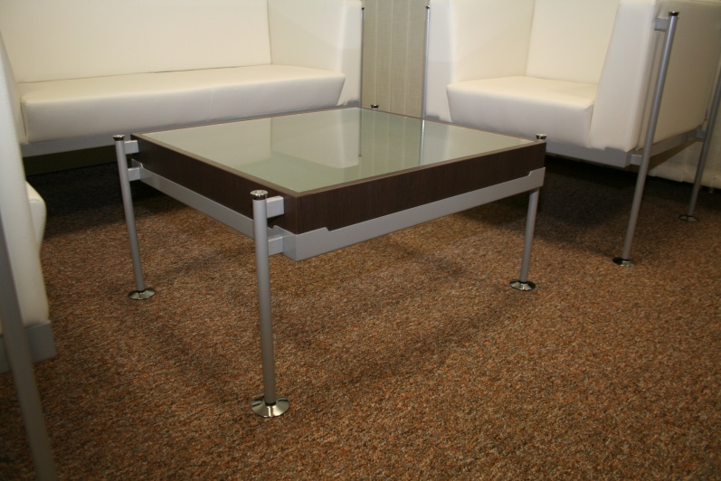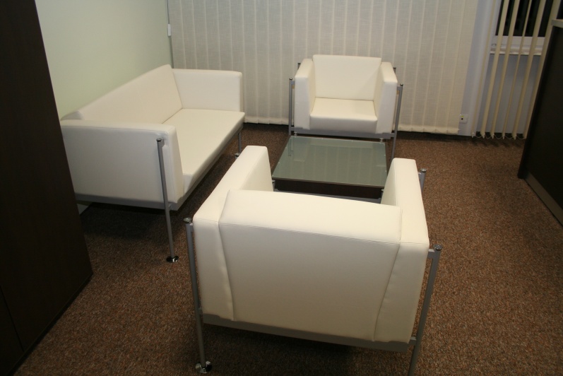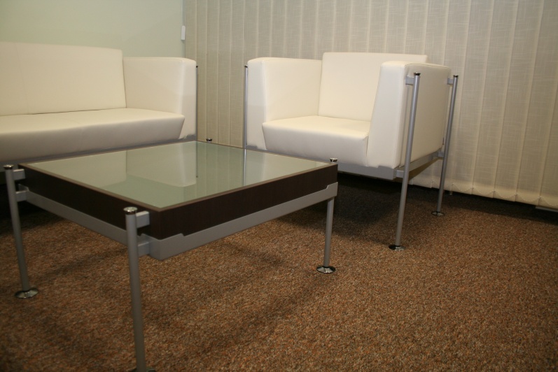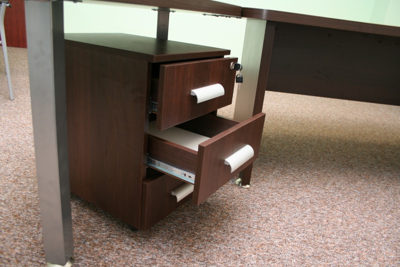 Zestaw mebli gabinetowych wraz z niewielkim stołem konferencyjnym na stelażu metalowym. Biurko z kolekcji Master z dostawką podpartą nogą metalową w kolorze Ral 9006. Do kompletu jest dodana komoda z frontami pełnymi oraz wypełnionymi szkłem mlecznym Decormat w ramkach aluminiowych. Do zestawu mebli zaproponowano krzesła konferencyjne oraz fotel obrotowy z oferty firmy Profim w skórze ekologicznej Softline. Kolorystyka mebli: Sherwood Mocca R 3141.