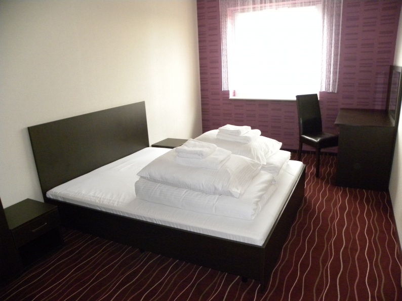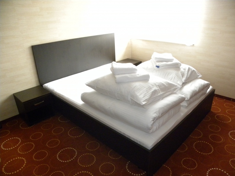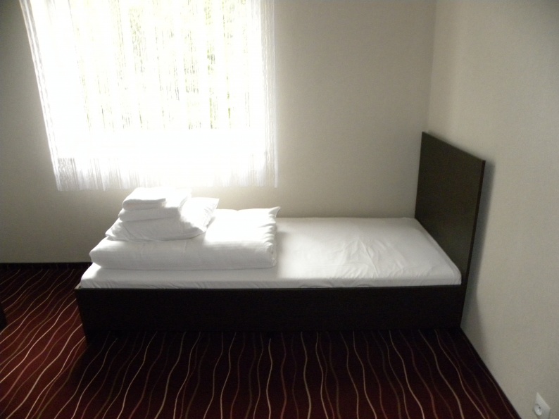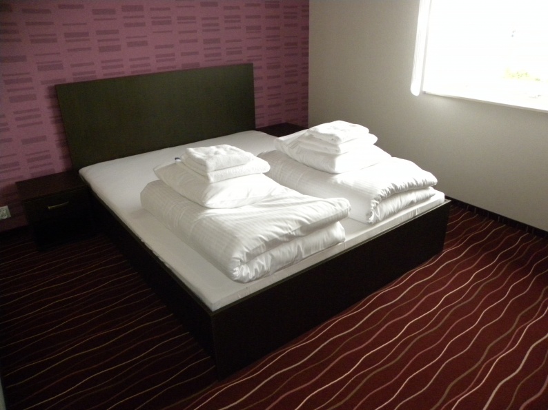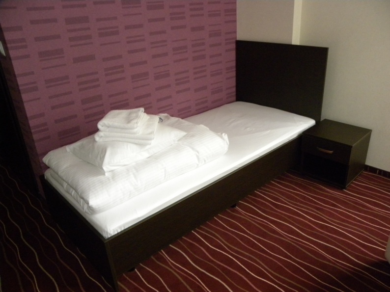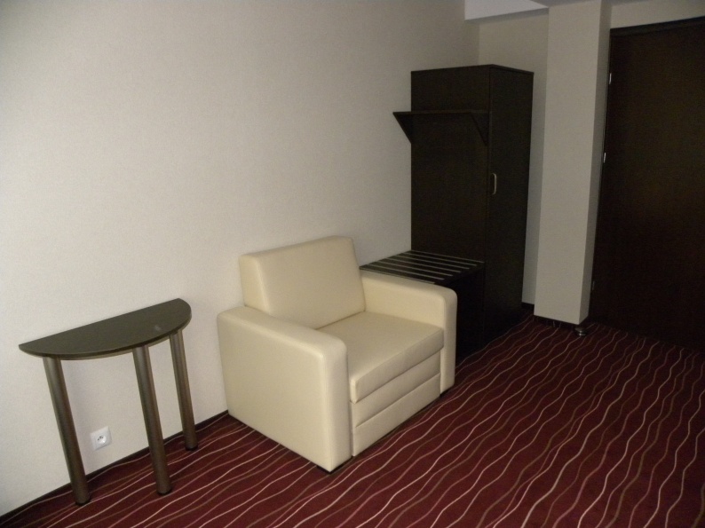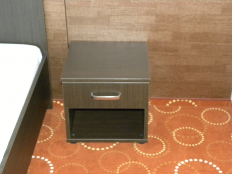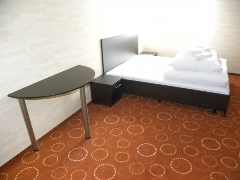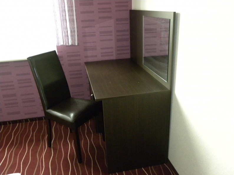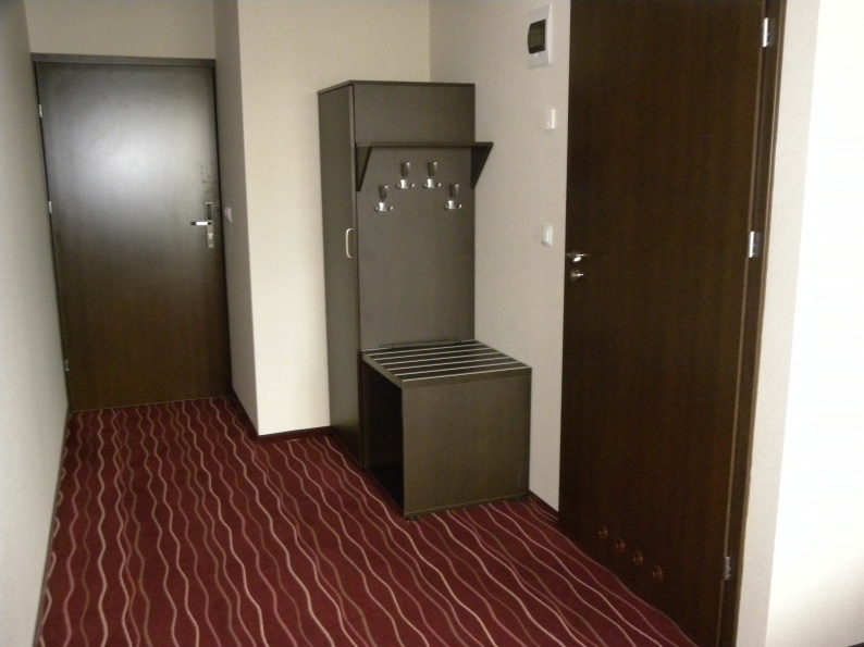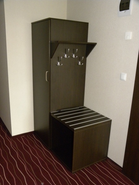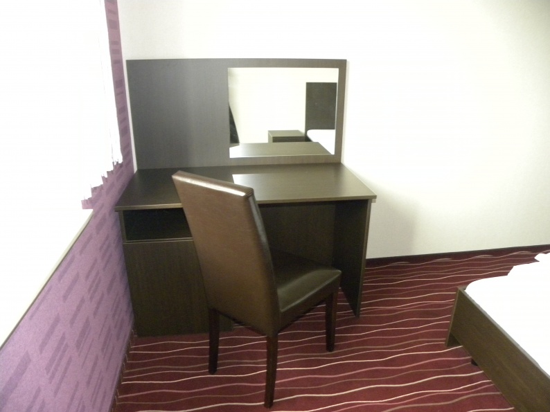 Meble hotelowe wykonane z płyty meblowej w kolorystyce Legno Ciemne R 3080. W skład mebli wchodzą łóżka (pojedyncze i podwójne), szafki przyłóżkowe, stoliki szafy z wieszakami oraz bagażnikiem, a także biurka.