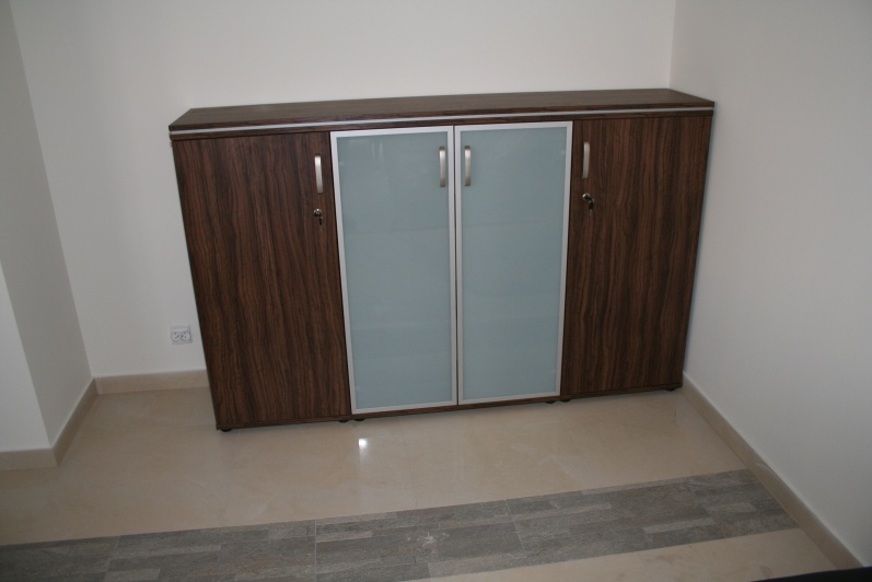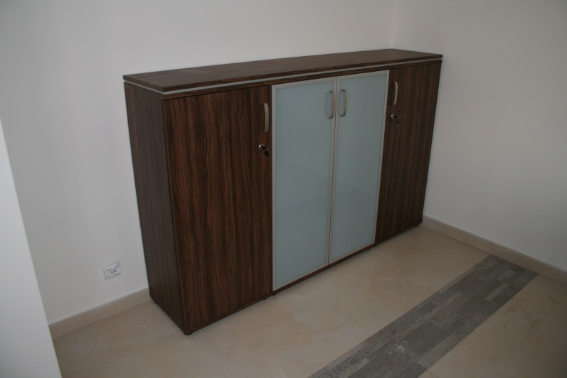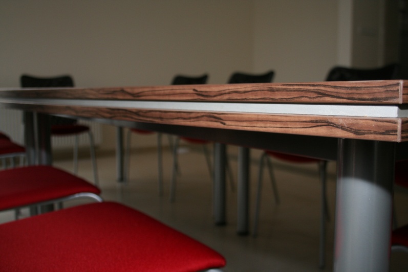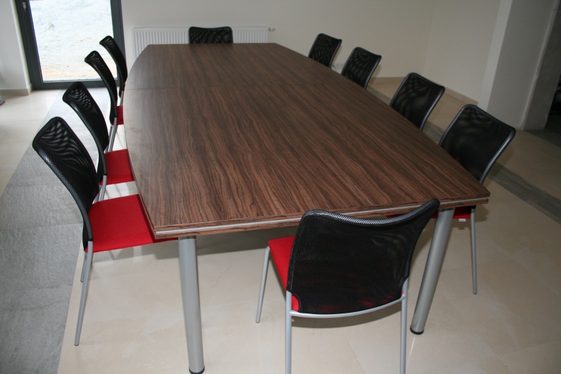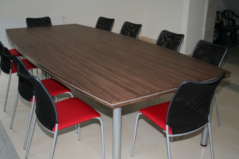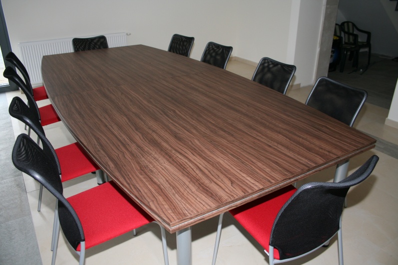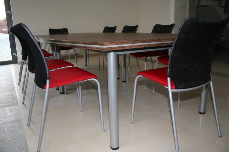 Stół konferencyjny na stelażu metalowym z trójwarstwowym blatem tzw. 'sandwich'. Wybarwienie płyty meblowej - Oliwka Sewilla.