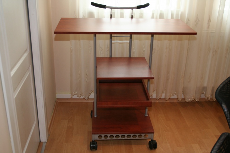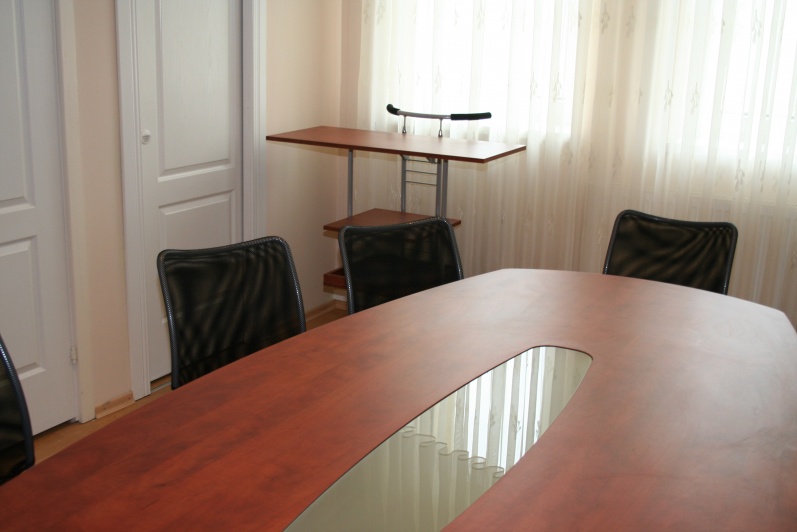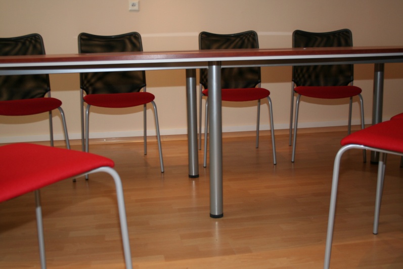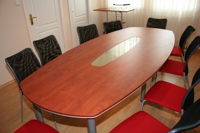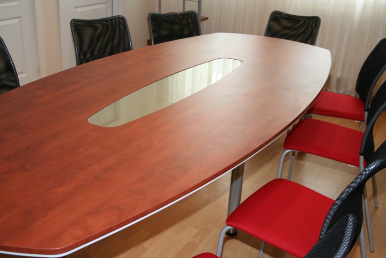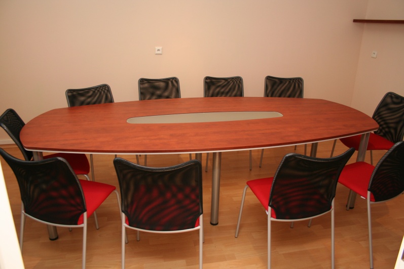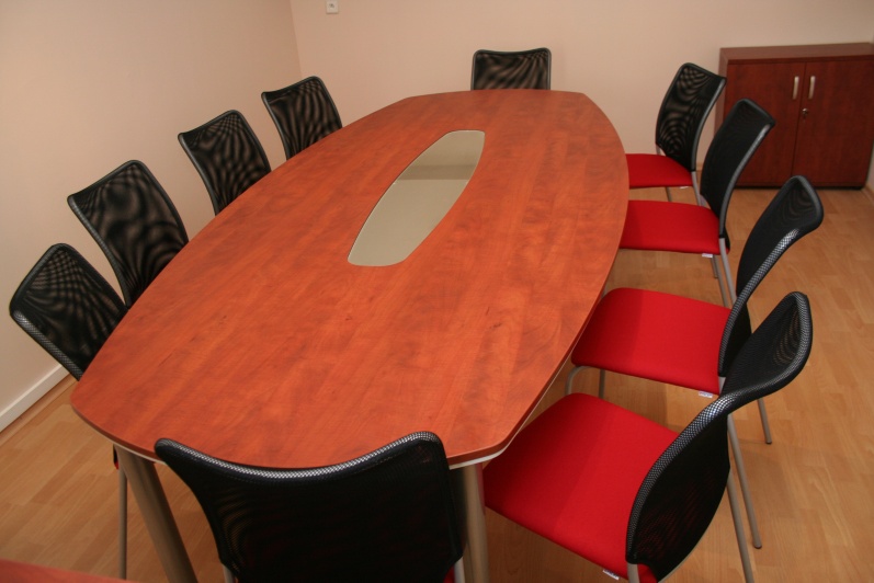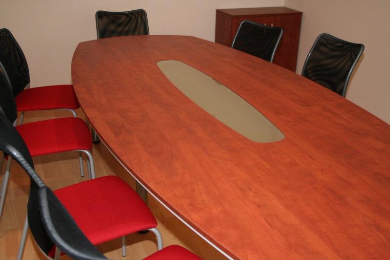 Niewielka Salka konferencyjna wyposażona w stół na stelażu metalowym. Blat typu ‘półkanapka’ płyta o grubości 25mm w połączeniu z płytą o grubości 10mm z zastosowanym boniowaniem. W środku blatu wstawka ze szkła mlecznego. Do zestawu dołączono wózek na akcesoria szkoleniowe w tym samym wybarwieniu co stół – Grusza Dzika R 4967
