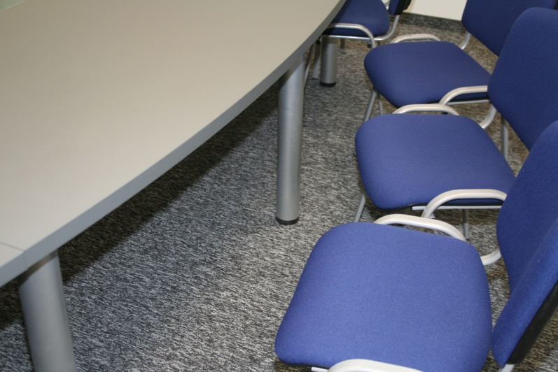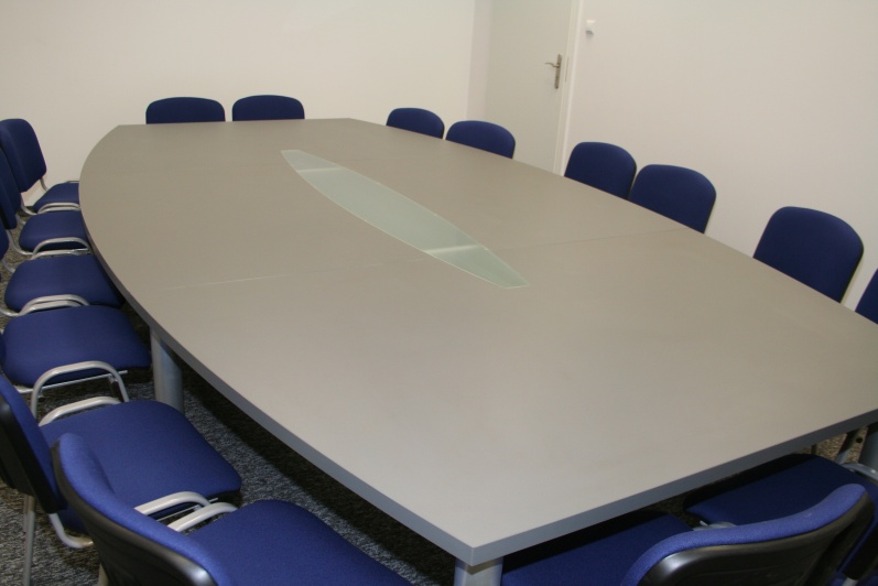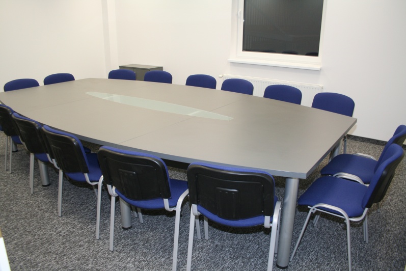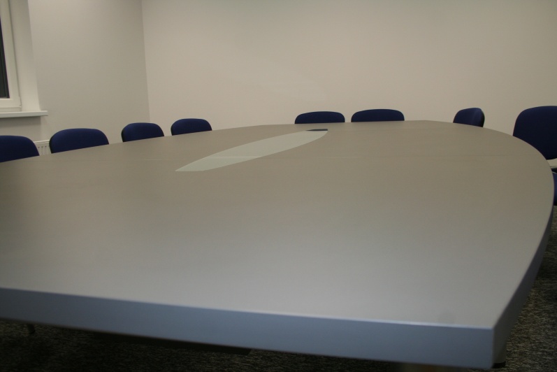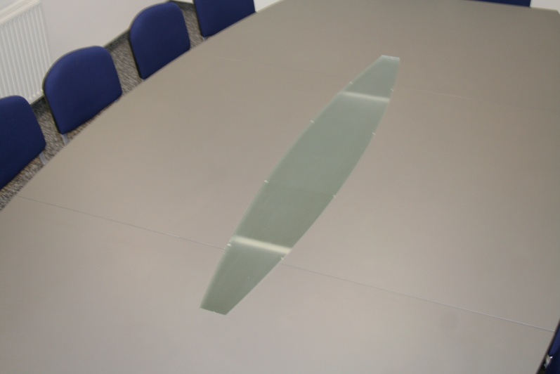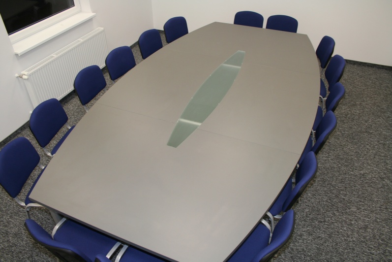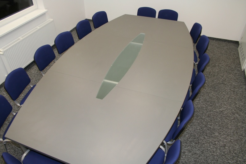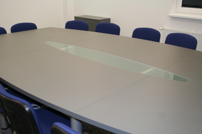 Stół konferencyjny owal na stelażu metalowym malowanym proszkowo na kolor Ral 9006 wykonany z płyty meblowej Pfleiderer w kolorze Antracyt U 1290. W środku stołu wstawiono element ze szkła hartowanego Decormat w kształcie elipsy, blat grubości 36mm