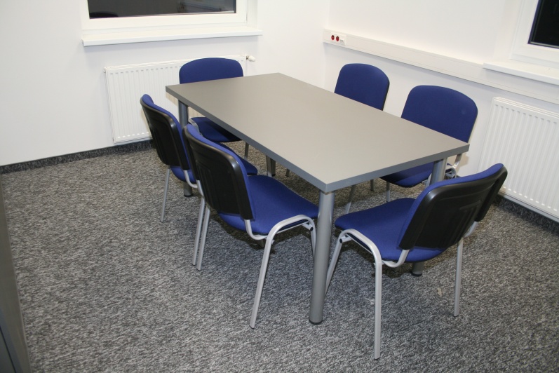 Niewielki stolik konferencyjny na stelażu metalowym malowanym proszkowo na kolor Ral 9006 wykonany z płyty meblowej Pfleiderer w kolorze Antracyt U 1290. Do zestawu dodano także szafy aktowe.