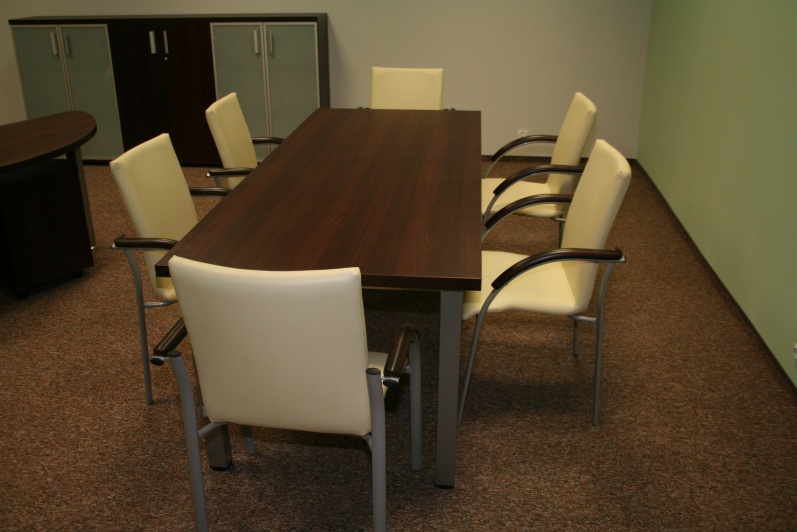 Niewielki, prosty stół konferencyjny na stelażu metalowym. Pogrubiony blat do grubości 36mm. Kolor płyty: Sherwood Mocca R 3141.