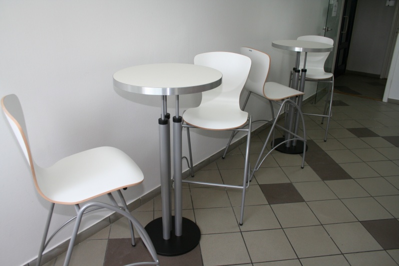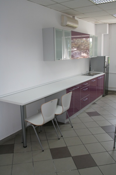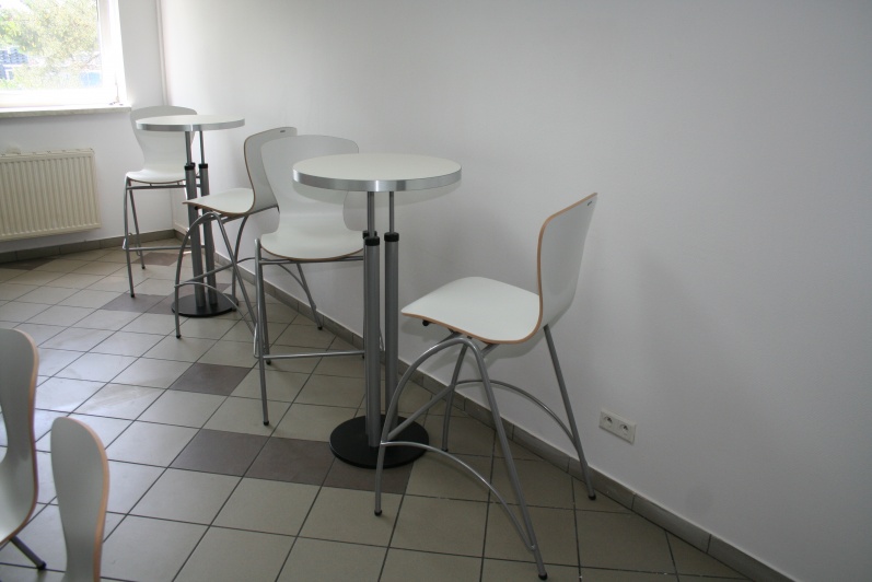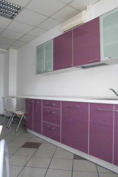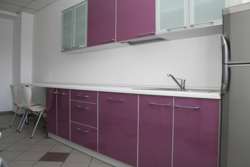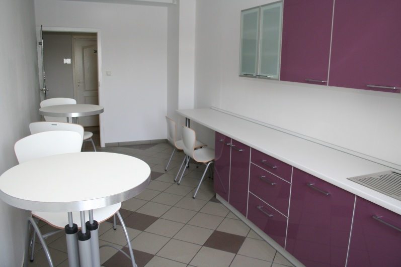 Niewielki aneks kuchenny wykonany z frontów lakierowanych na wysoki połysk. We frontach górnych występują również fronty ze szkła mlecznego lacomat w ramkach aluminiowych. Aneks zawiera również wysokie stoliki oraz krzesła typu hocker.