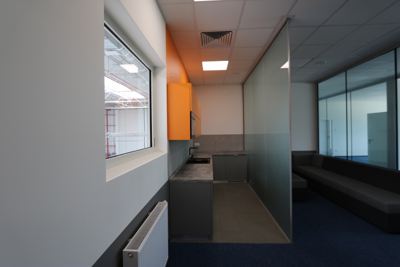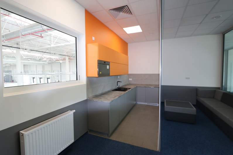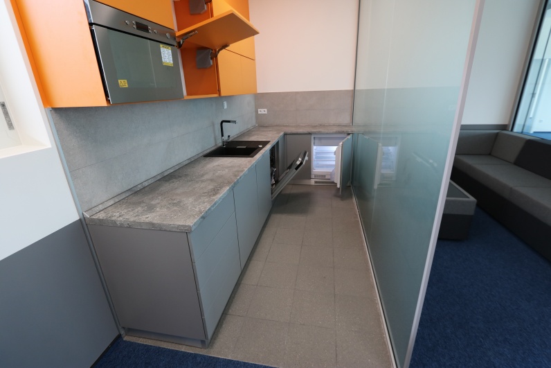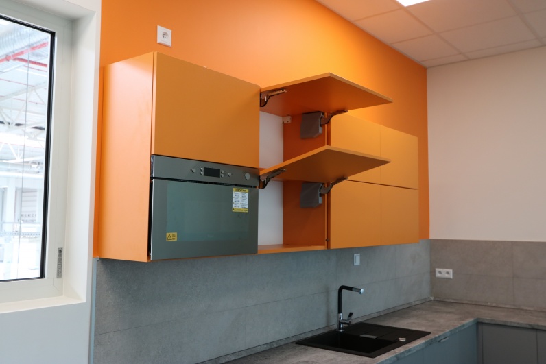 Kuchnia dla zarządu wykonana z płyty meblowej. Szafki górne - płyta meblowa Pomarańcz. Dolne szafki Szary Platynowy. Blat postformingowy.