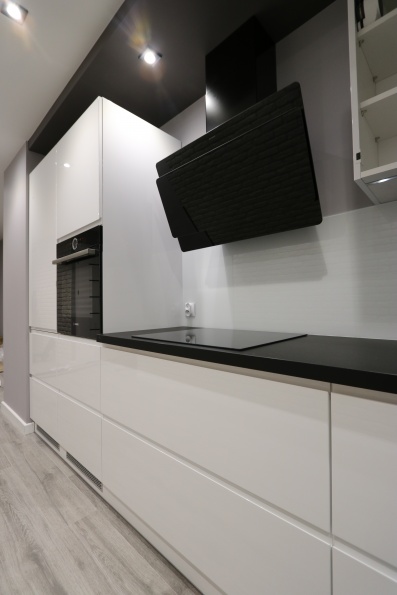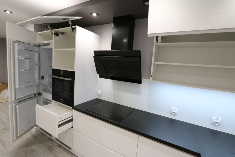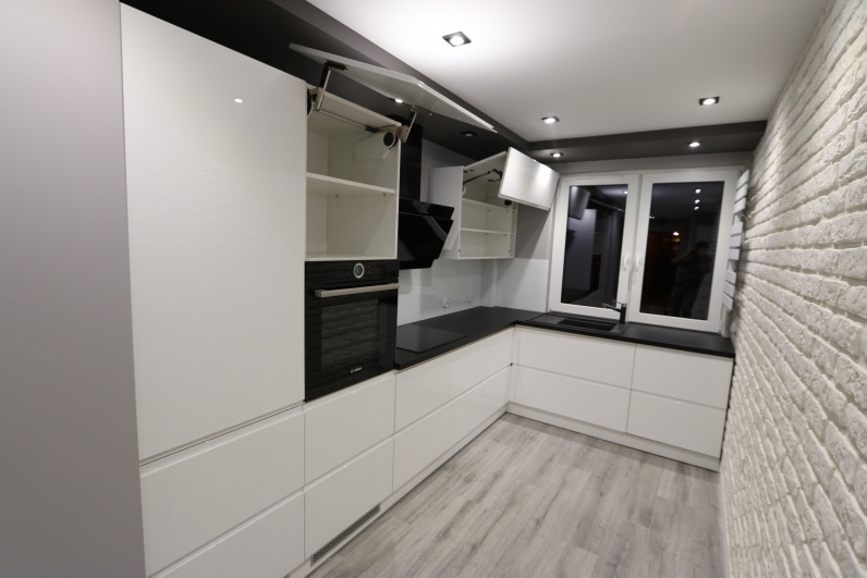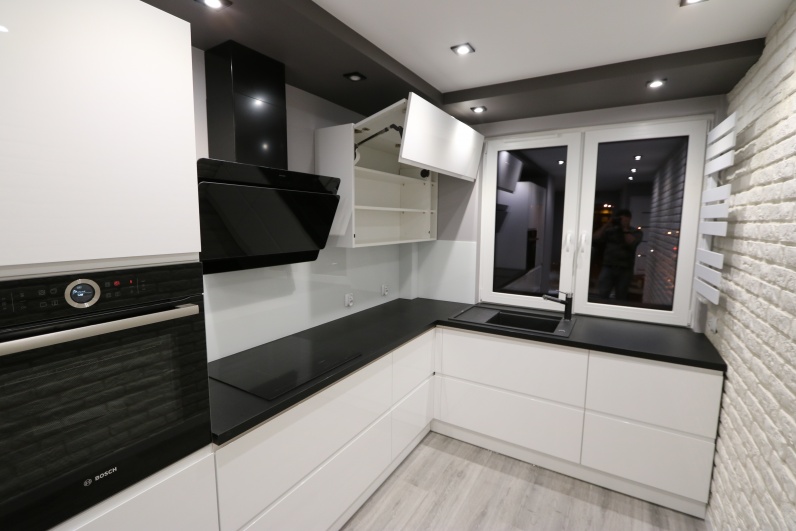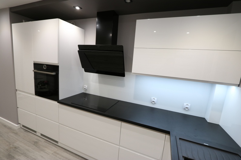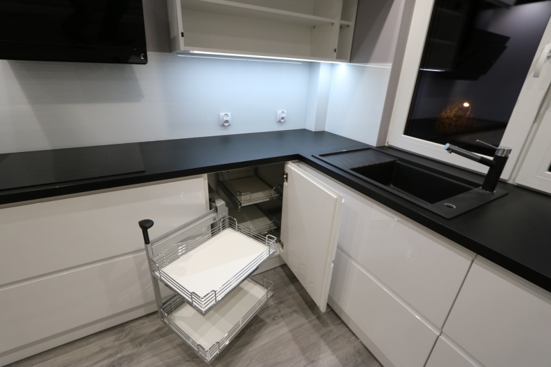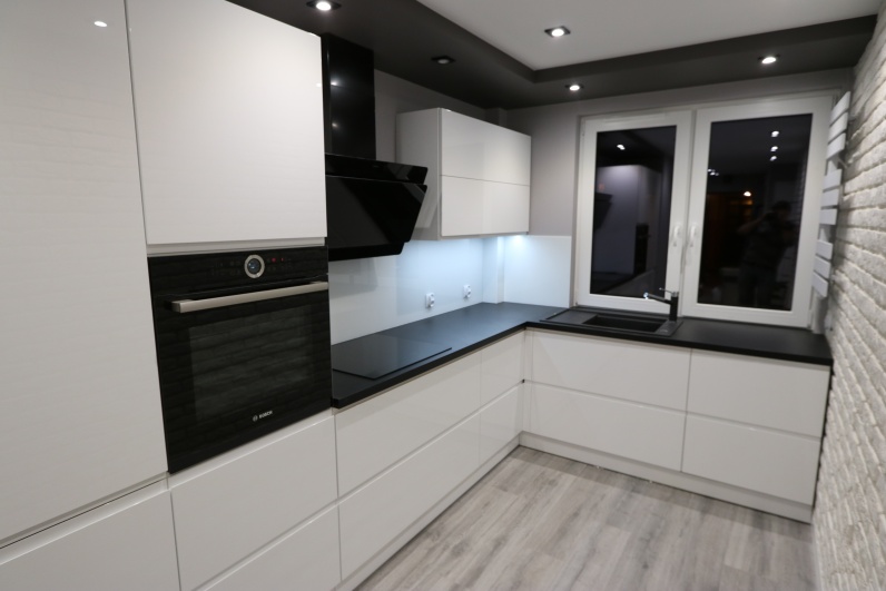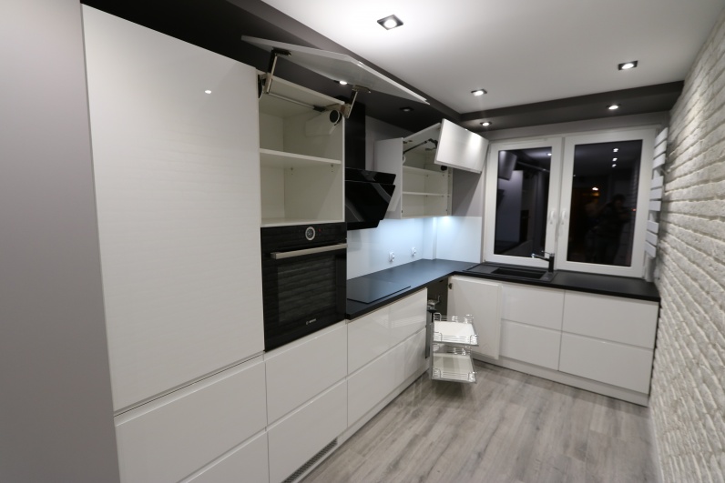 Meble kuchenne wykonane z lakieru w połysku w kolorze białym. Uchwyty frezowane. Blat kuchenny - postformingowy w kolorze czarnym firmy Egger. Kuchnia zawiera systemy Blum - Aventos oraz cargo narożne.