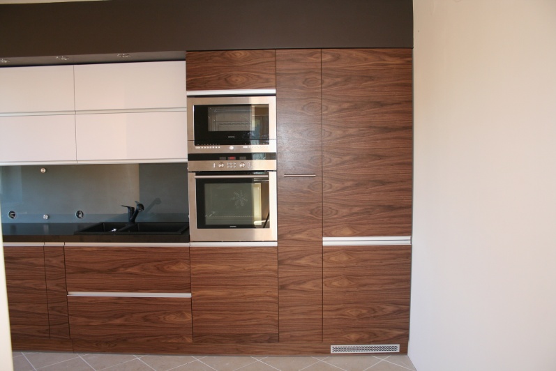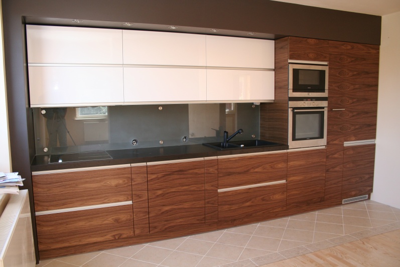 Fronty - lakier biały (połysk) + ramka aluminium, szkło lakomat czarny w ramce aluminiowej. Blat kuchenny rausolit czarny. Barek oklejony laminatem.