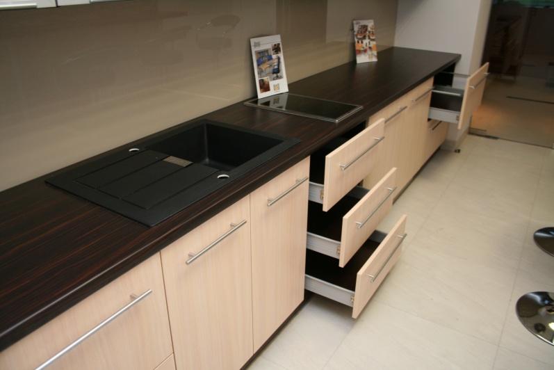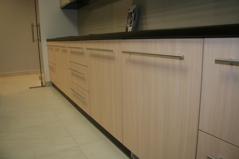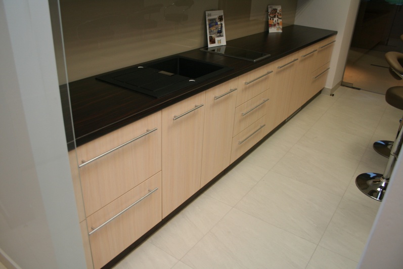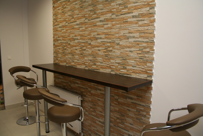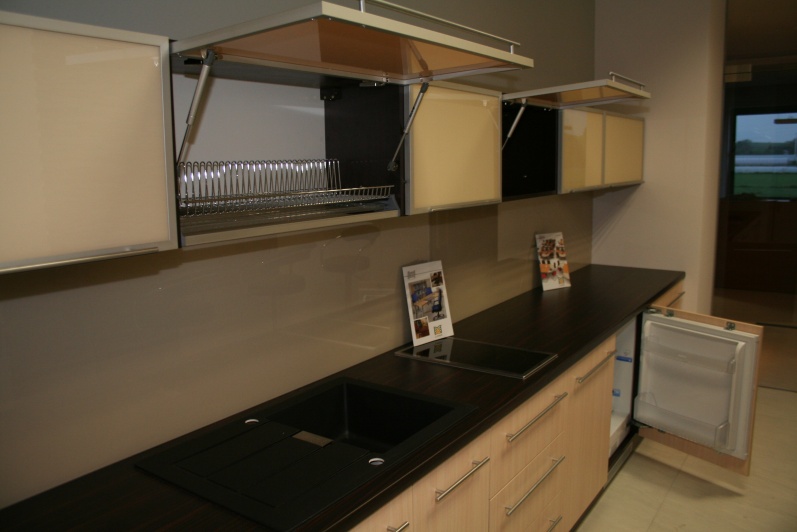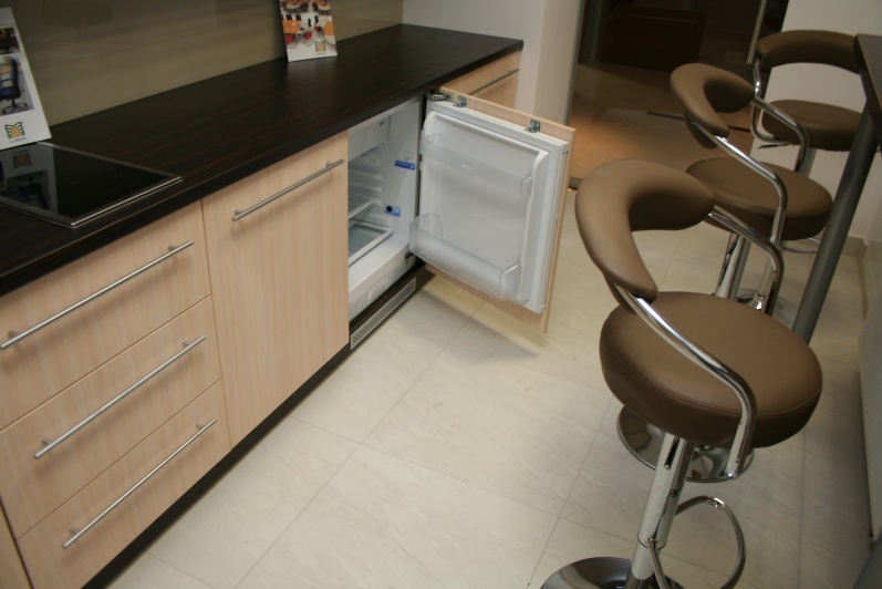 Niewielki aneks kuchenny wykonany w płycie meblowej Dąb Mleczny. Fronty górne – ramki aluminiowe wypełnione szkłem lacobel w kolorze wanilii. Na ścianie zamontowane szkło hartowane Emalit w kolorze beż. W komplecie z aneksem – niewielki stolik z hokerami.