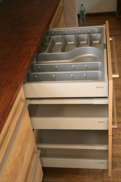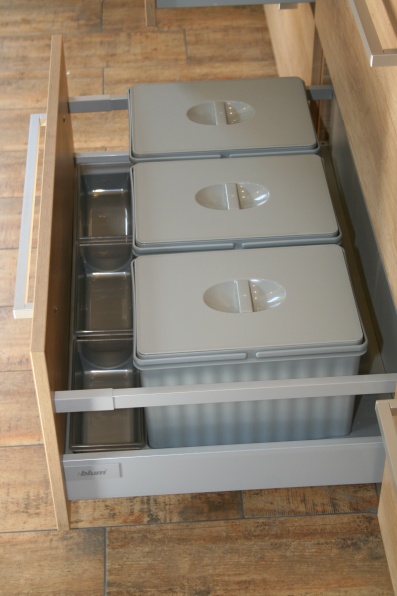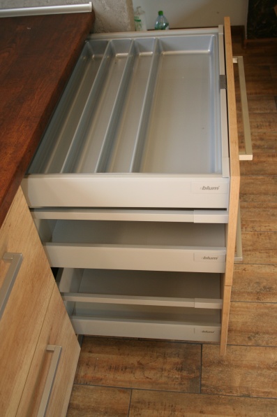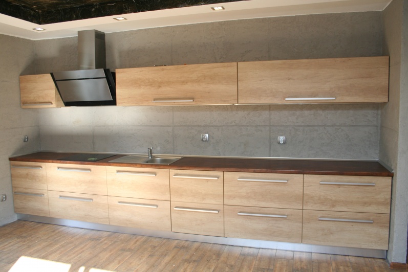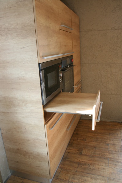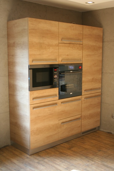 Meble kuchenne wykonane z płyty meblowej firmy Egger w kolorze Dąb Nebraska Naturalny. Blat roboczy Stare Drewno Ciemne firmy Biuro Styl. Zestaw zawiera kolumnę z piekarnikiem i mikrofalą.