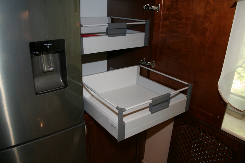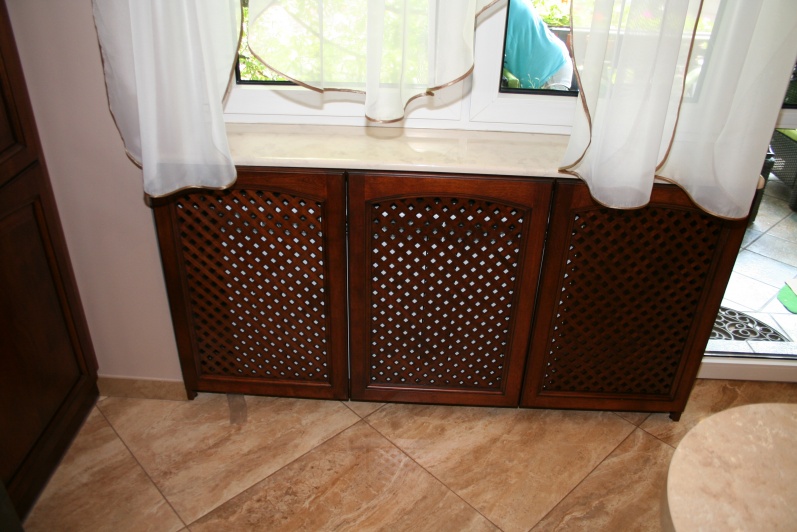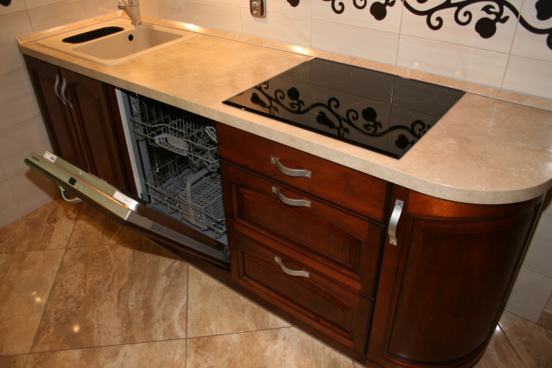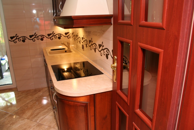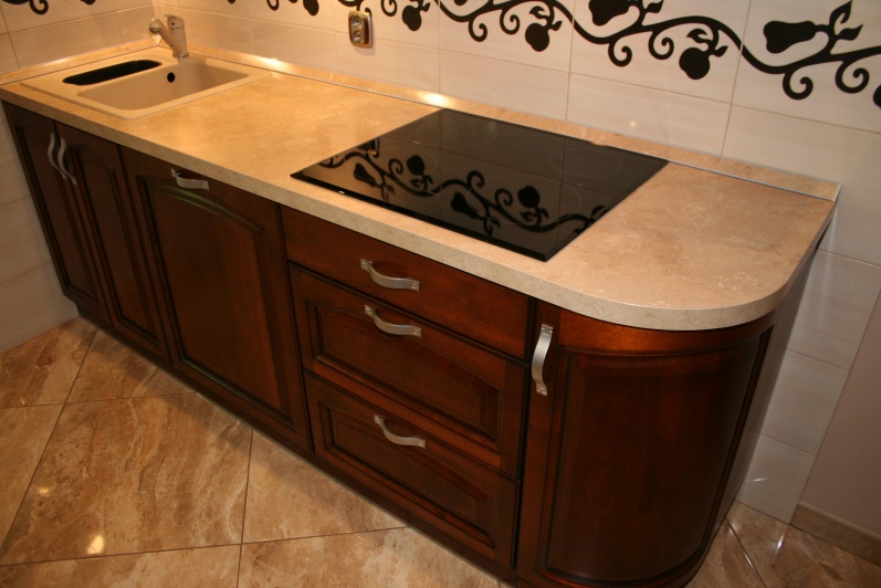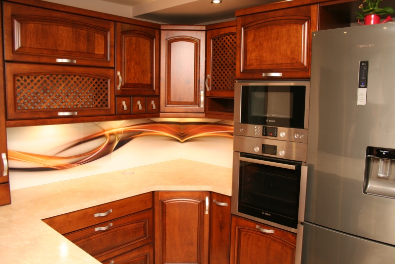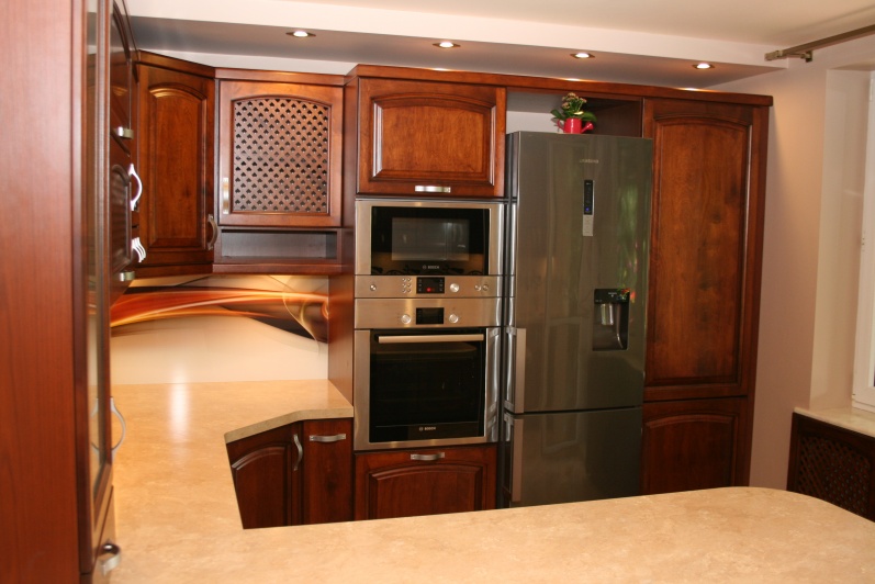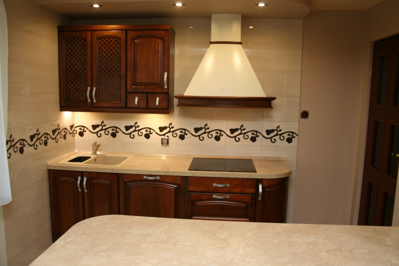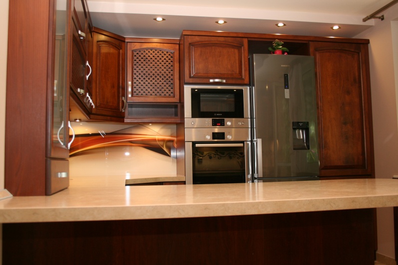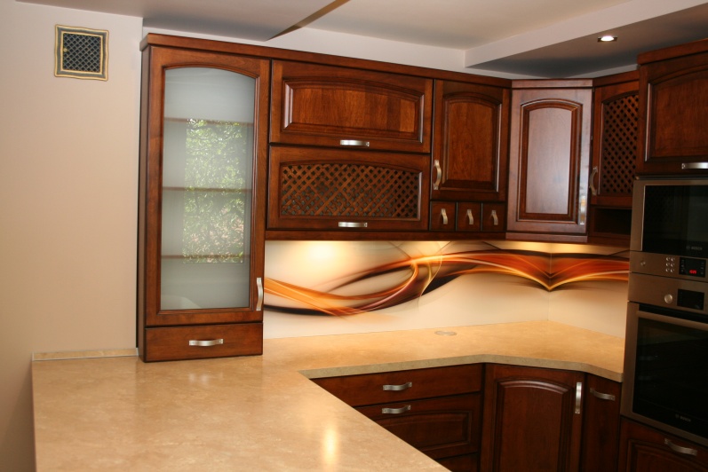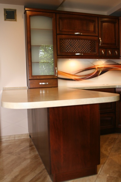 Meble kuchenne wykonane z frontów fornirowanych firmy Drewpol – Brzoza. Blat kuchenny Biuro Styl - Trawertyn Italia. We froncie górnym zastosowano szkło Satinato. Oświetlenie podszafkowe. Na ścianie, zamiast płytek, przyklejono grafikę na szkle.