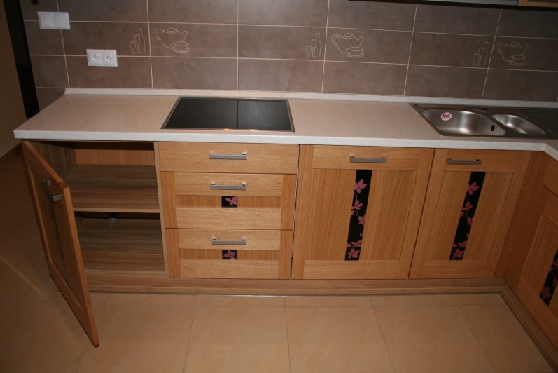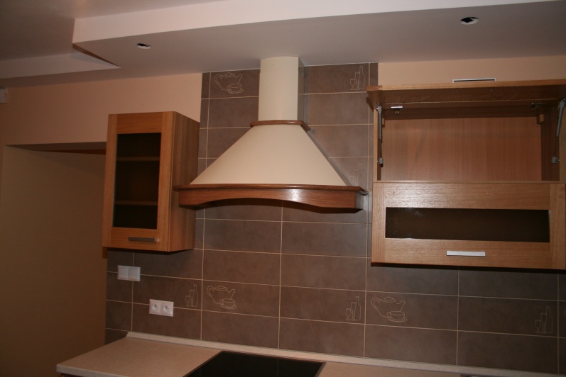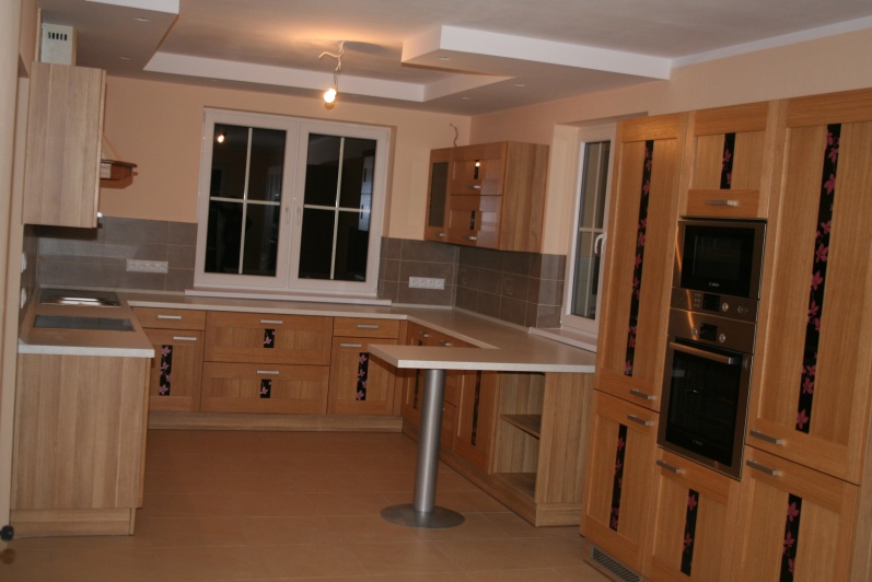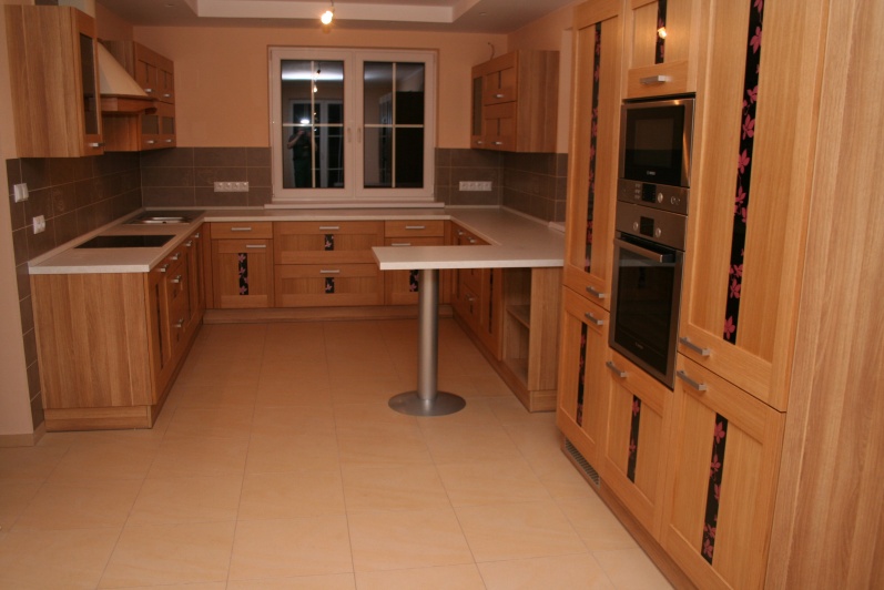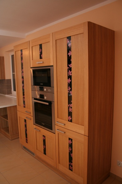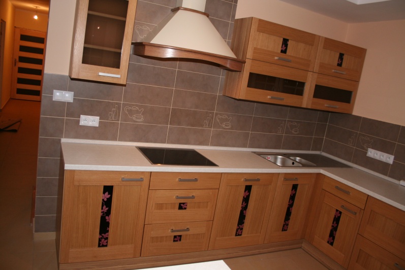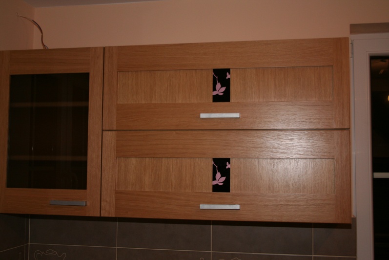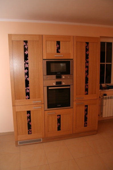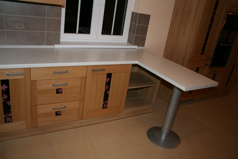 W aranżacji mebli kuchennych zastosowano innwacyjne połączenie grafiki szklanej z frontem z naturalnego drewna. Na korpusach mebli zastosowano płytę Pfleiderer Dąb Amerykański, a jako fronty użyto fronty firmy Drewpol Tokio. Jako blaty zastosowano blat firmy Pleiderer Arabeska Biała. Do mocowania stołu użyta jest noga postumentowa malowana na kolor Ral 9006.