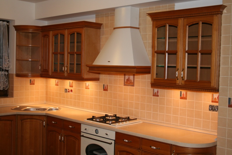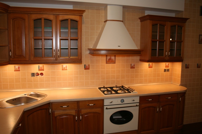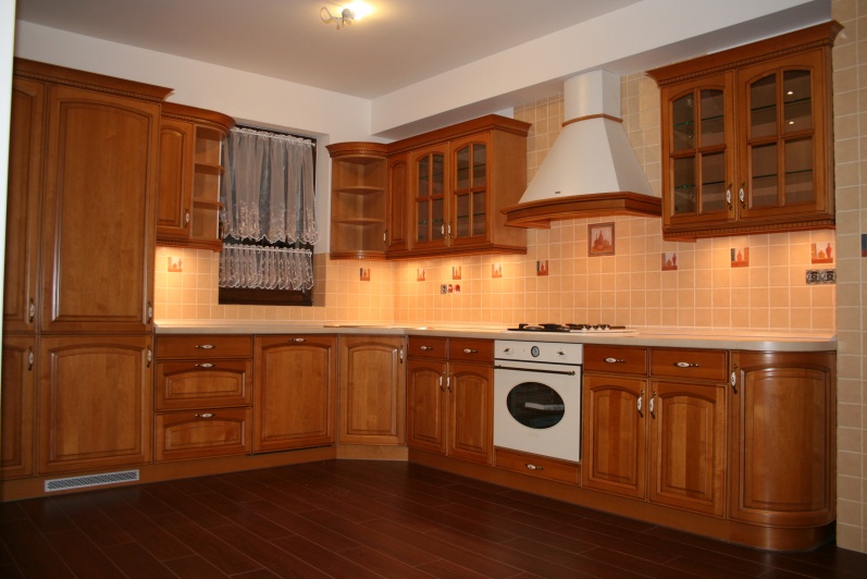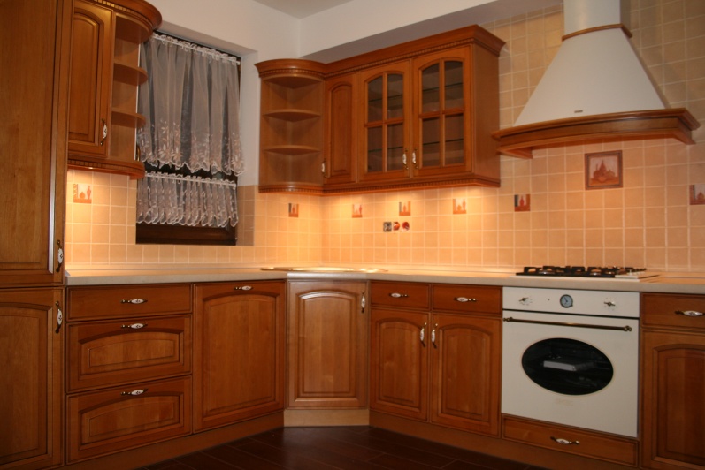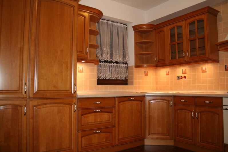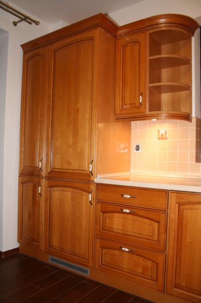 Klasyczny zestaw mebli kuchennych w stylu retro. Fronty naturalne z drewna olchowego o nazwie Olcha Patyna 13,2 firmy Drewpol. W kuchni zastosowano oświetlenie podszafkowe oraz blat firmy Pfleiderer.