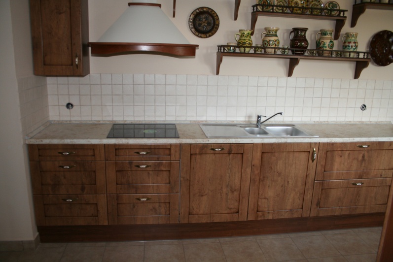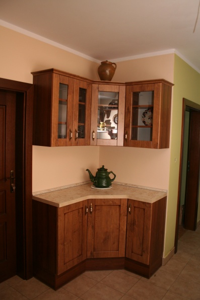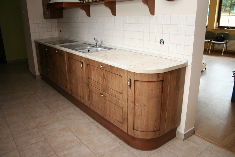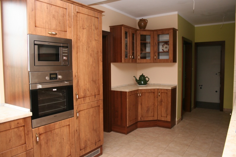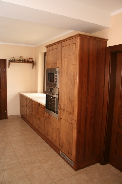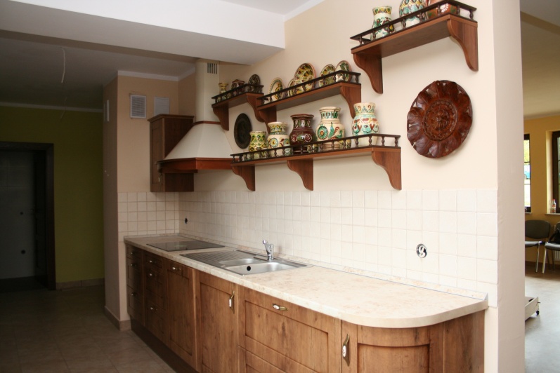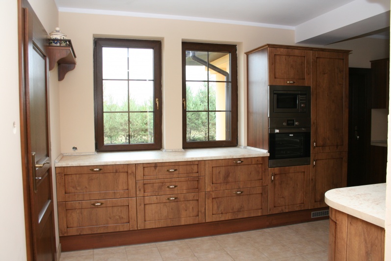 Kuchnia wykonana w stylu retro, fronty MDF Lancelot patyna firmy Wiech. Jako blat roboczy użyto standardowych produktów firmy Biuro Styl w kolorystyce Marmur Jura.