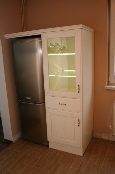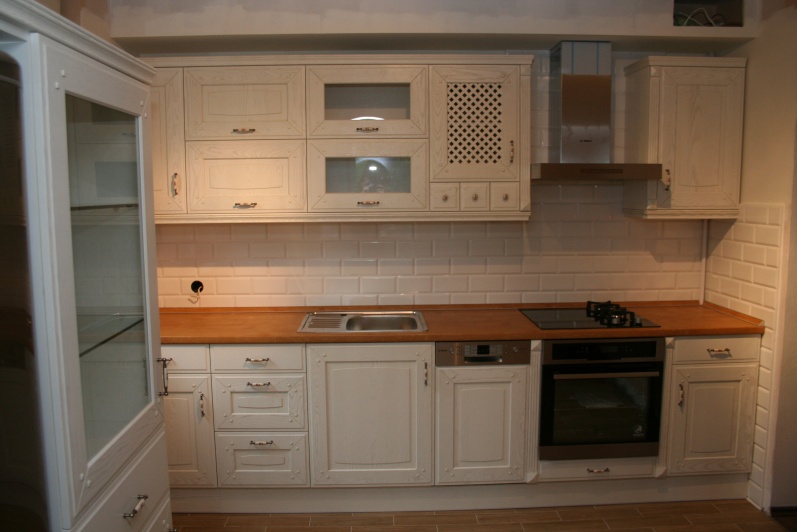 Rustykalne meble kuchenne. Fronty z firmy Drewpol. Blat roboczy - Biurostyl Dąb Jasny. We witrynie oświetlenie ledowe.