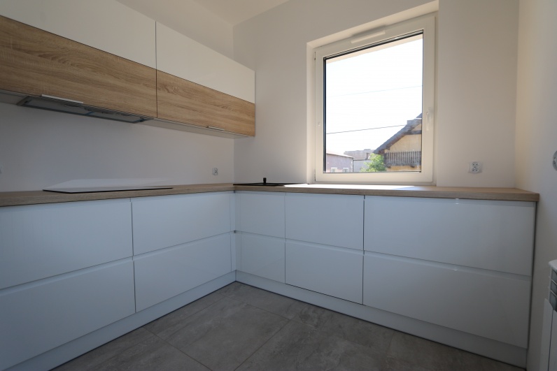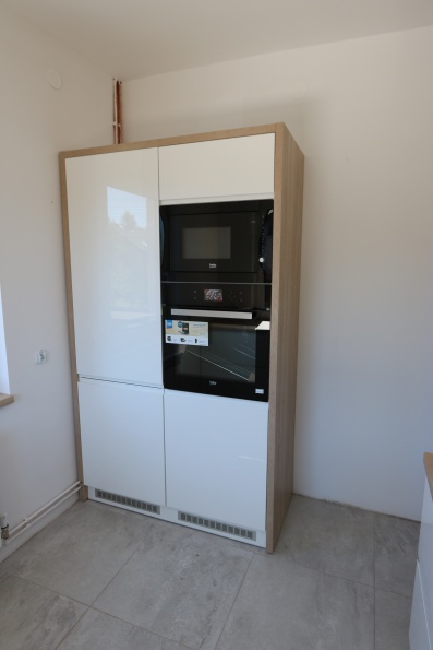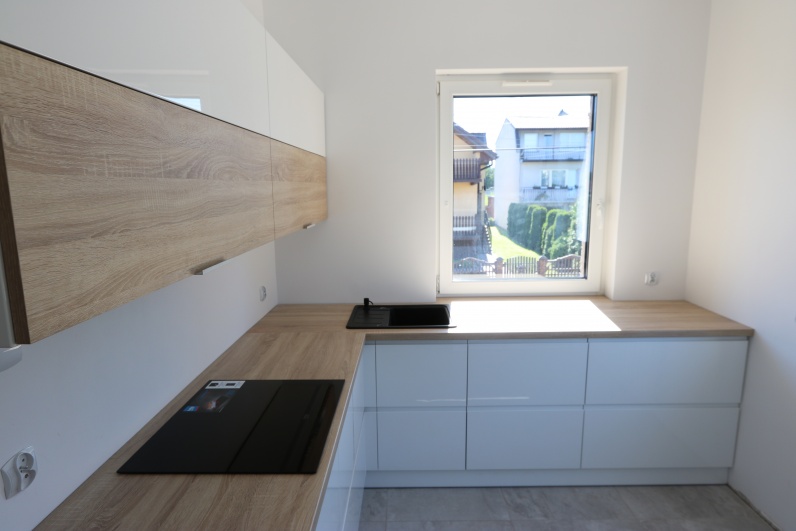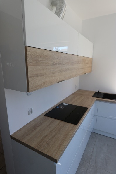 Meble kuchenne wykonane z w połączeniu lakieru z płyta meblową. Fronty dolne - lakier w połysku, uchwyty frezowane. Fronty górne - płyta meblowa Dąb Bardolino Naturalny oraz lakier biały. Blat kuchenny postformingowy.