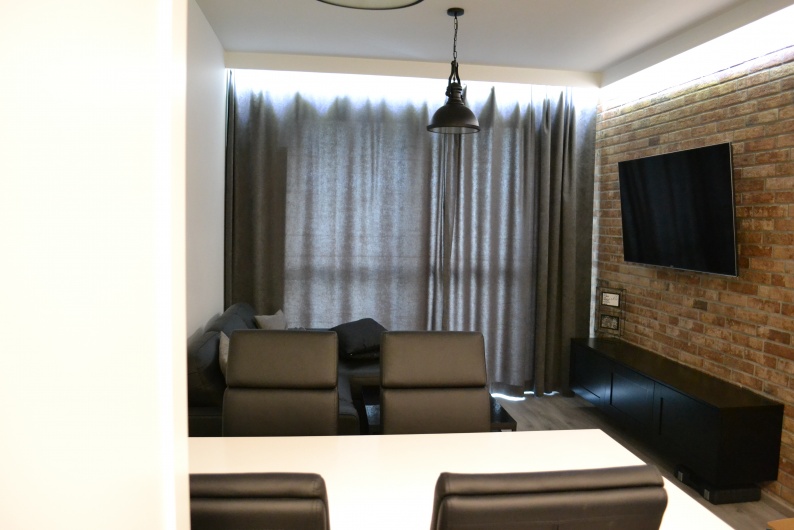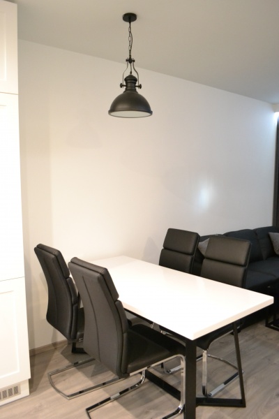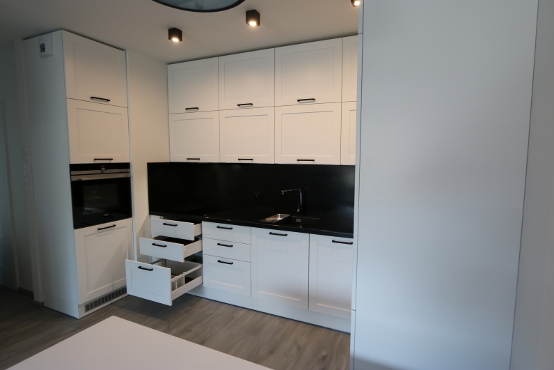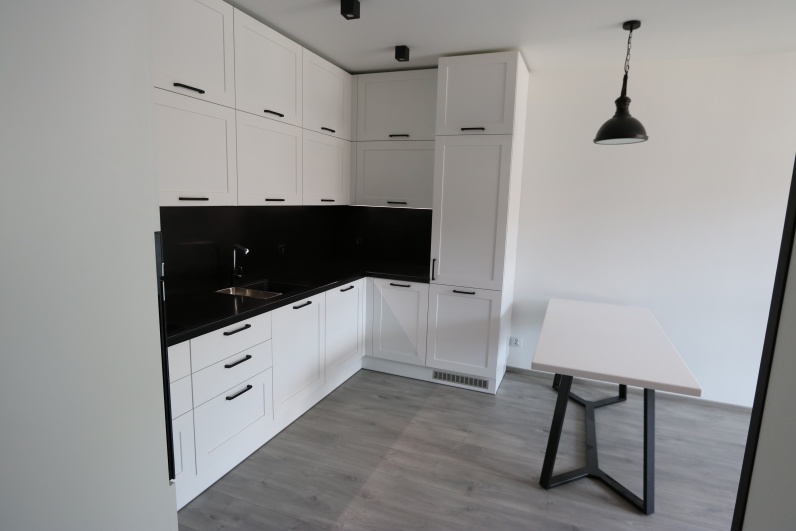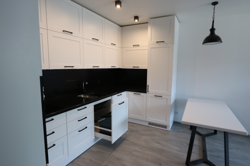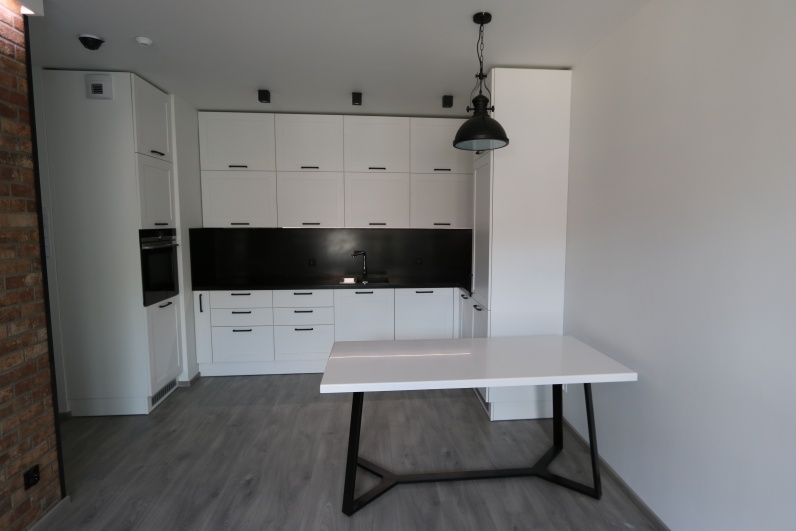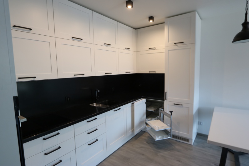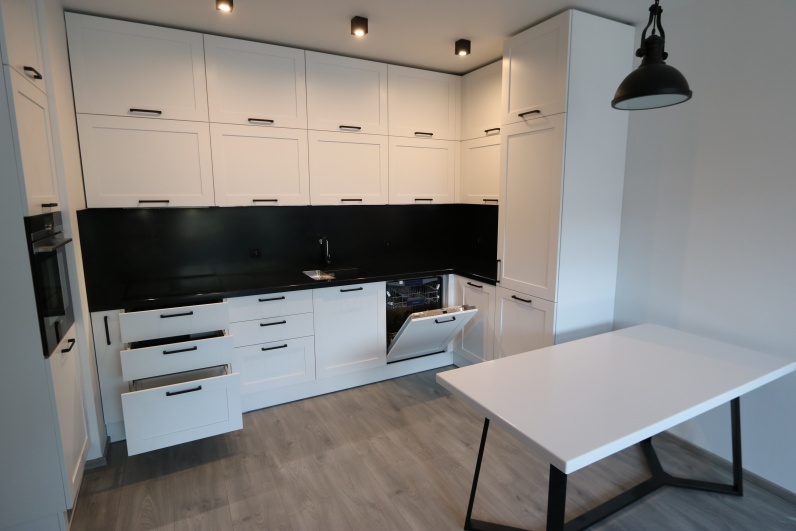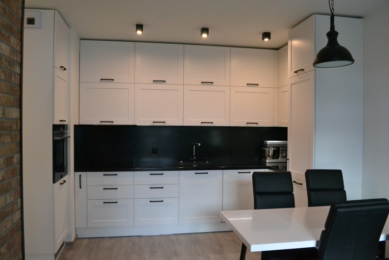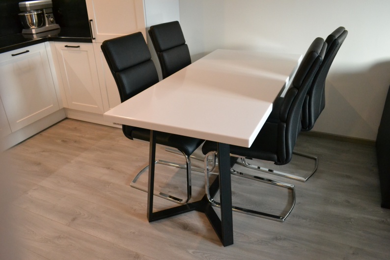 Meble kuchenne wykonane z lakieru, fronty ramowo - płycinowe. na ścianę zamiast płytek lub szkła płyta mineralno-akrylowa . Blat kuchenny oraz blat stołu - również plyty mineralno-akrylowe. Stół na stelażu metalowym.
