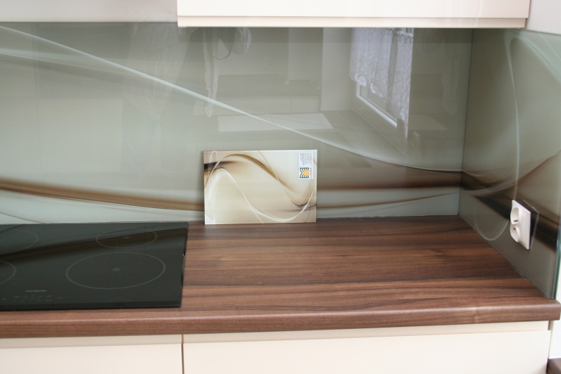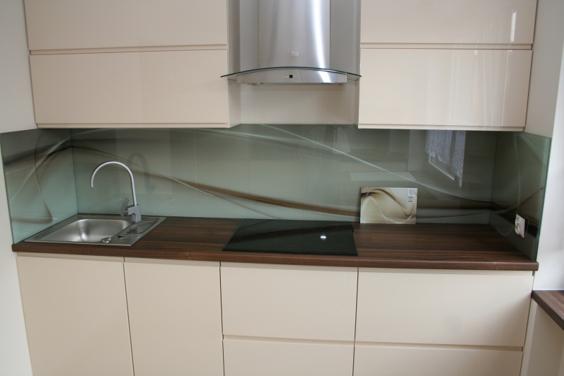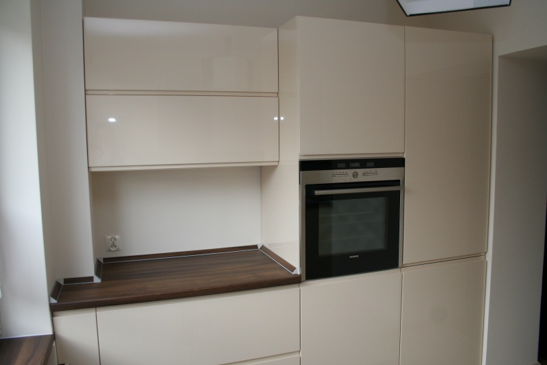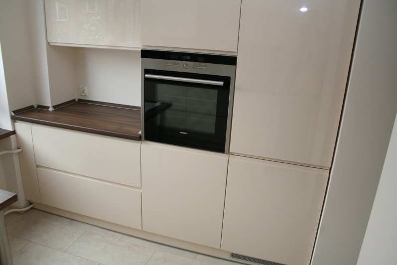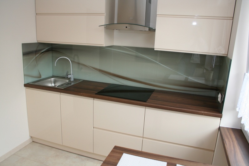 Nowoczesna kuchnia z frontami lakierowanymi, w których zostały wykonane uchwyty meblowe. Jako blat w kuchni zastosowano standardowy produkt firmy Pfleiderer w kolorze Orzech. Jako wypełnienie pomiędzy blatem roboczym, a górnymi szafkami zastosowano grafikę w kolorach beżu.