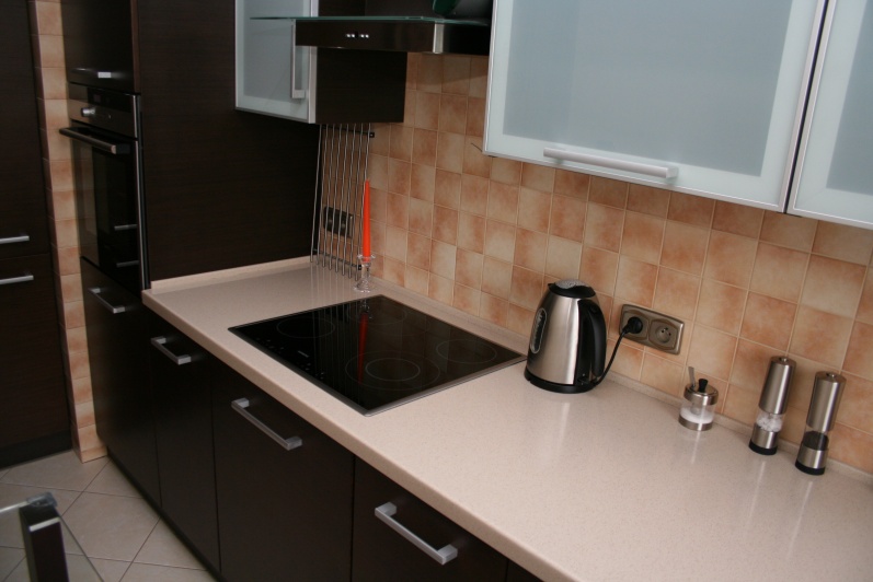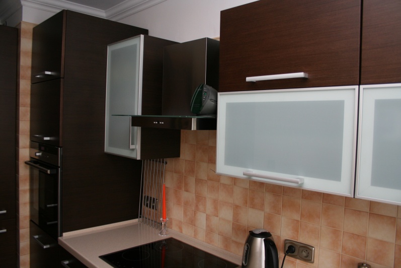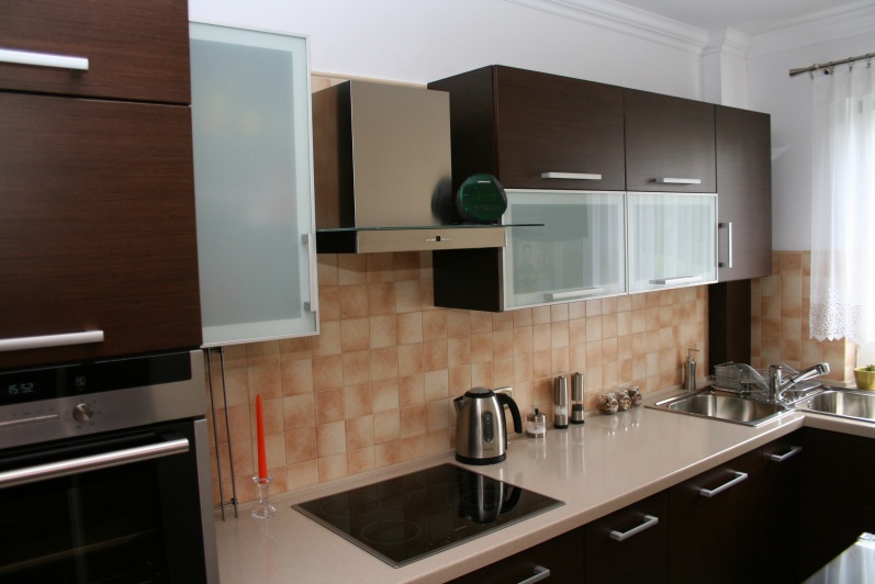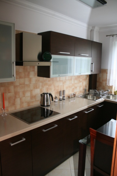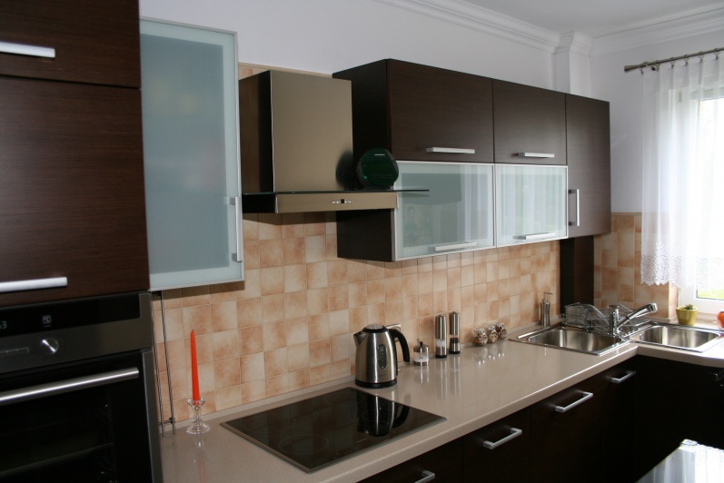 Meble kuchenne wykonane w technologii frontów fornirowanych modyfikowanych w kolorze Wenge. Blat roboczy wykonano z surowców Solid Surface firmy Rehau Rauvisio. W szafkach górnych zastosowano jako fronty ramki aluminiowe wypełnione szkłem lakomat.