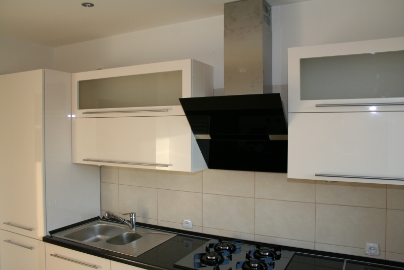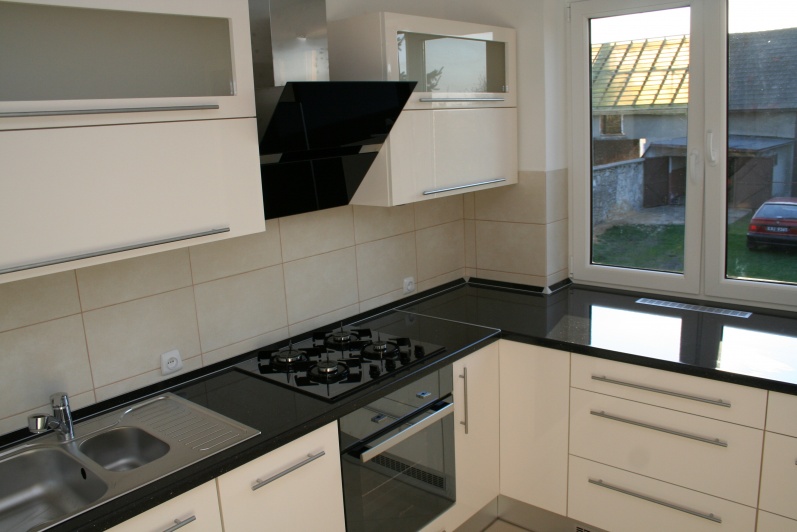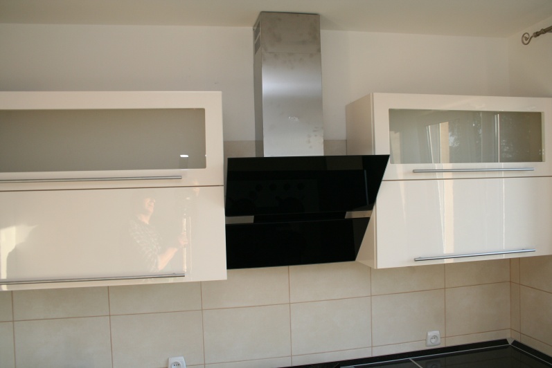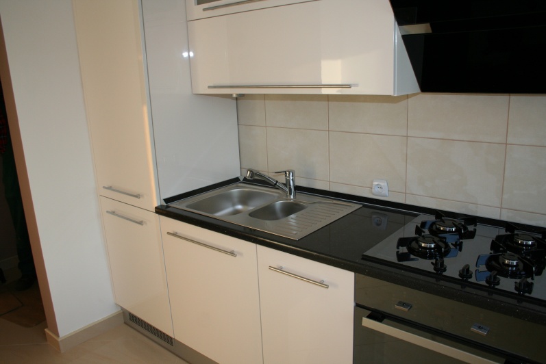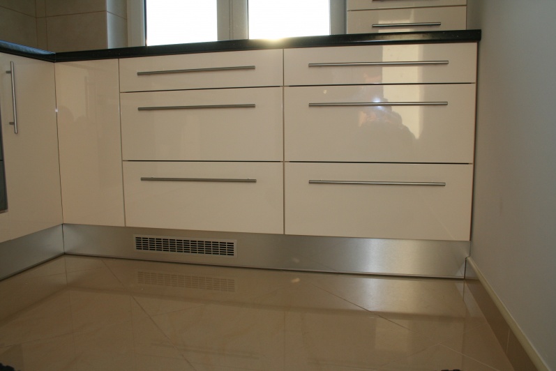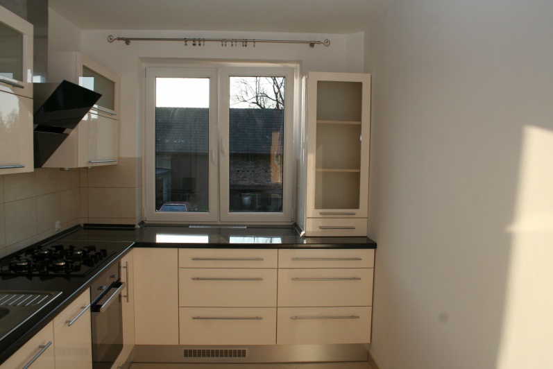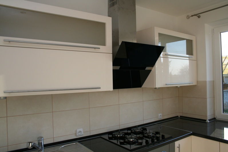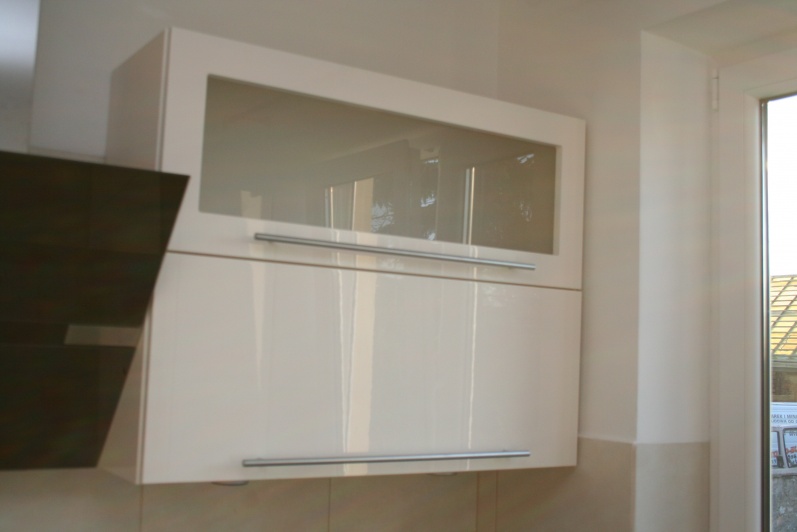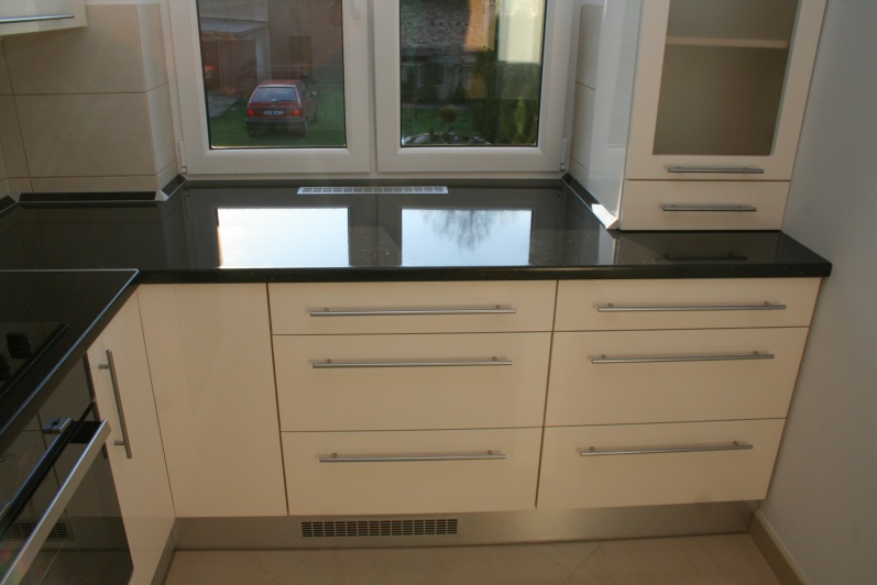 Klasyczny zestaw mebli kuchennych, w którym zostały zastosowane fronty lakierowane w połysku z minimalnym frezem na krawędzi. W górnych szafkach zastosowano fronty uchylne do góry na siłownikach gazowych oraz ramki aluminiowe ze szkłem antisol. Blat kuchenny ze standardowej kolekcji firmy Kronospan grubość 38mm w kolorze czarnym. W cokoliku mebli zastosowano laminat HPL imitujący aluminium. Zastosowano uchwyty relingowe.