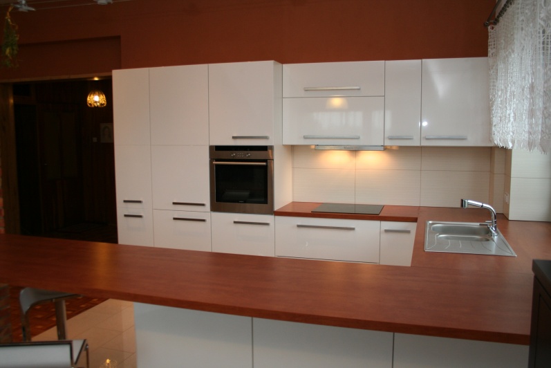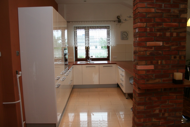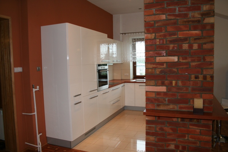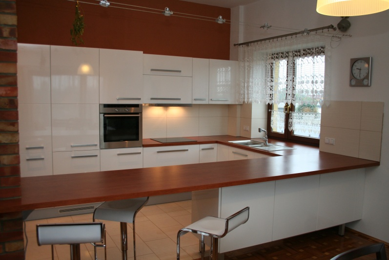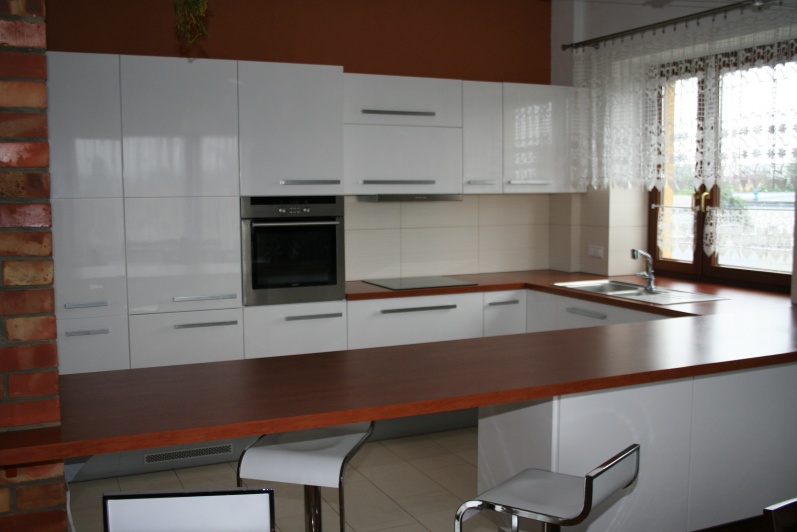 Meble kuchenne lakierowane. Elementy szafek lakierowane na wysoki połysk. Blat oklejony laminatem HPL.