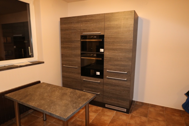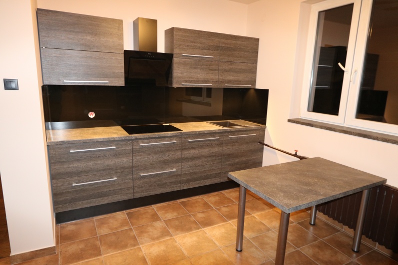 Meble kuchenne wykonane z płyty meblowej Egger w kolorze Wenge Mali , na ścianie szkło hartowane w kolorze czarnym. Blaty postformingowe Egger - Galaxy Ciemny Brąz.