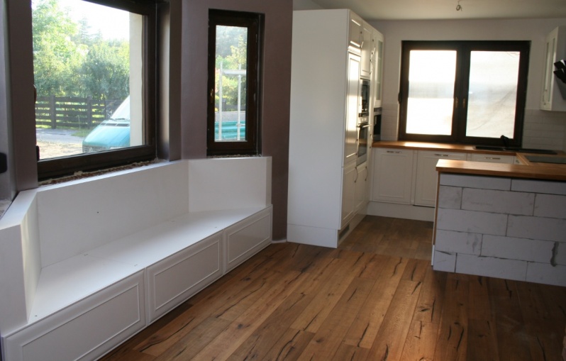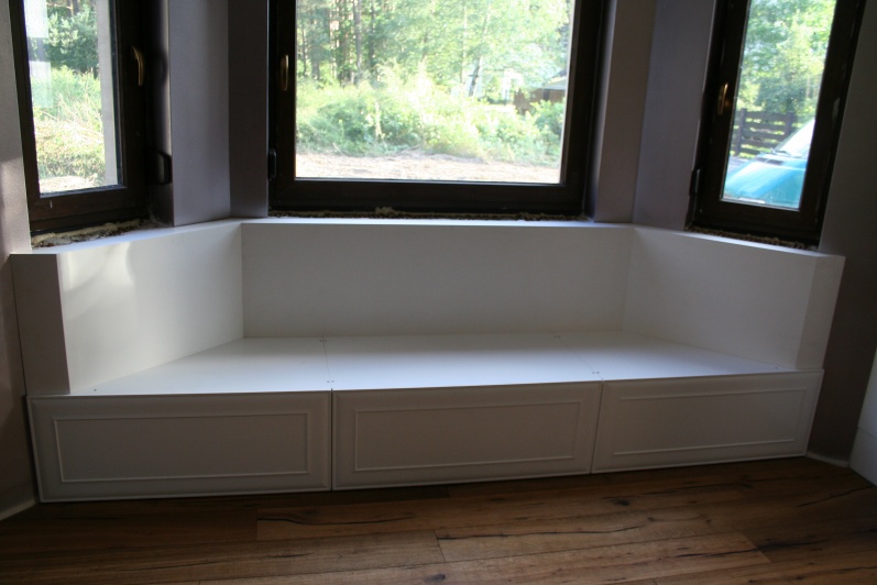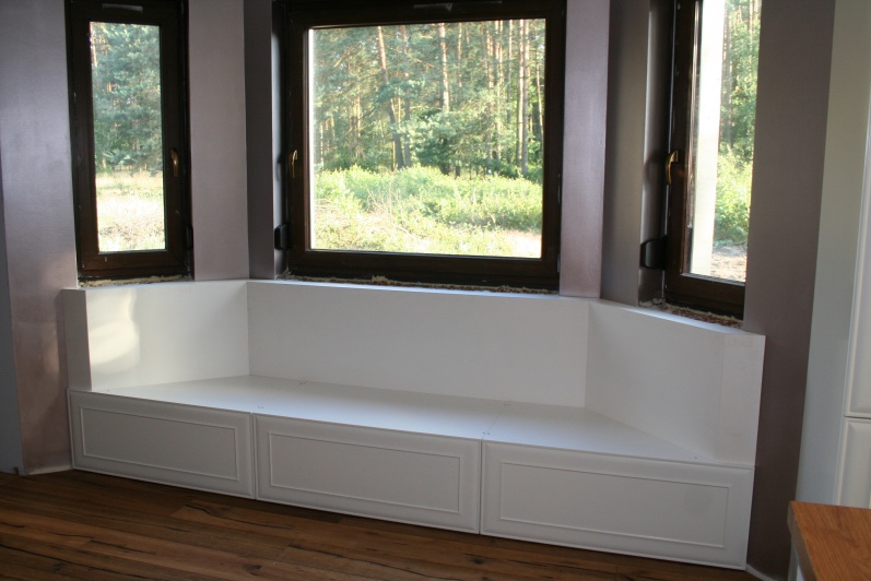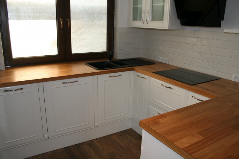 Wirtualna wycieczka po kuchni Meble kuchenne wykonane z płyty MDF oklejanej folią PVC w kolorze Biały Połysk. Blat kuchenny: Dakplast - Dębowy Premium. Fronty górne częściowo wypełnione szkłem Satyna. W wykuszu siedzisko trapezowe wykonane z tych samych materiałów.