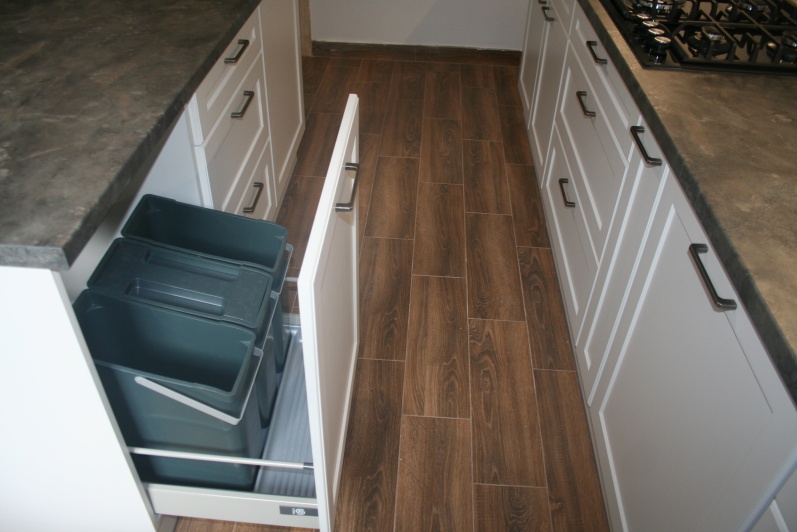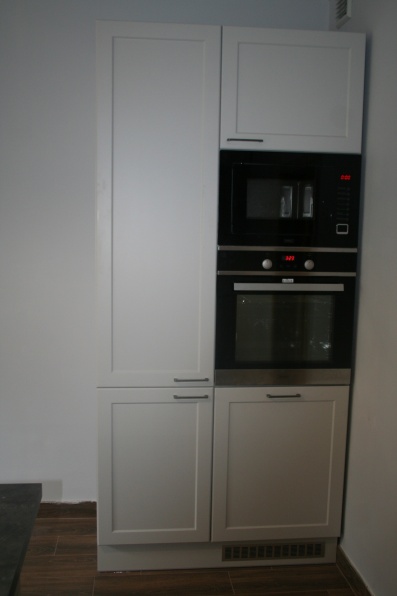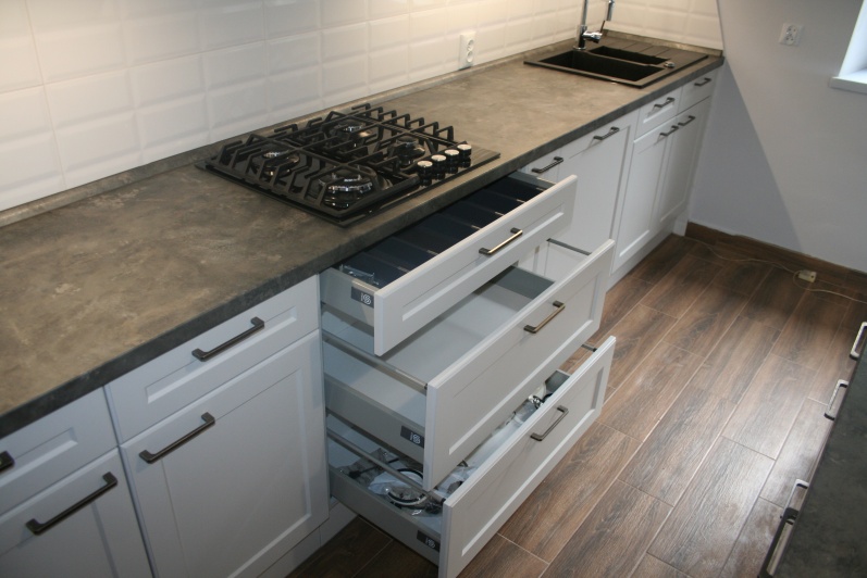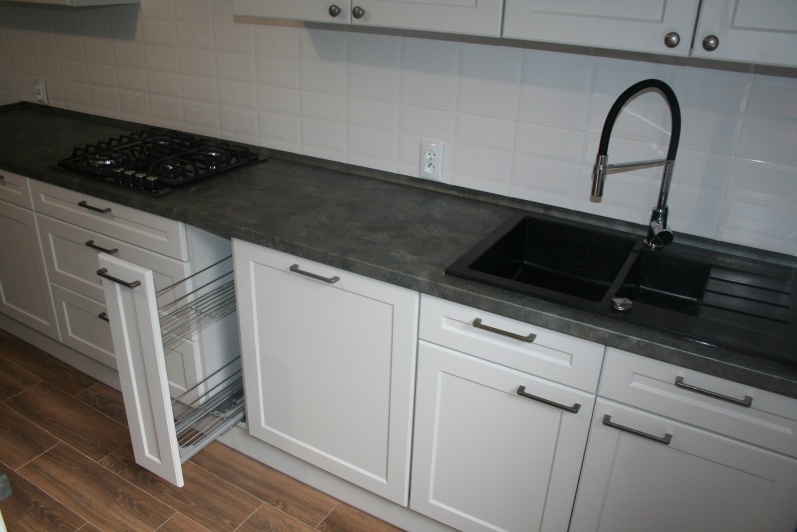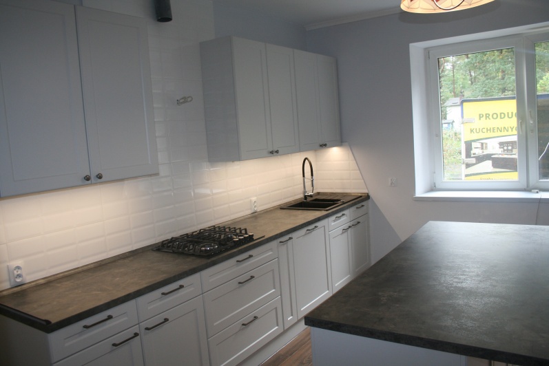 Meble kuchenne - fronty ramowo plycinowe, lakier mat. Blat postformingowy.