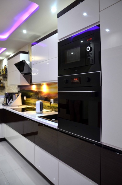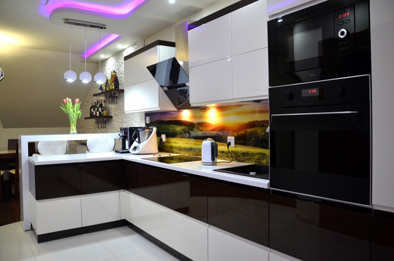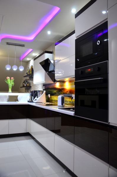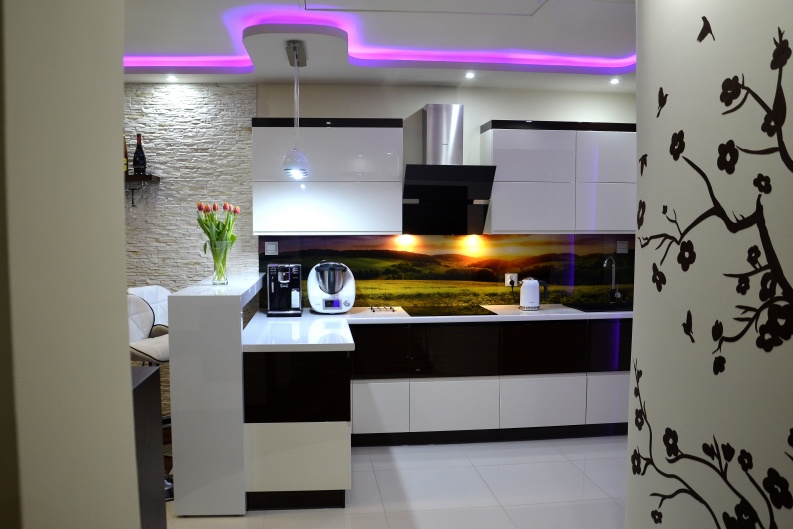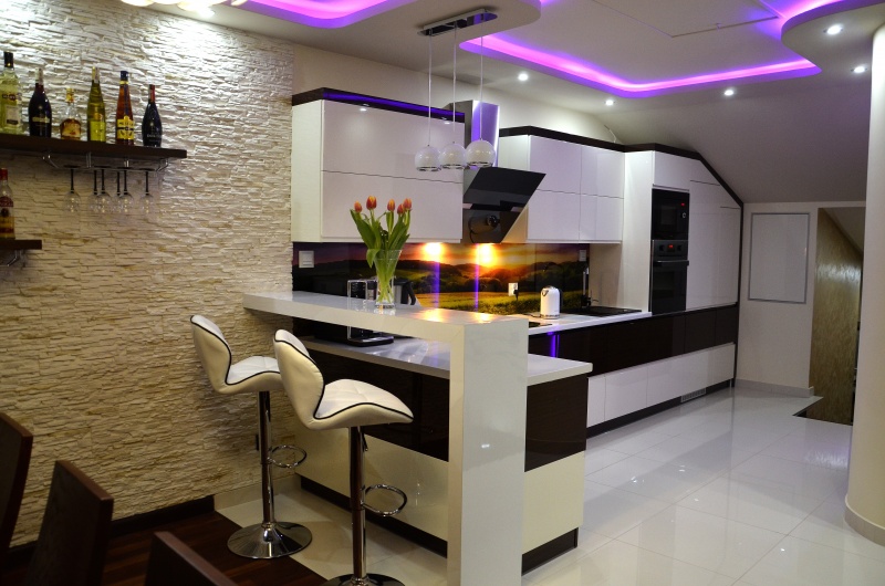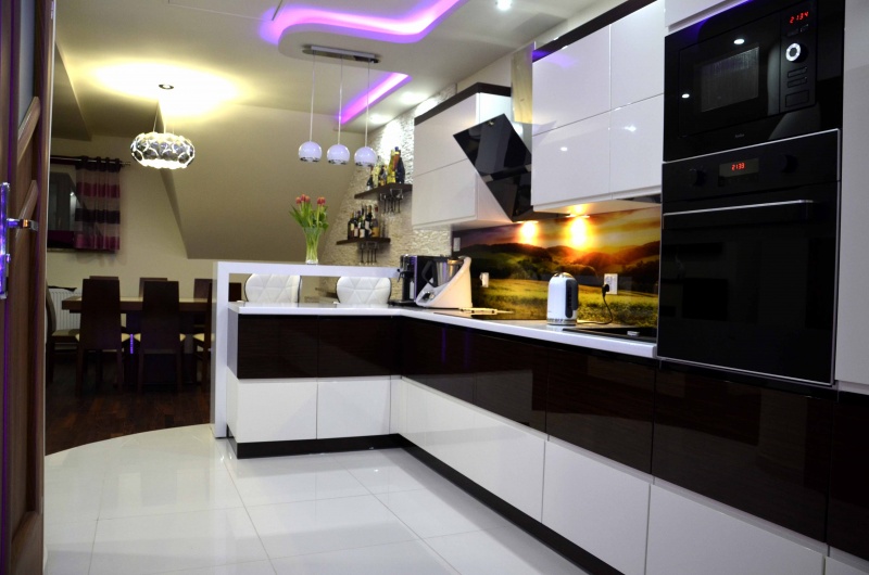 Fronty mebli - lakier w połysku wraz z pasem frontów fornirowanych lakierowanych w połysku. Blaty postformingowe, barek laminat HPL. Na ścianie grafika.