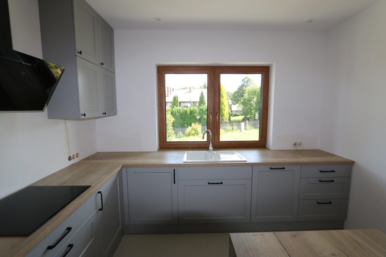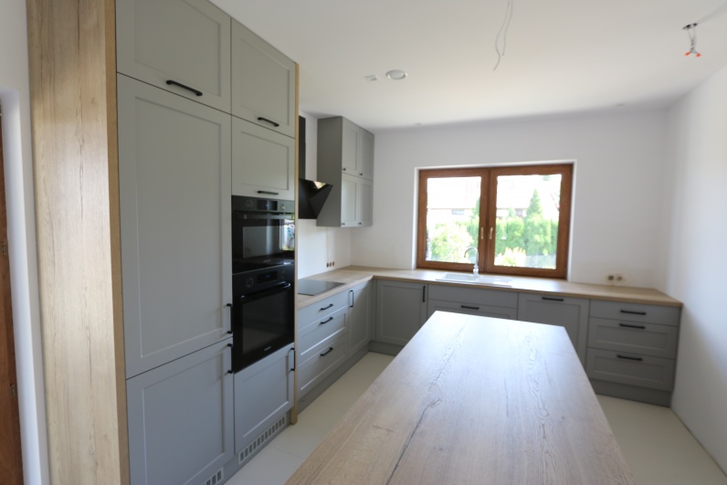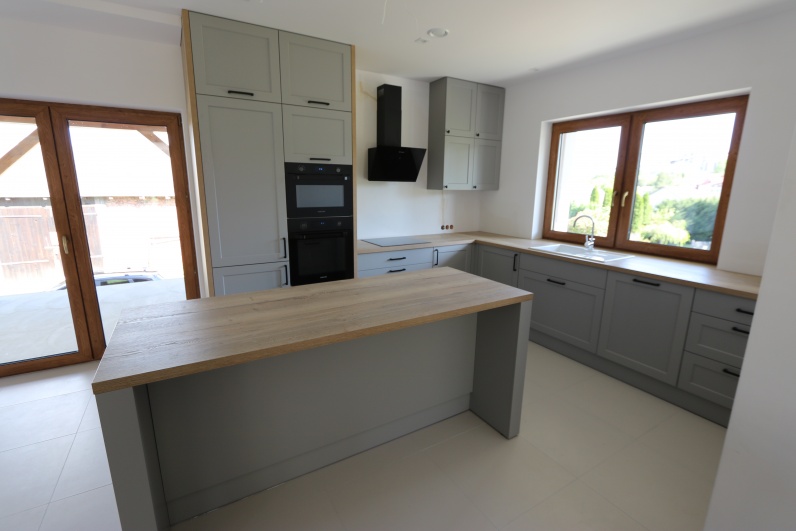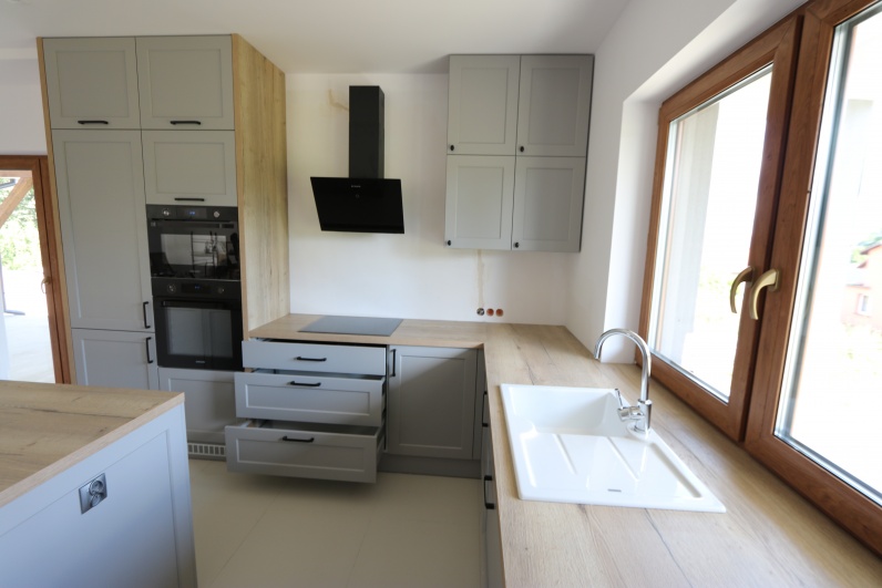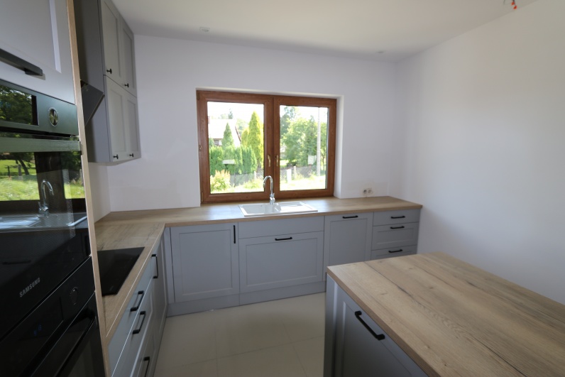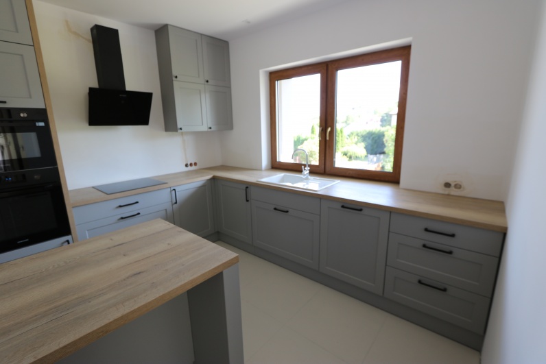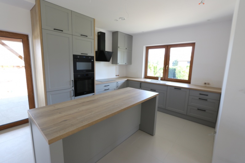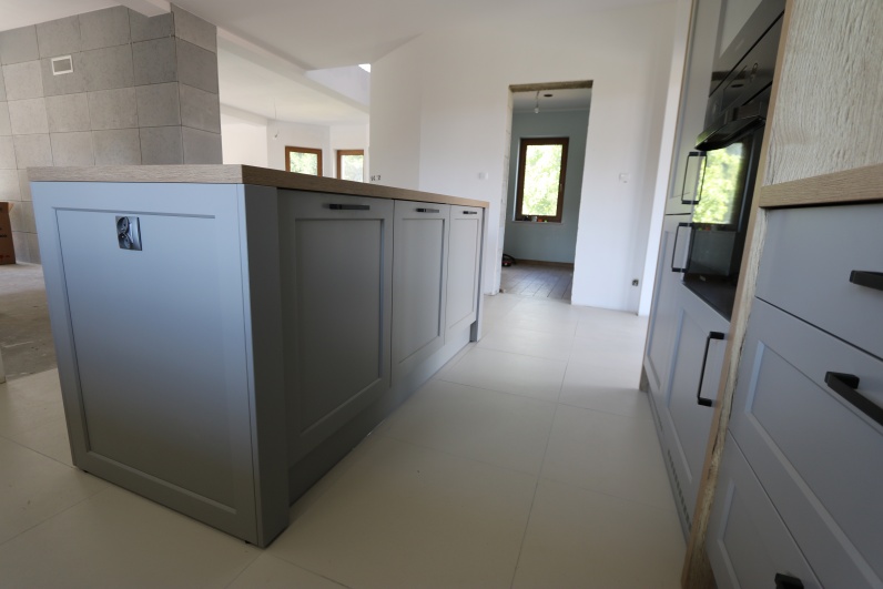 Meble kuchenne z frontami ramowo płycinowymi. Blat postformingowy.