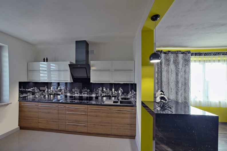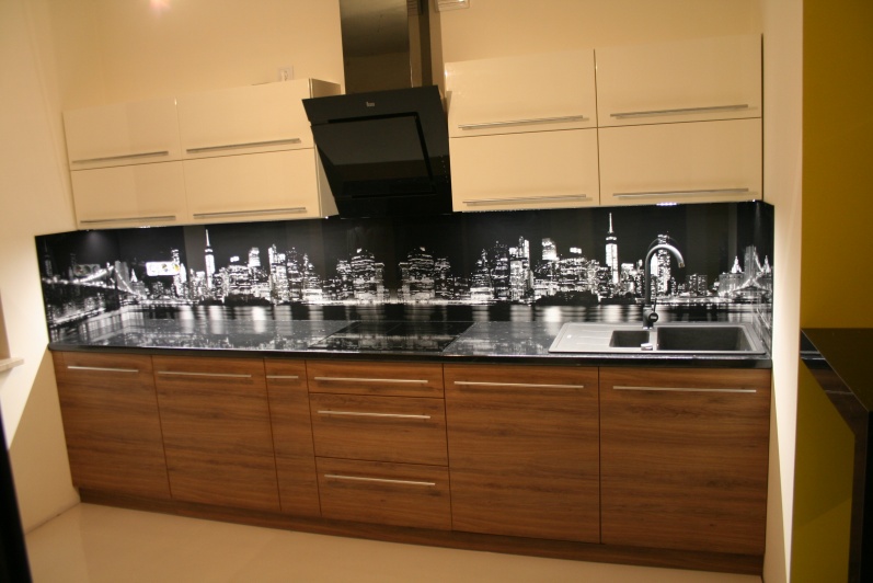 Meble kuchenne wykonane z płyty meblowej w kolorze Dąb Dziki Tabac w połączeniu z lakierem w kolorze białym. Zastosowano tutaj oświetlenie podszafkowe jak i również grafikę na szkle zamiast tradycyjnych płytek.