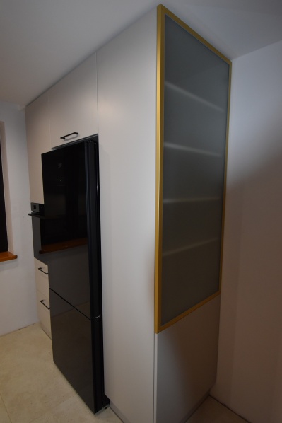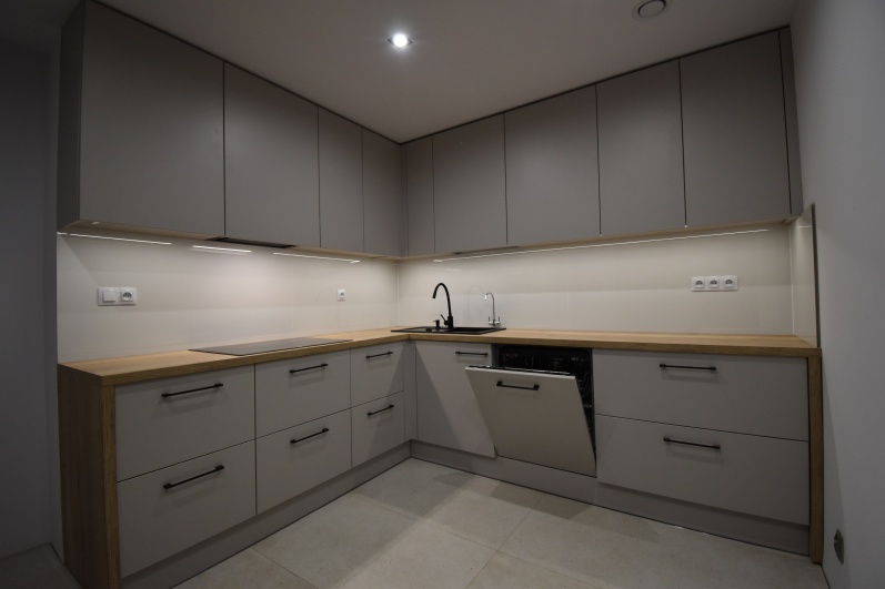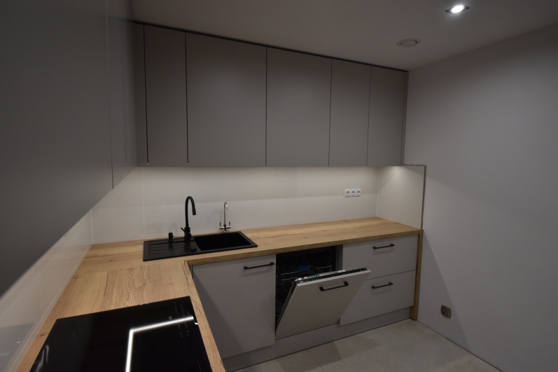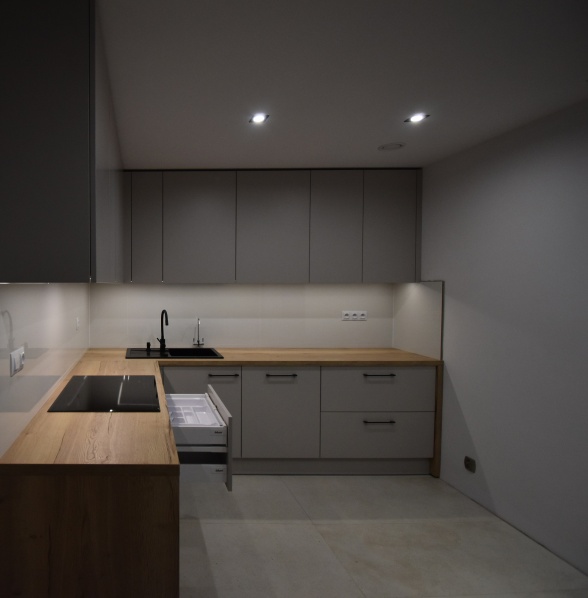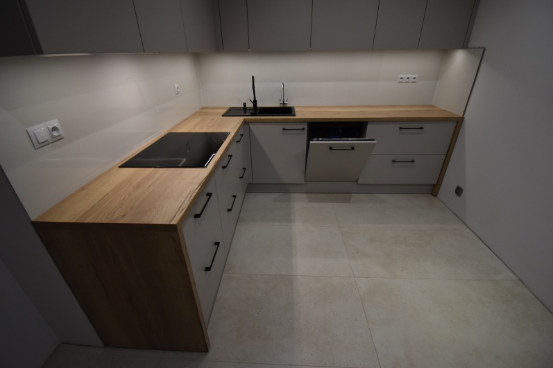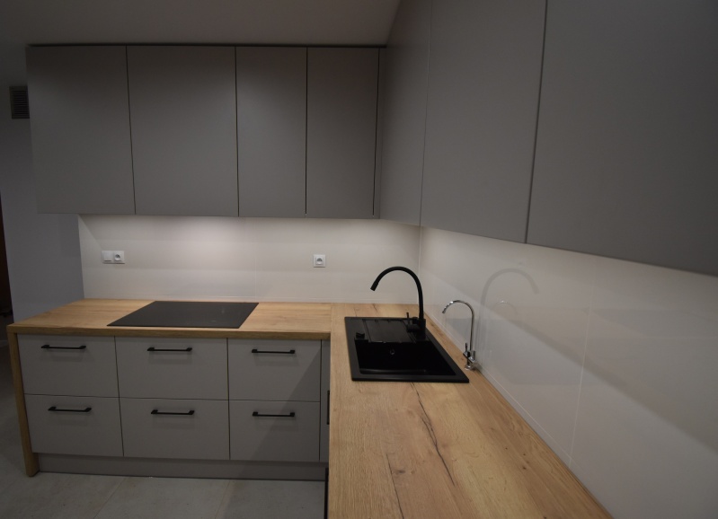Meble kuchenne z frontami w lakierze, koprusy - płyta Egger Kaszmir, blat Egger Dab Halifax Naturalny.