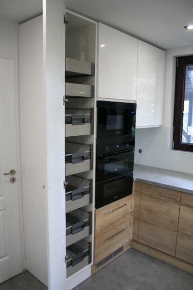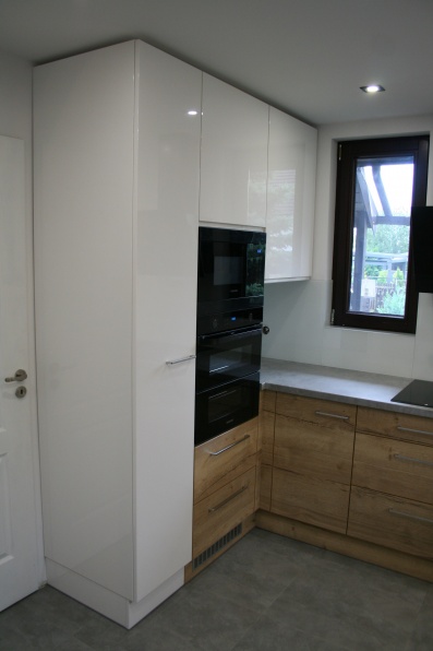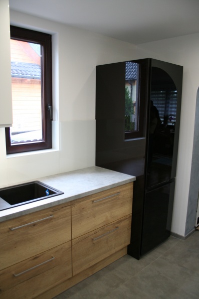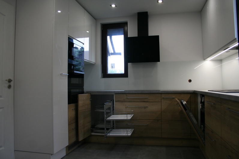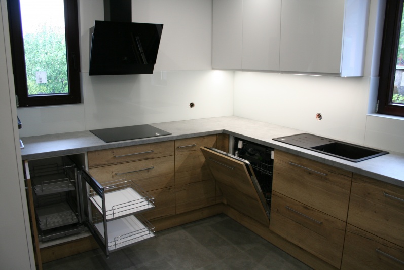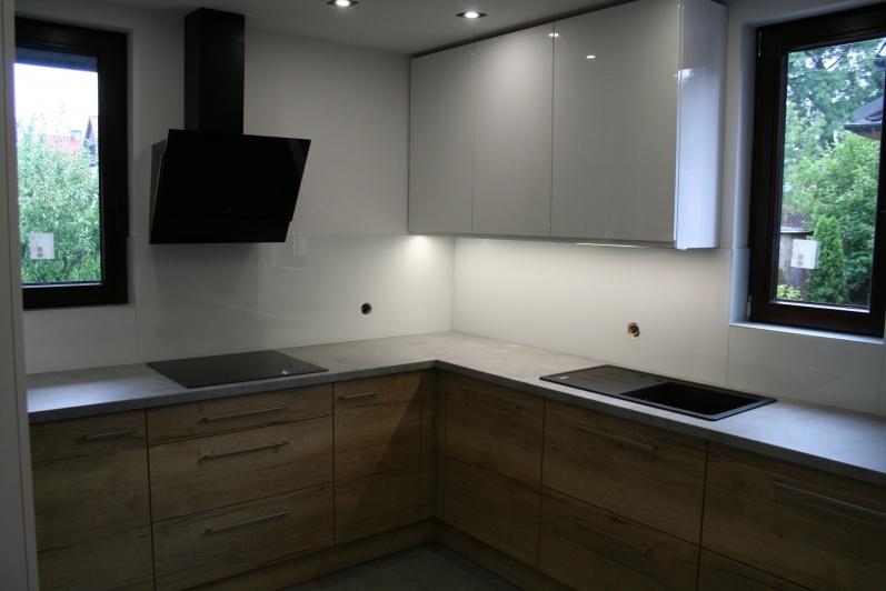 Meble kuchenne - fronty górne - lakier biały w połysku, szafki dolne - płyta meblowa Biel Alpejska, blat kuchenny postformingowy Egger Beton Chicago Jasny. Na ścianie szkło białe hartowane.