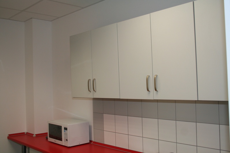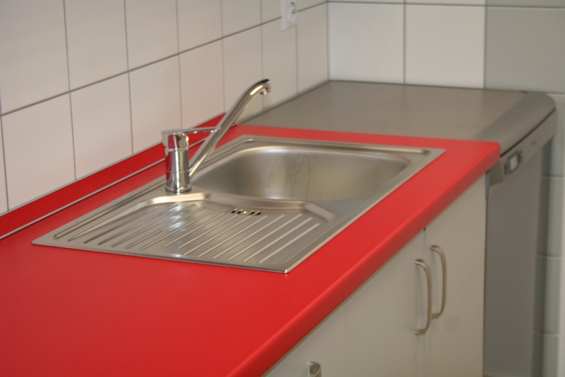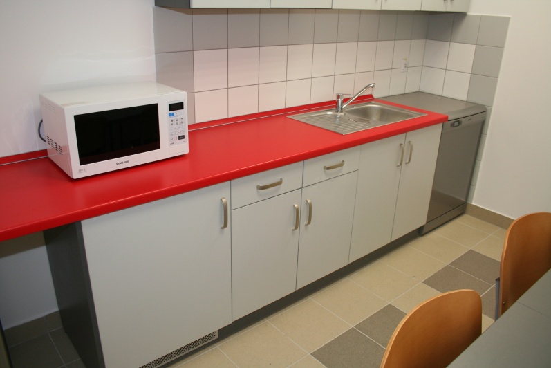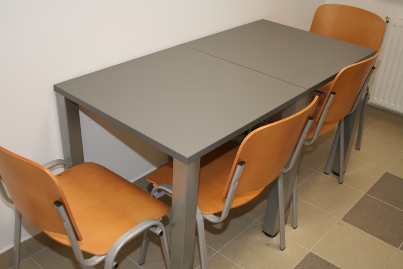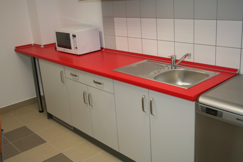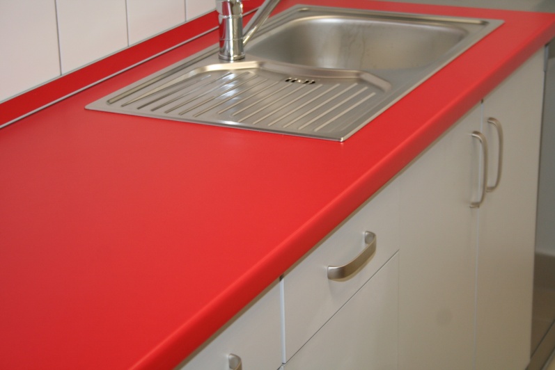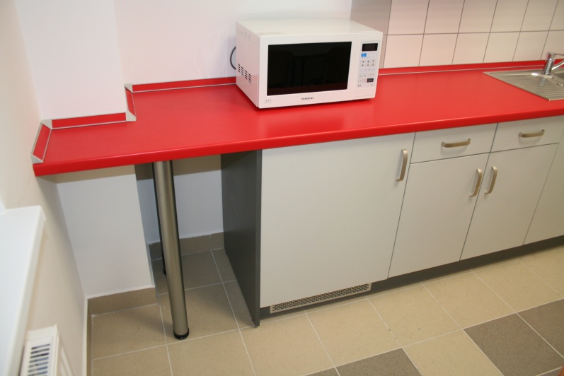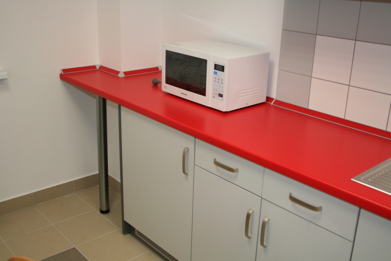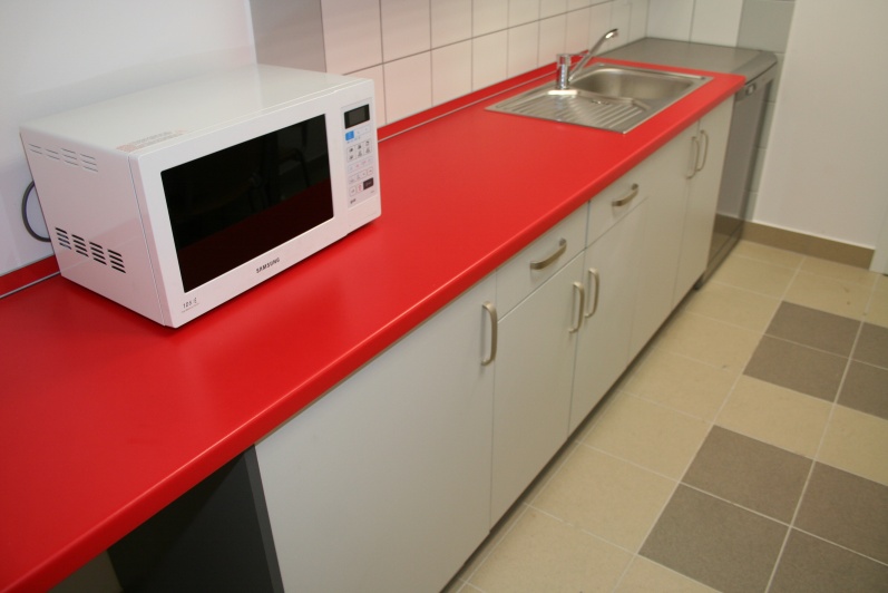 Prosty aneks kuchenny wykonany z płyty meblowej Pfleiderer w kolorze Szary U 2101. Blat - Jarzębina. W aneksie znajdują się niewielkie stoliki na nogach metalowych.